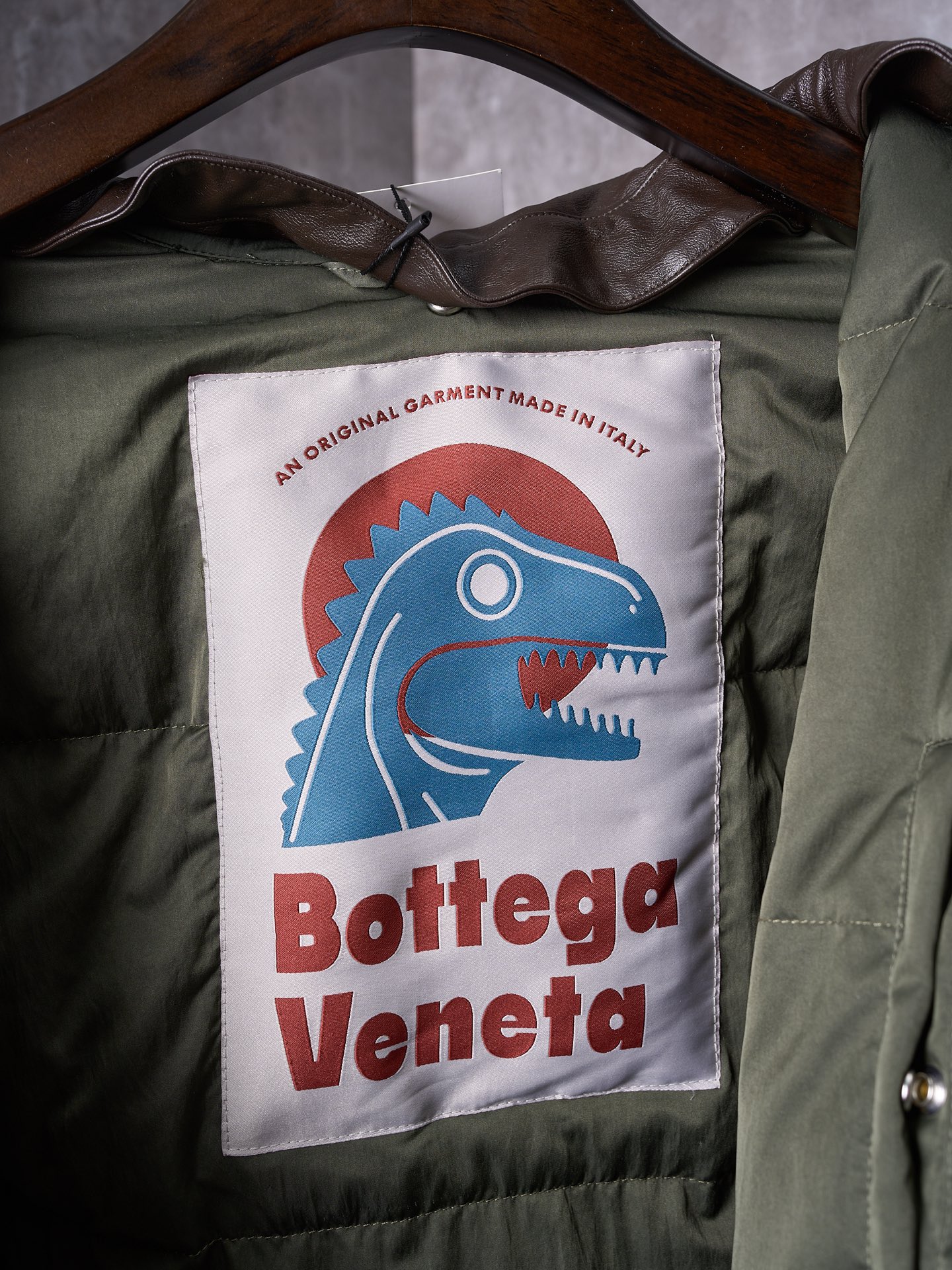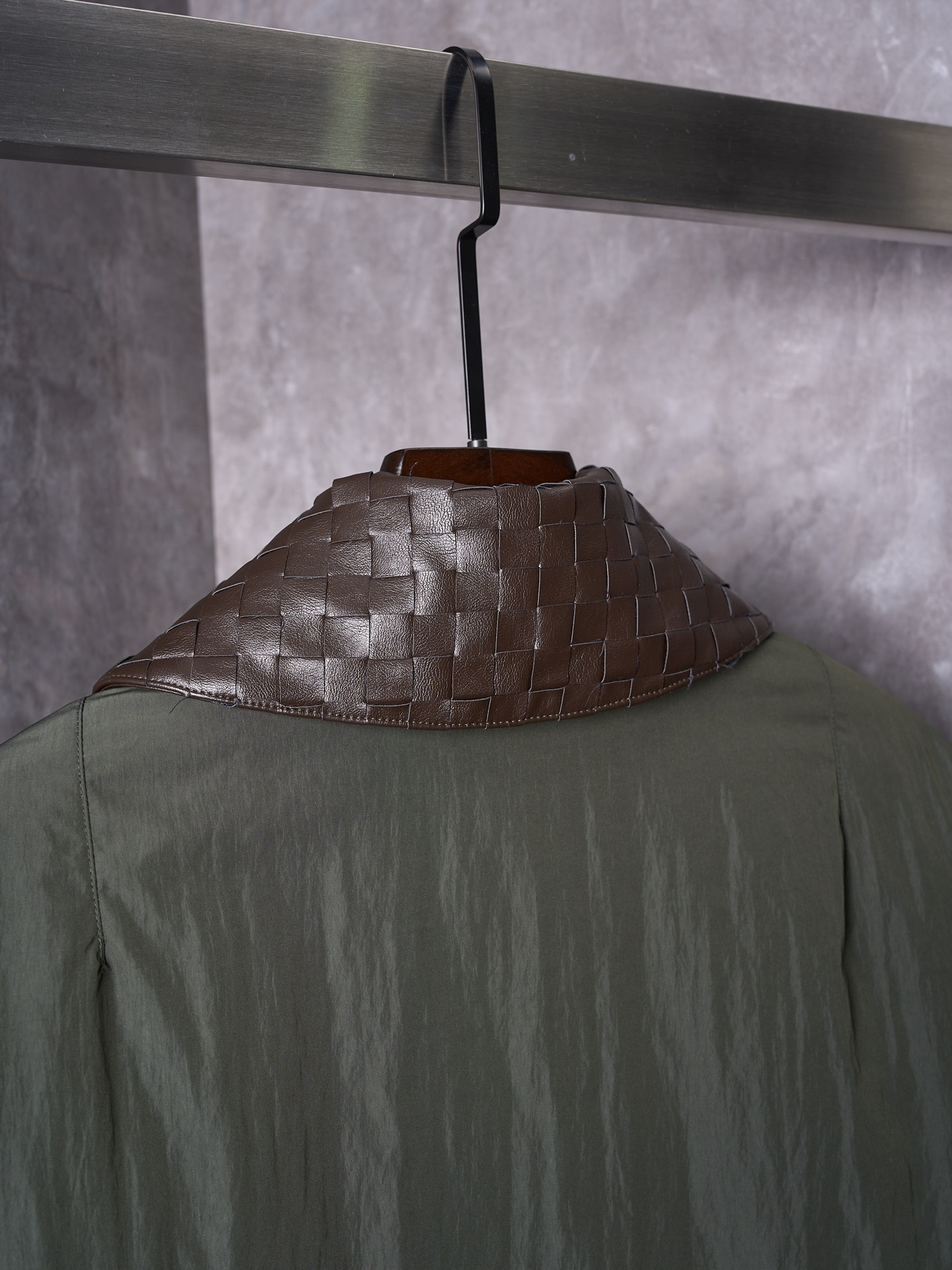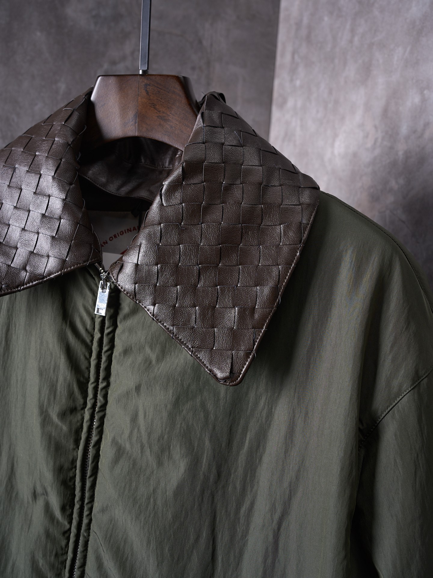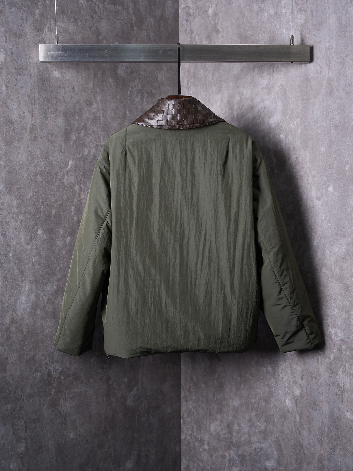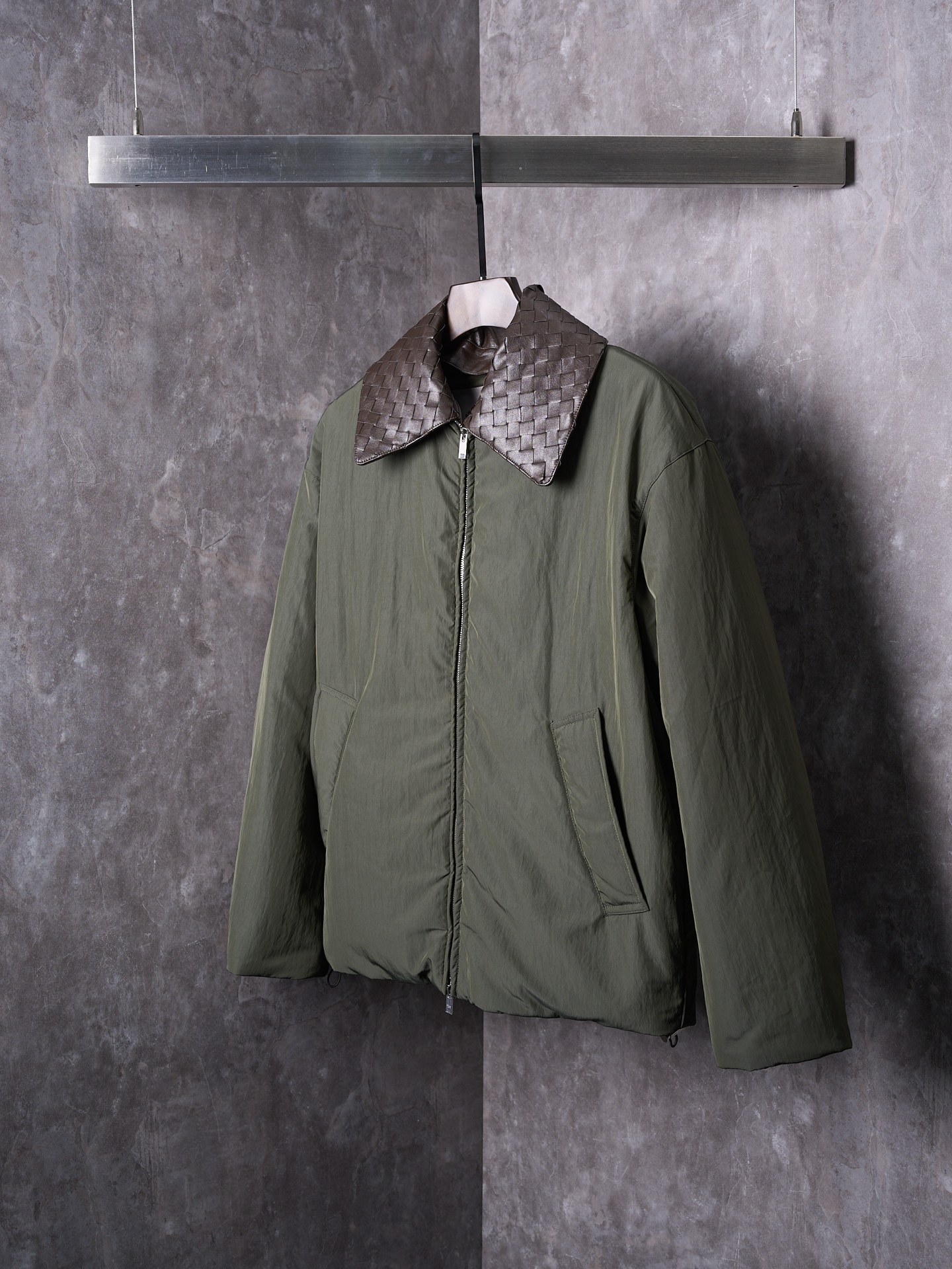 Tags: Bottega Veneta Down Jacket, Detachable Leather Collar Jacket, Nylon Down Jacket Olive, Woven Leather Jacket