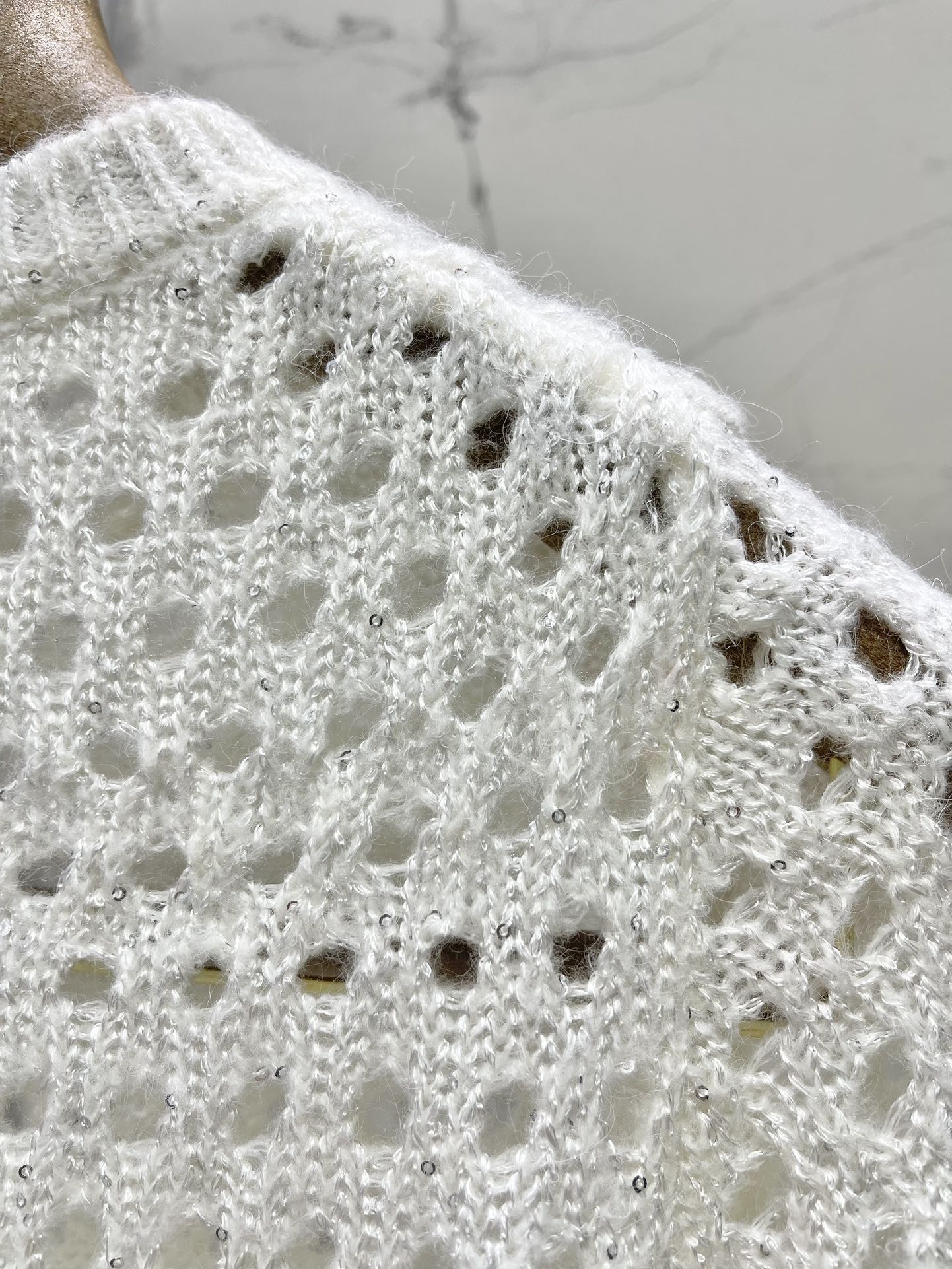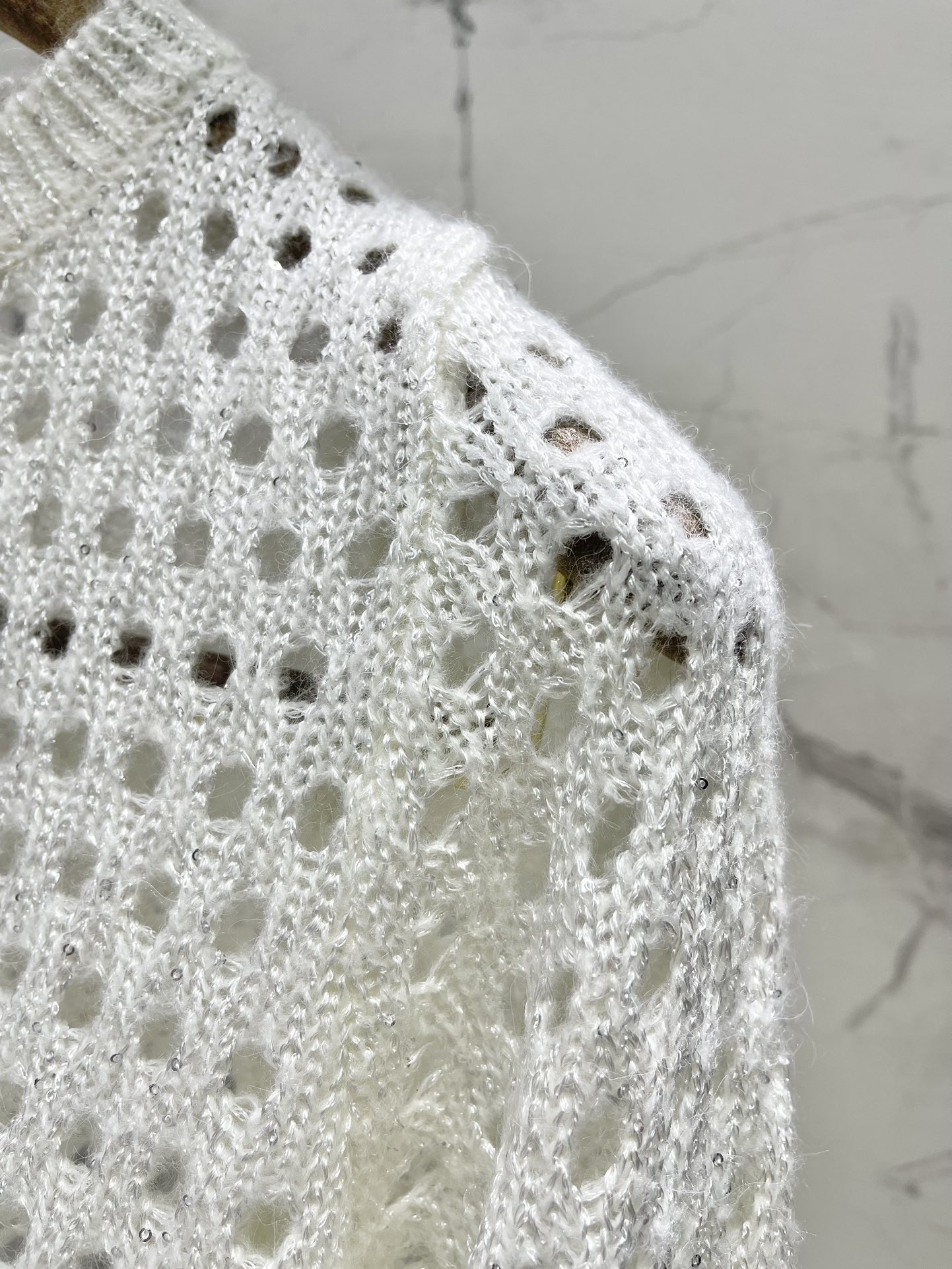 Tags: Brunello Cucinelli Knit Top, Designer Knitwear, Elegant Knit Top, Round Neck Knitwear, Silver Thread Sweater, Women's Knit Sweater