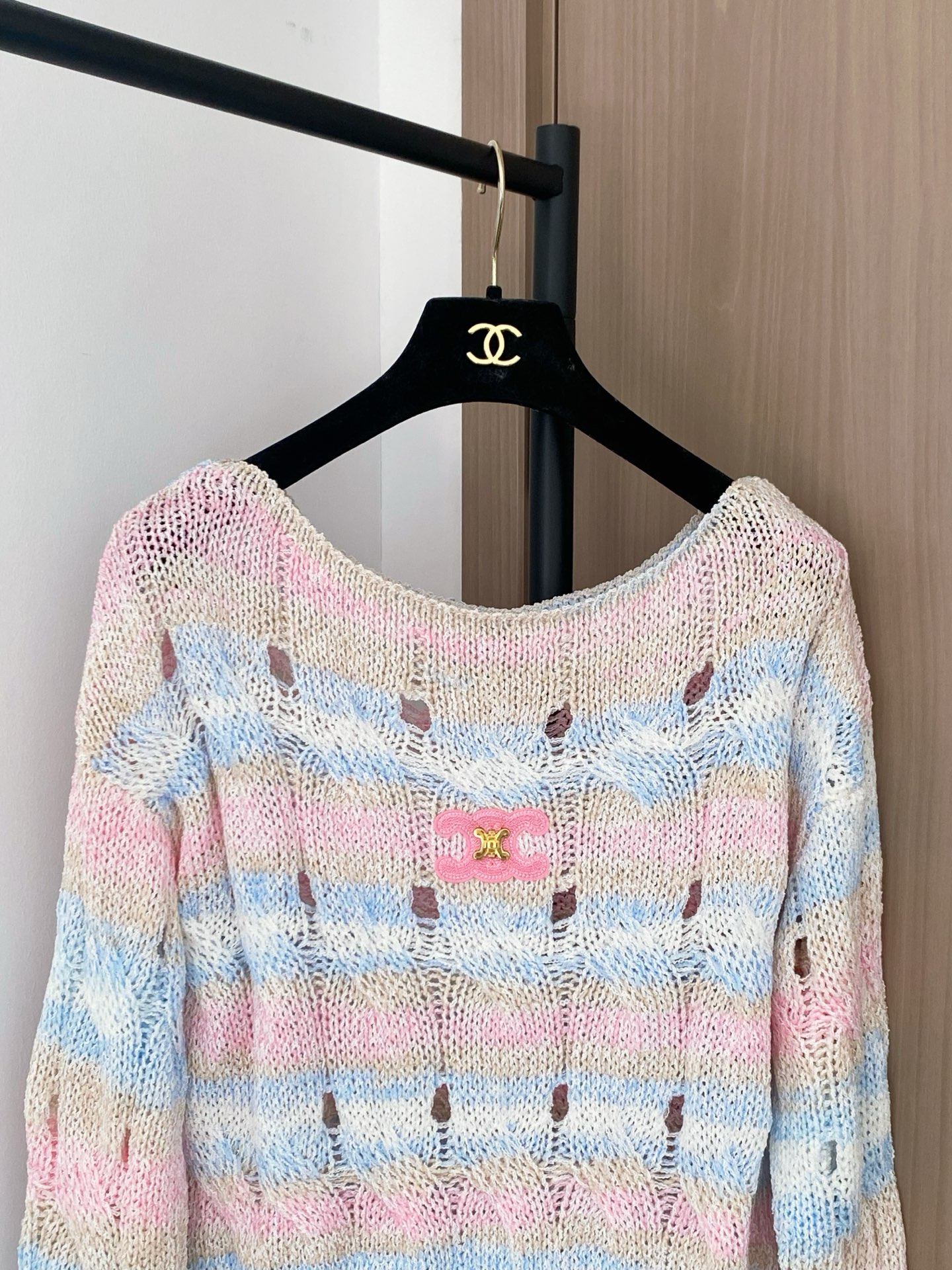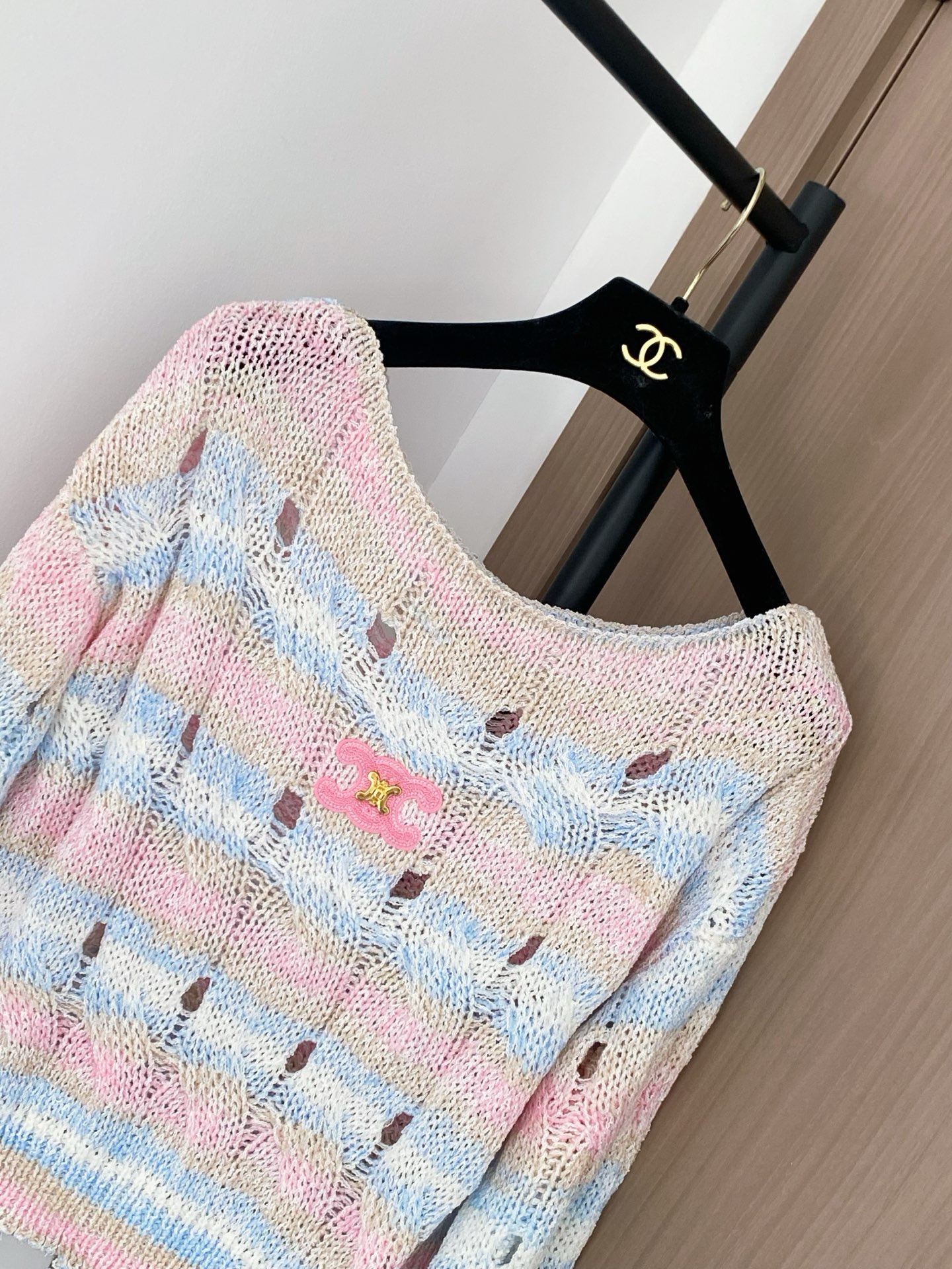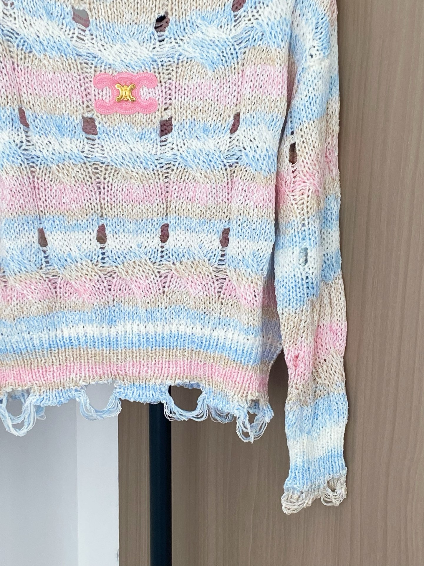 Tags: Celine Knit Sweater, Designer Knitwear Women, Fashionable Knit Top, Logo Detail Sweater, Striped Long Sleeve Sweater