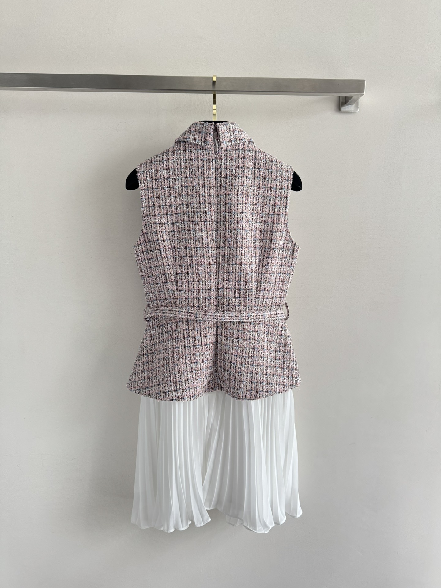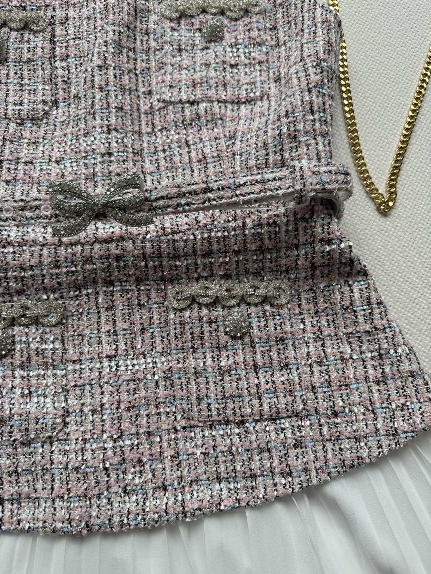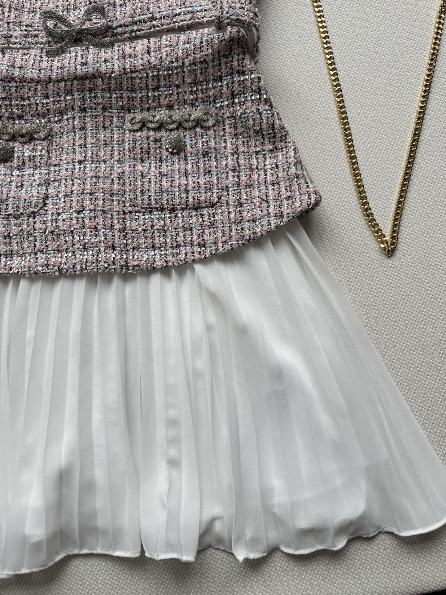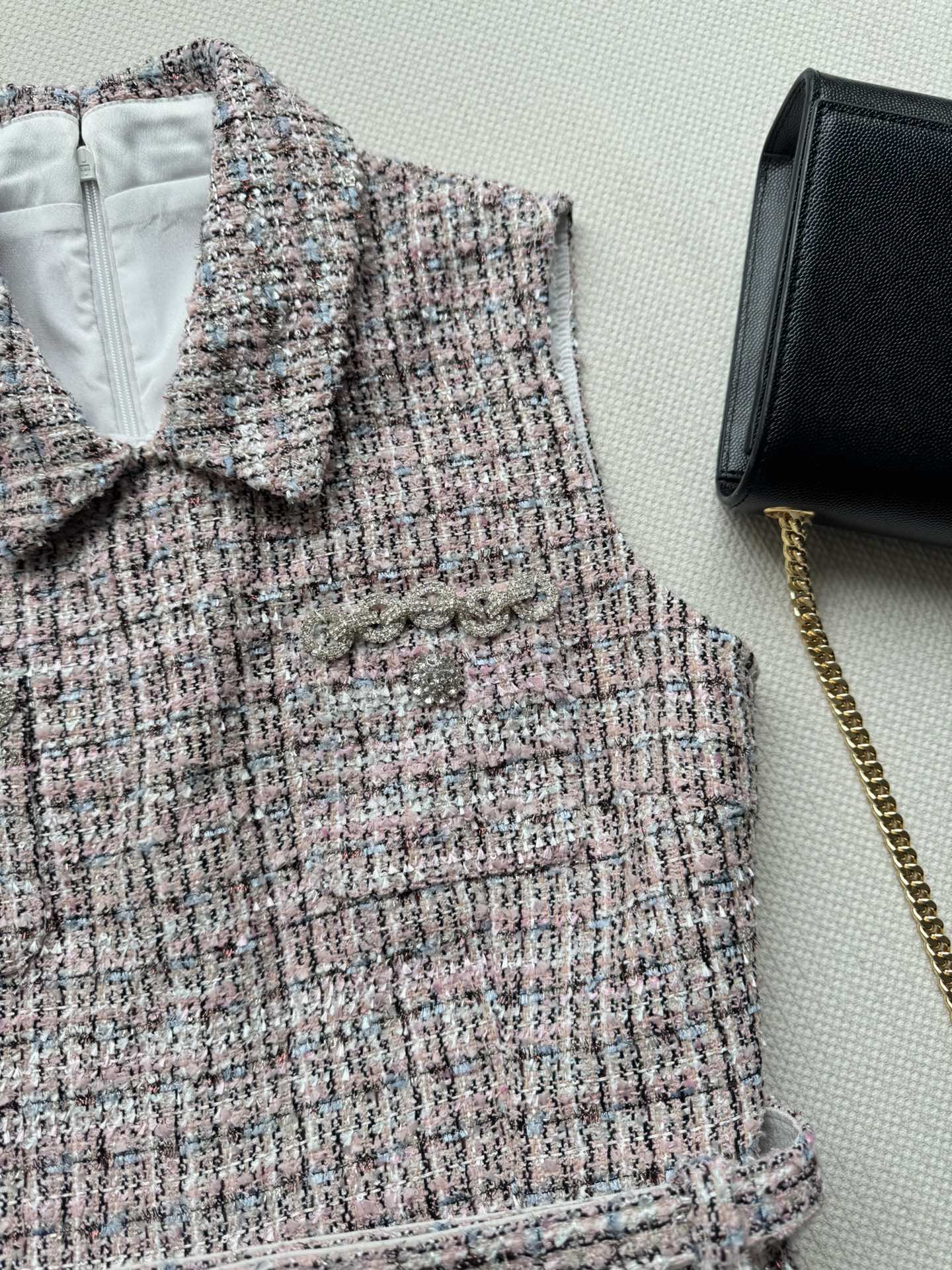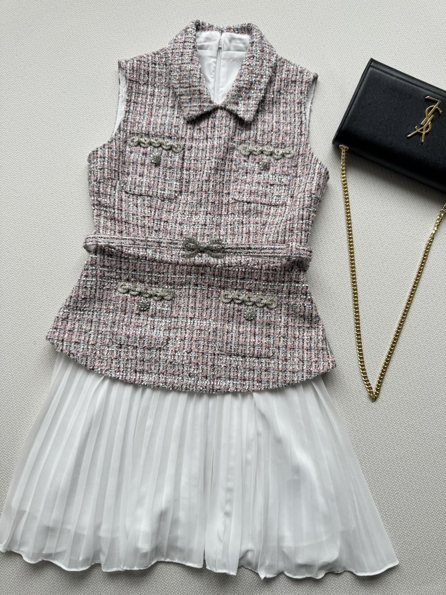 Chanel Inspired Tweed Vest Dress with Crystal Embellishments and Pleated Skirt