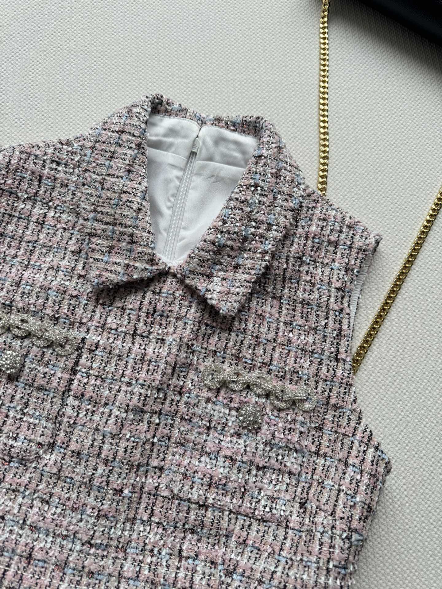 This Chanel-inspired tweed vest dress is a masterpiece of design, blending classic elegance with modern sophistication.