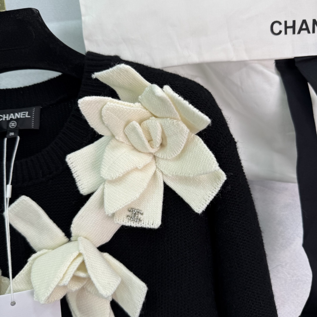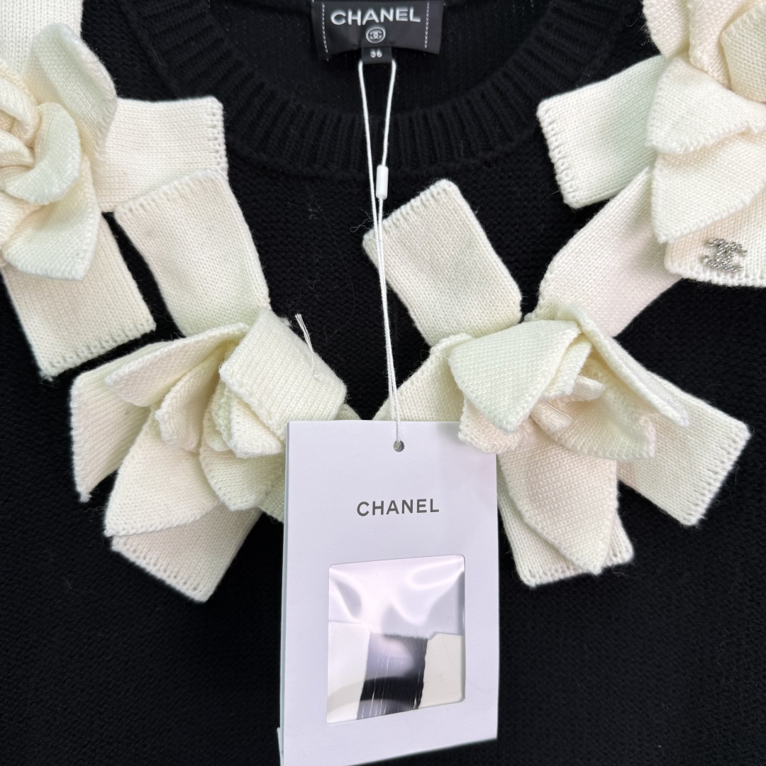 Chanel Women's Black Knit Dress with Floral Appliqués and Diamond Logo