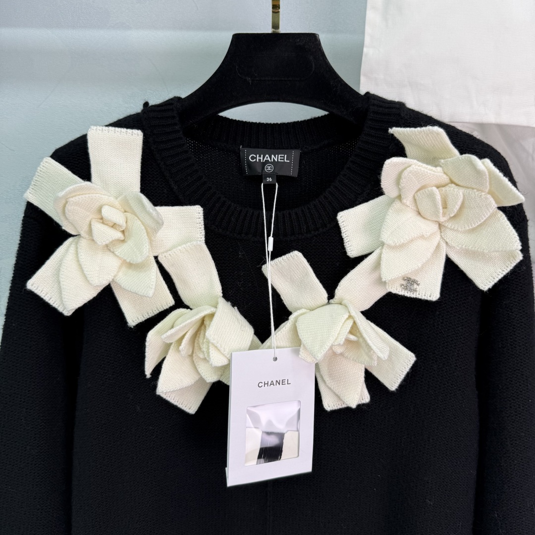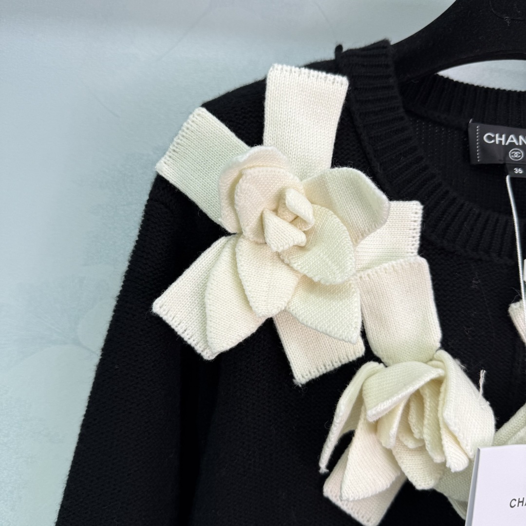 Elegant black knit dress featuring 3D floral appliqués, a subtle diamond logo, and a timeless design. Perfect for adding a touch of sophistication to any occasion.