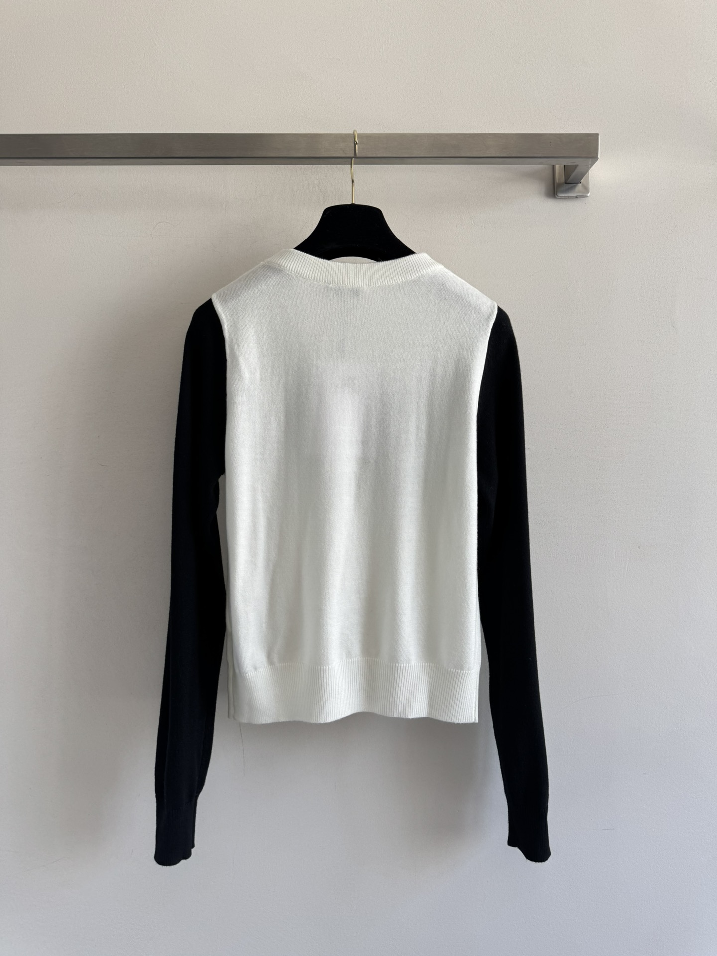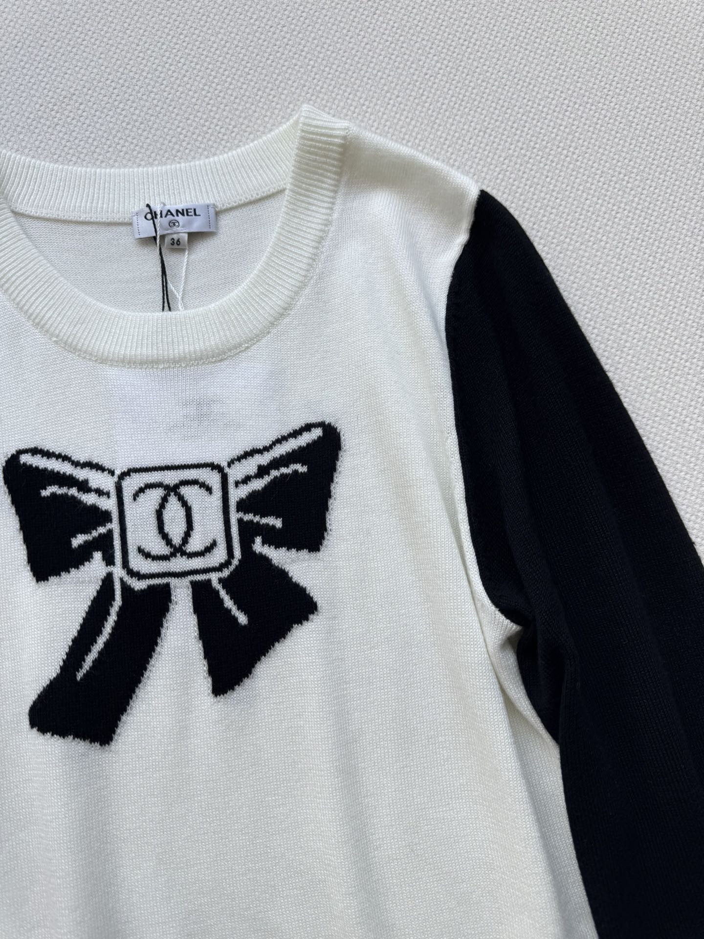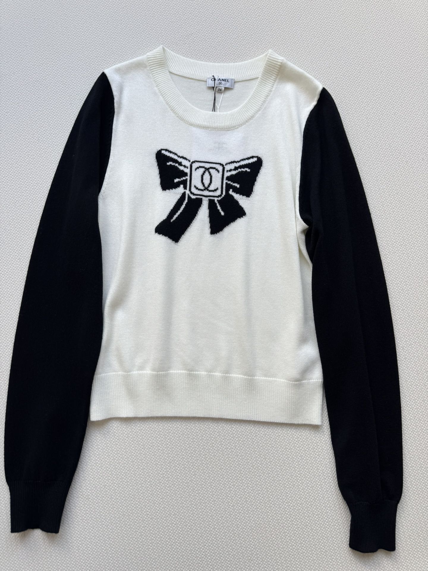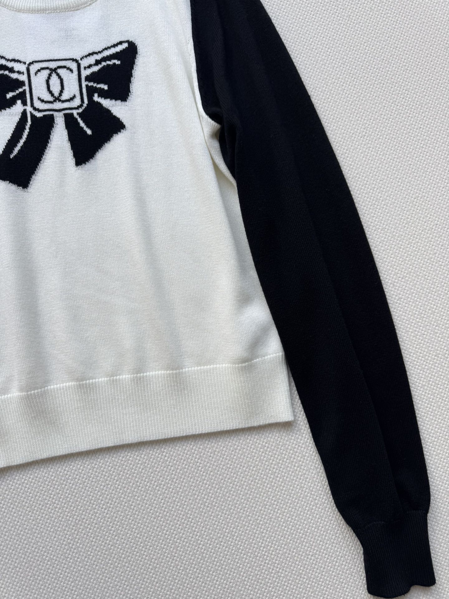 Chanel Women's Bow Print Knitted Sweater, Round Neck, Long Sleeve, Wool Blend