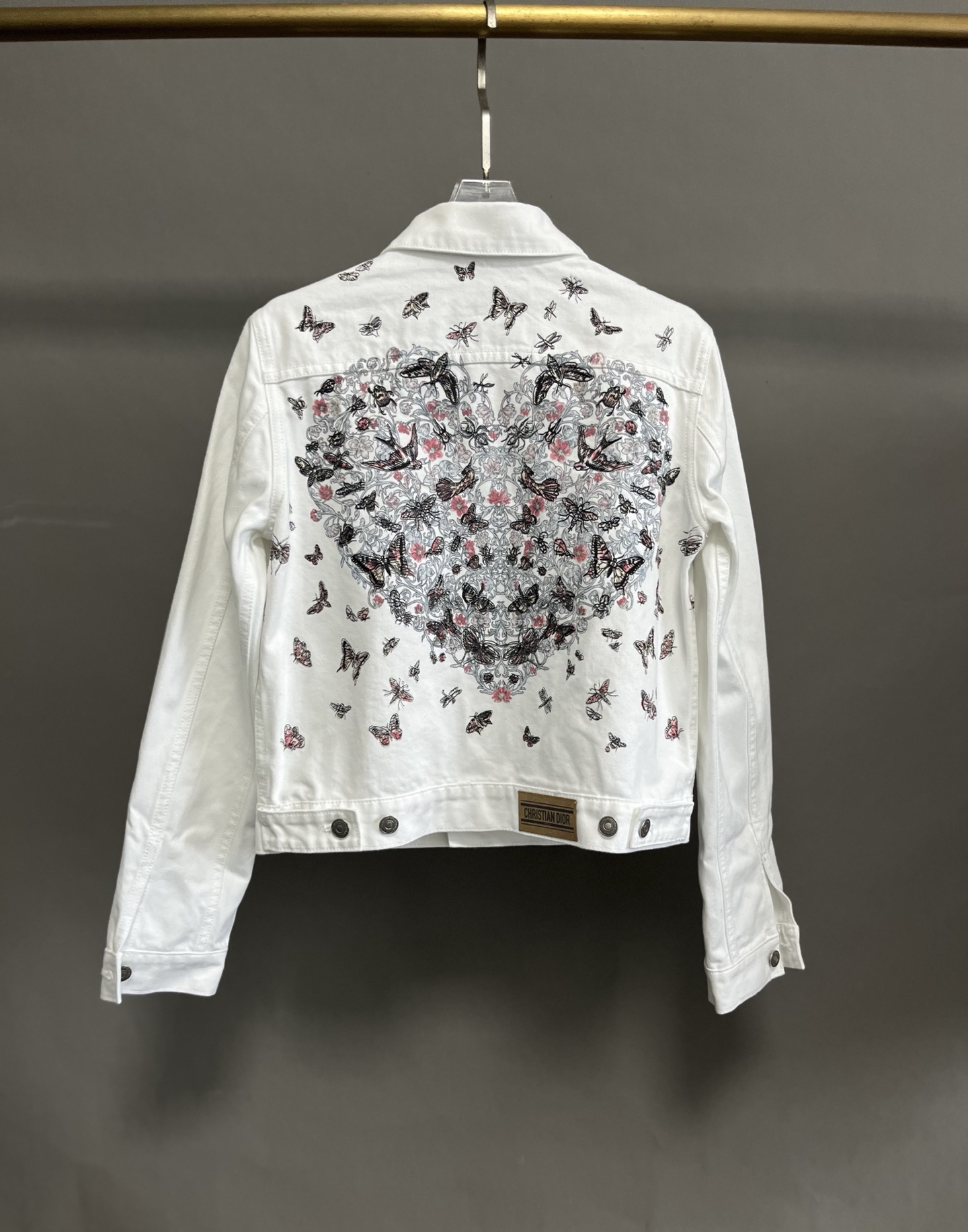Elevate your style with this Christian Dior white denim jacket featuring butterfly embroidery and the iconic CD logo. A timeless piece for a chic, modern look.