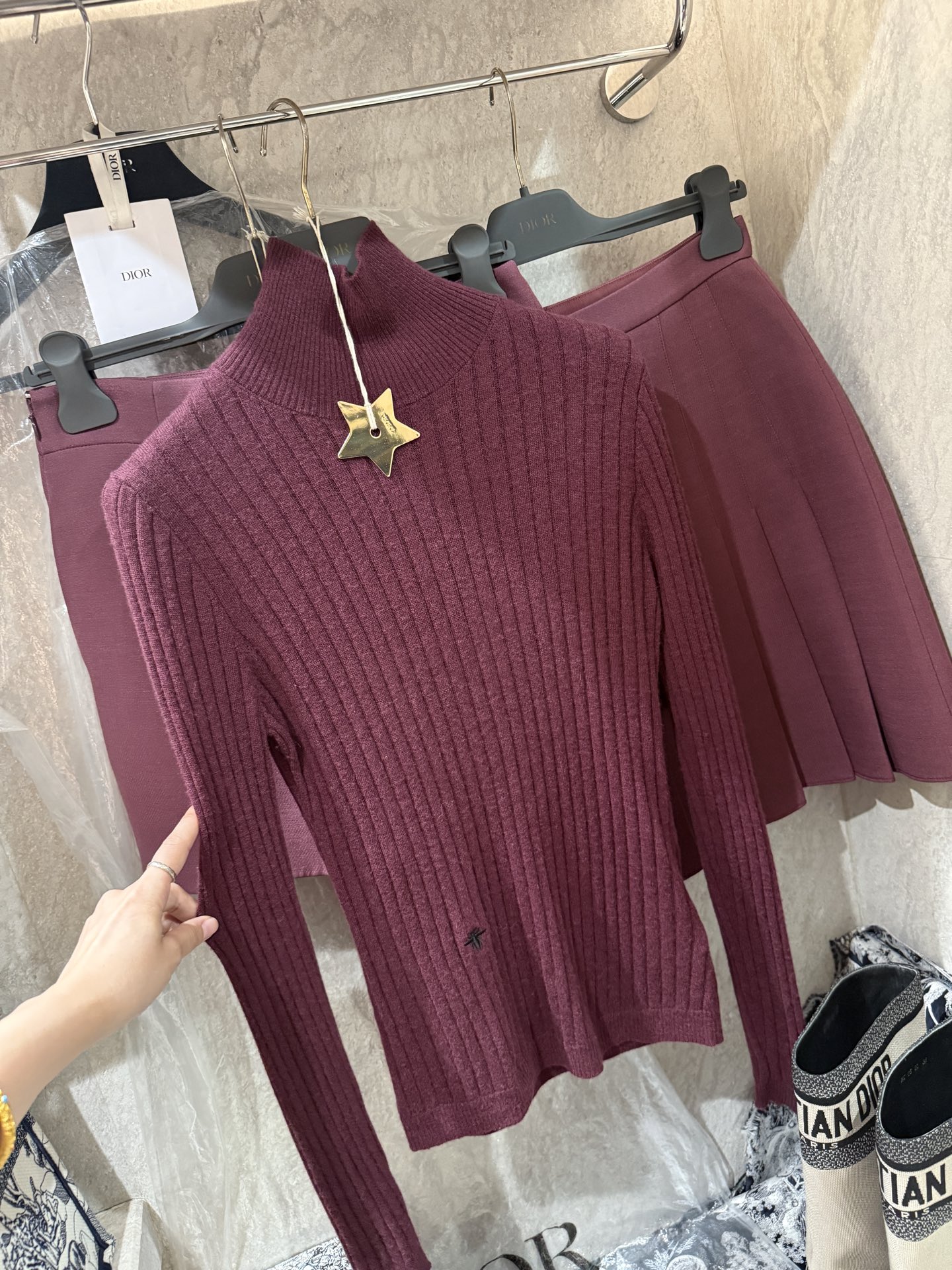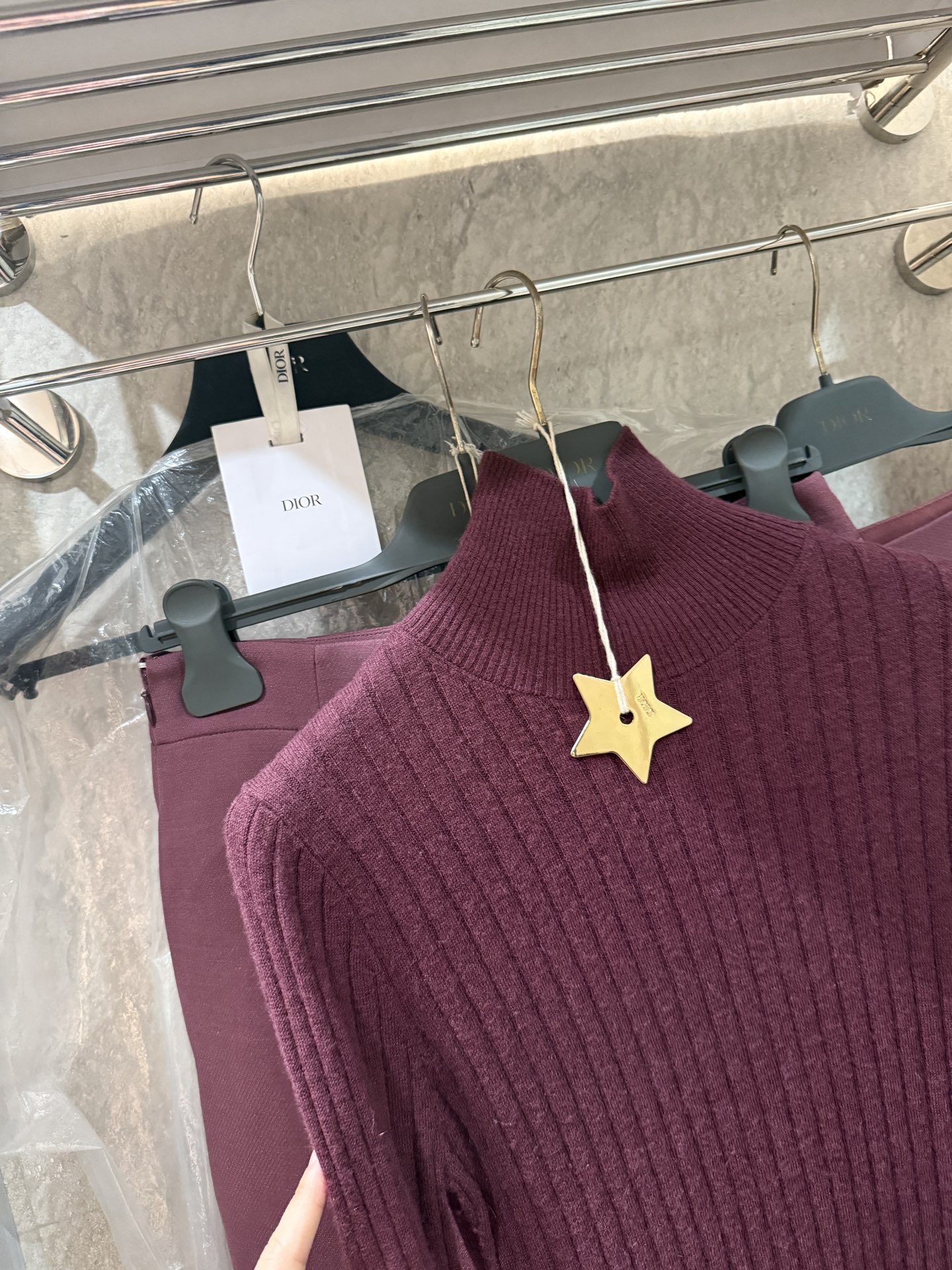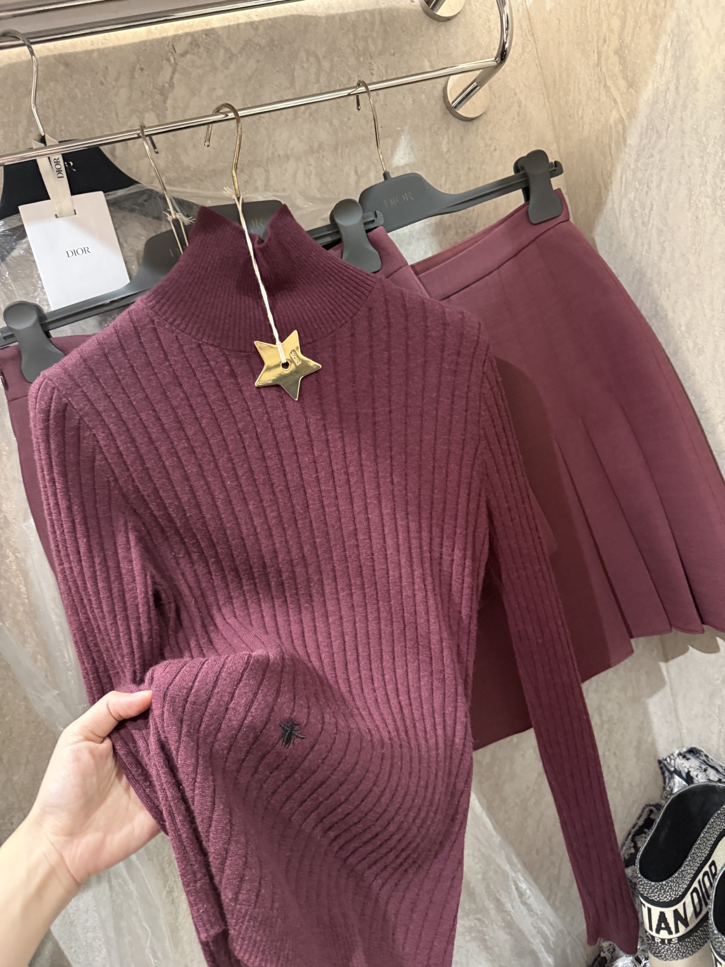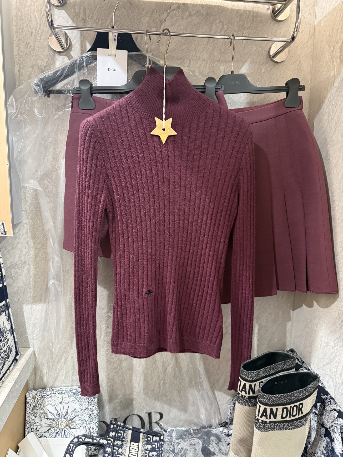 Elevate your wardrobe with this stylish Dior sweater and skirt set. Perfect for a chic, sophisticated look.