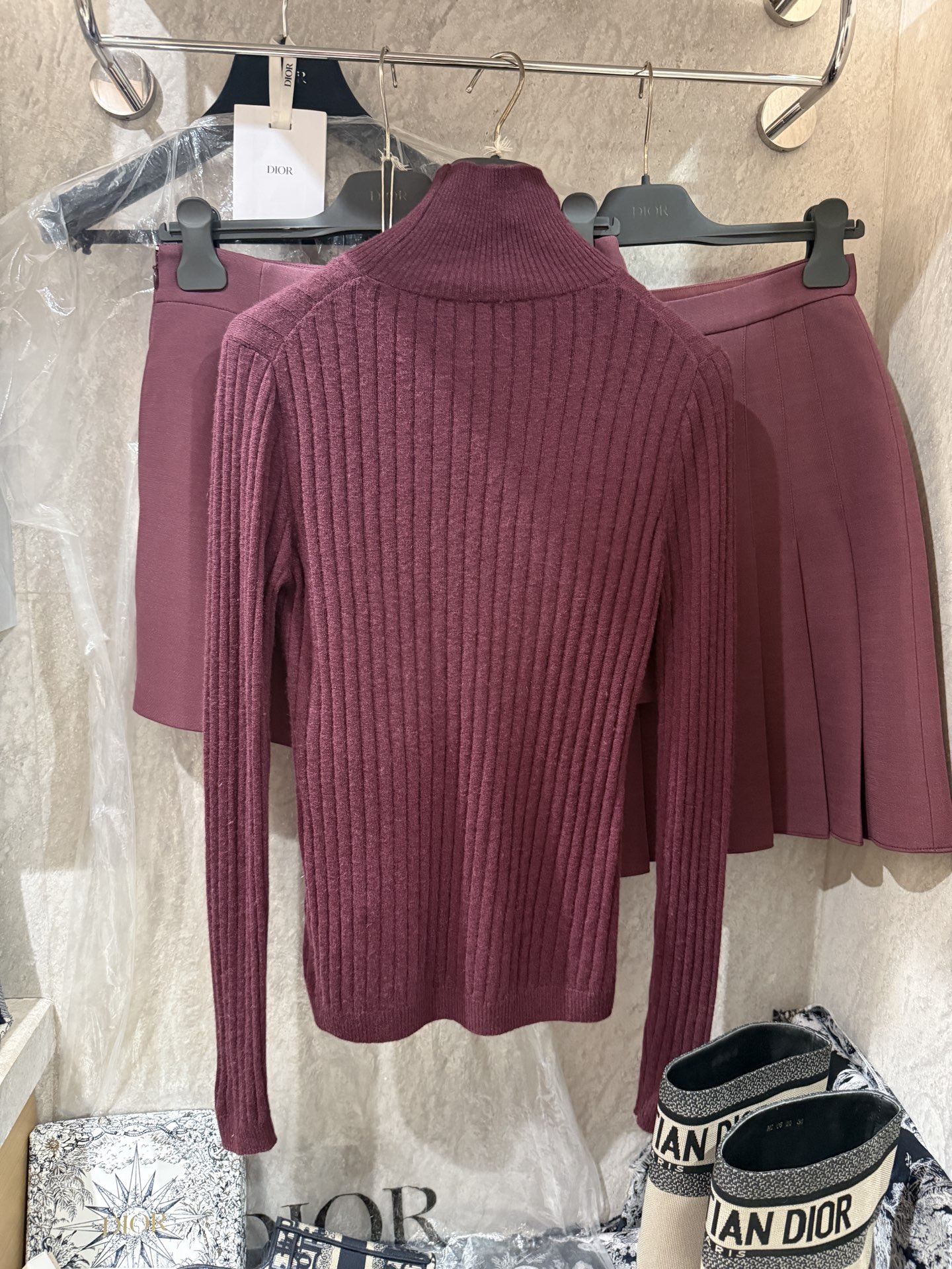 This Dior sweater and skirt set is a stylish and sophisticated addition to any wardrobe. The berry-colored ribbed knit turtleneck sweater pairs perfectly with the matching skirt, creating a chic and coordinated look.