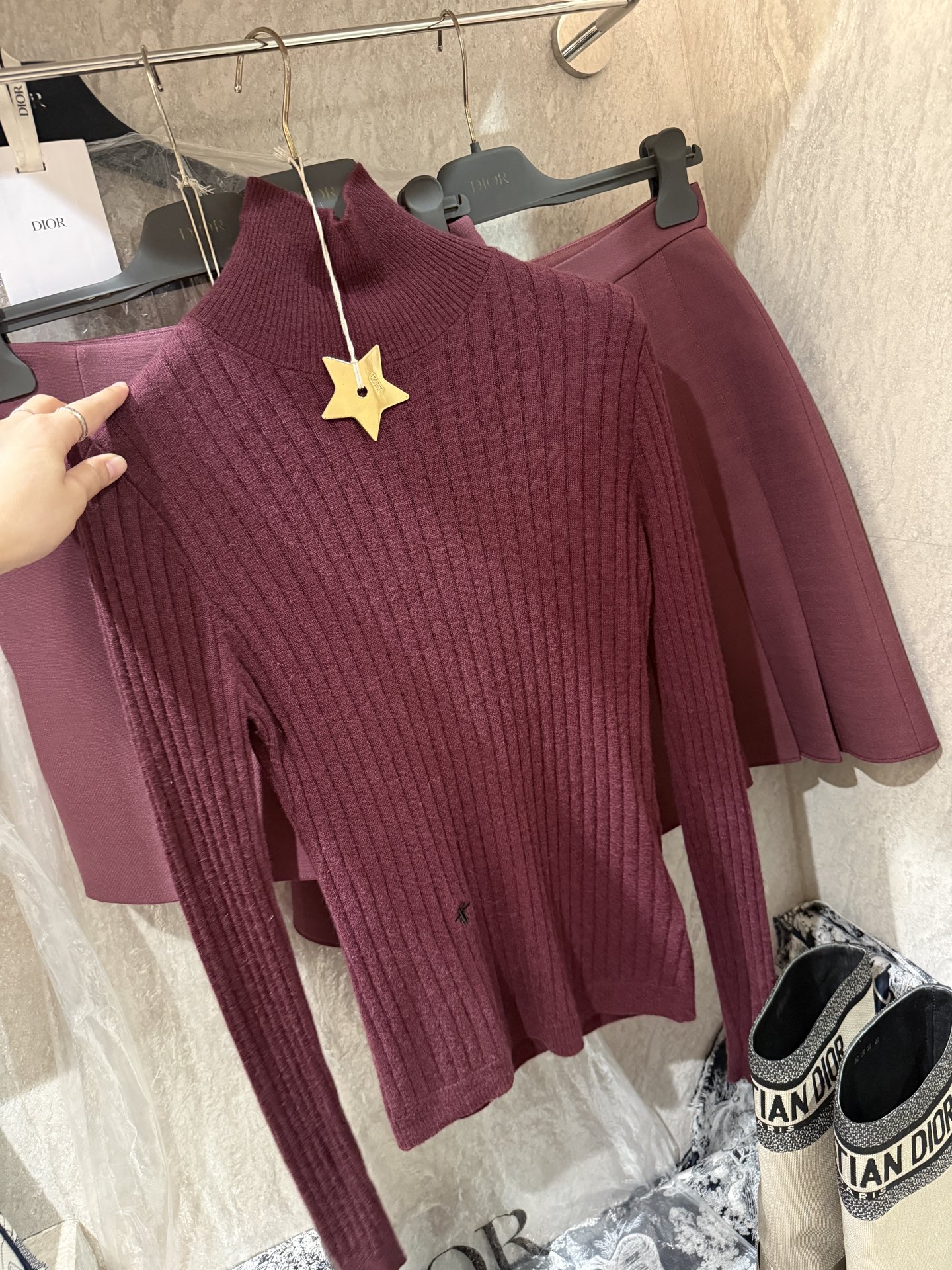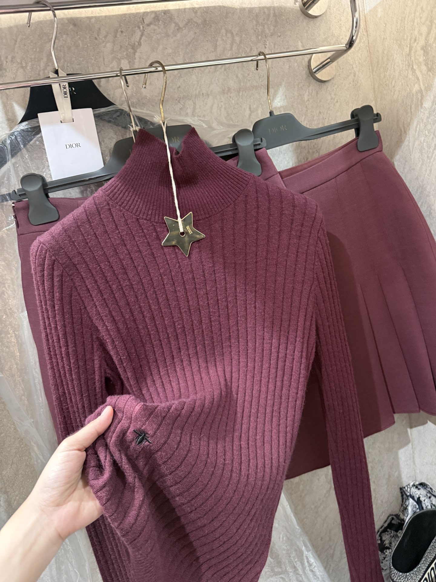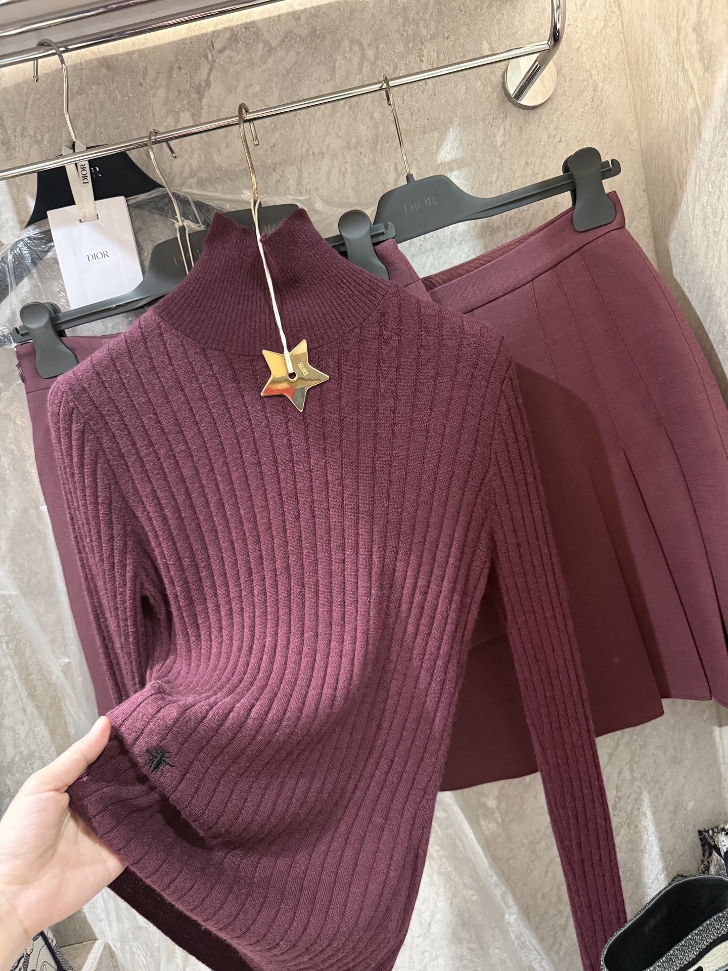 Tags: Berry Turtleneck Sweater, Dior Sweater And Skirt Set, High Fashion Outfit, Ribbed Skirt Set, Women's Knit Set