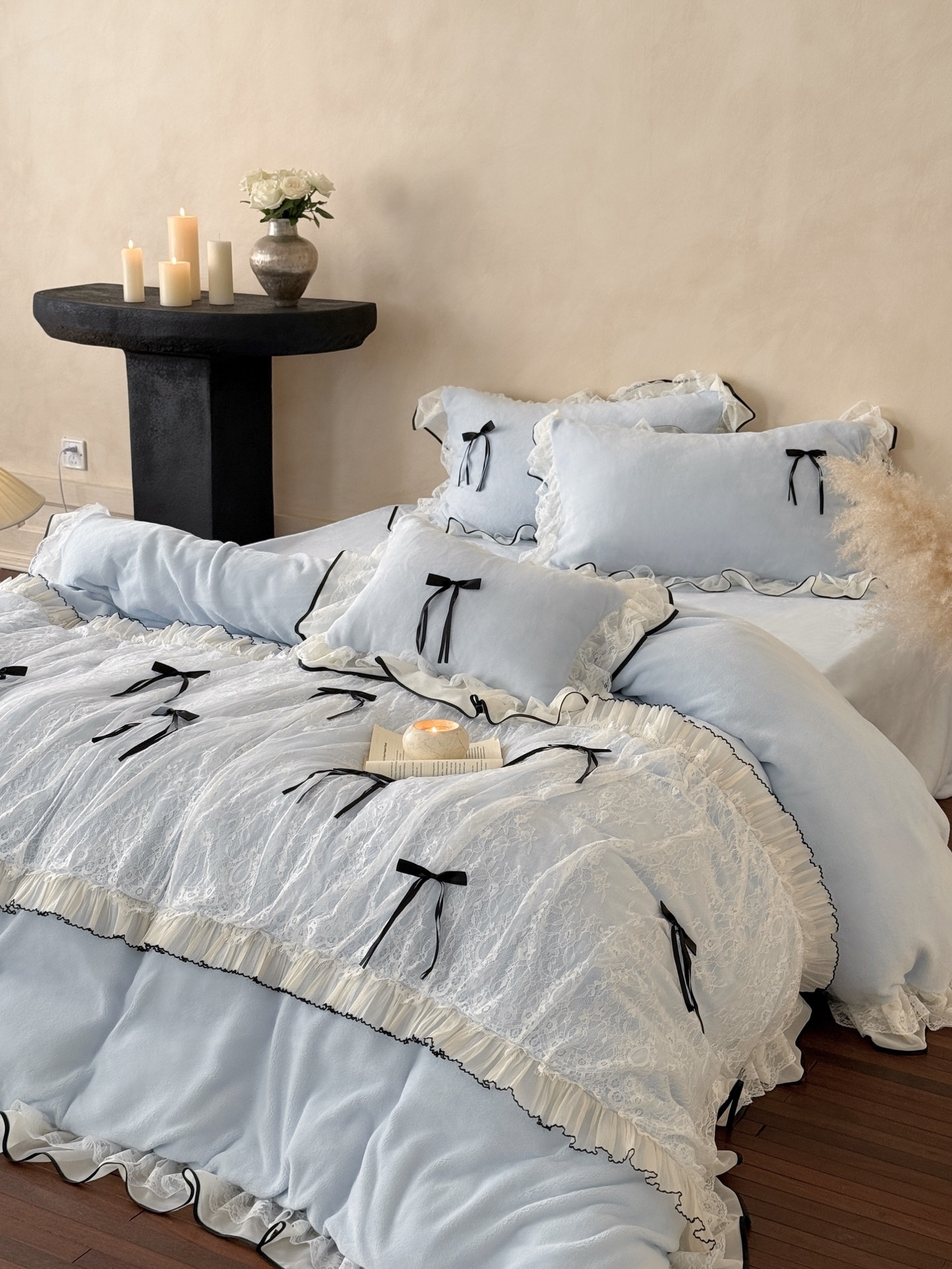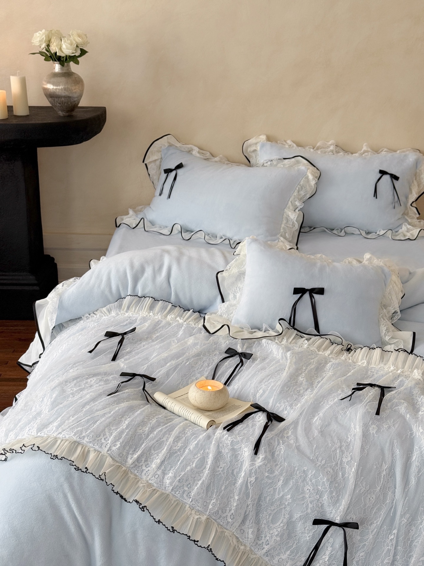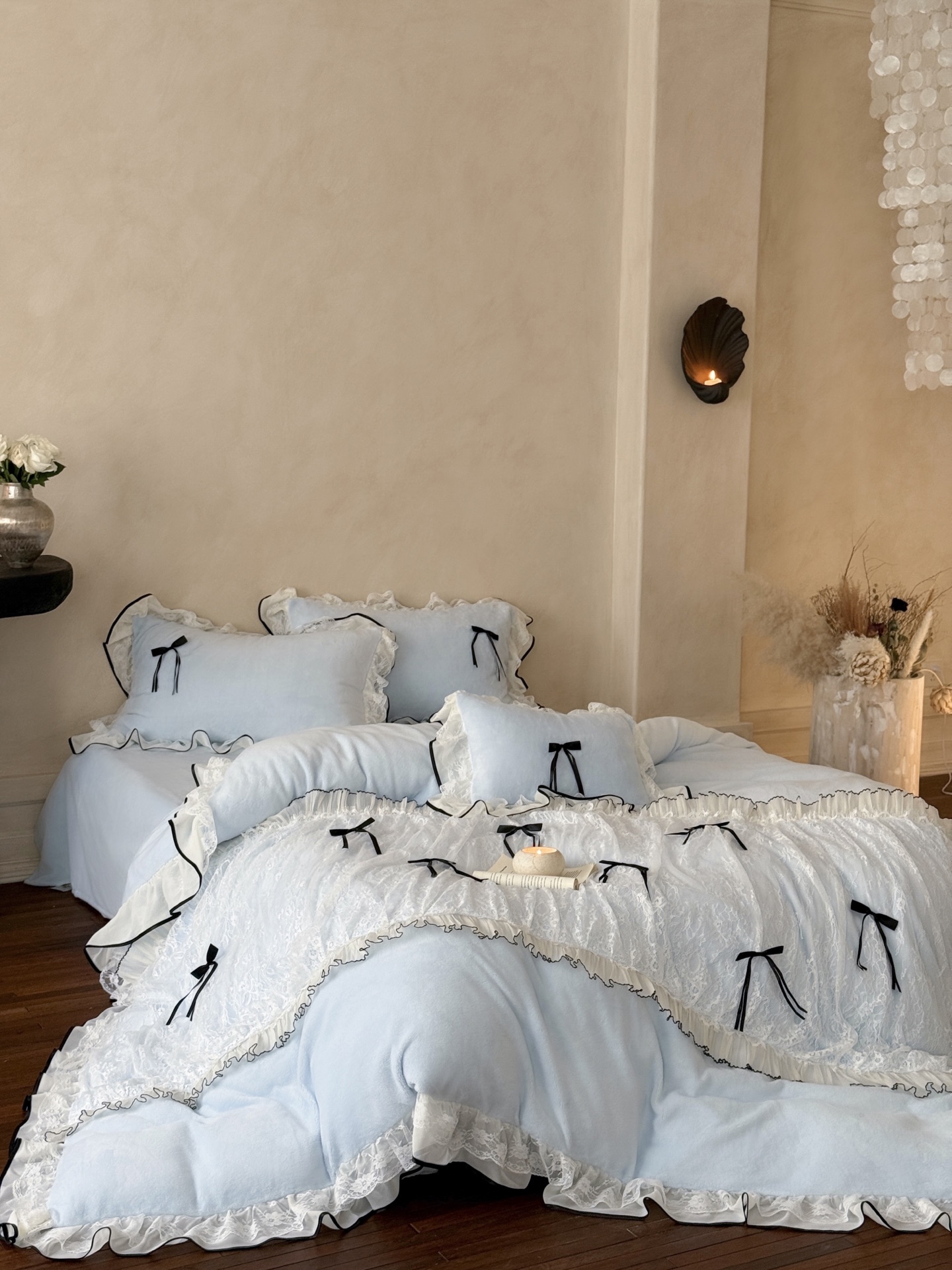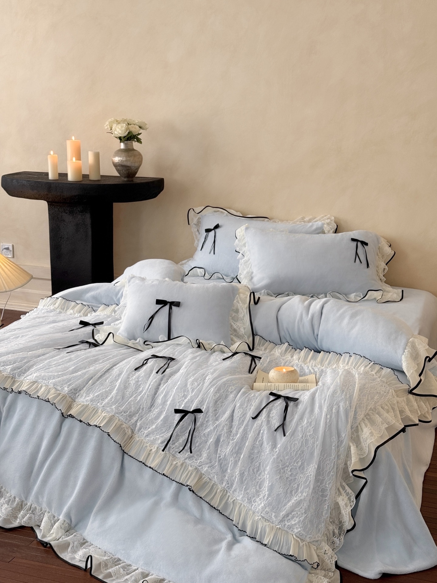 Tags: Blue Bedding Set, Bow Accent Bed Set, Lace Trim Bedding, Luxury Bedding, Milk Velvet Bedding Set, Soft Bedding Set