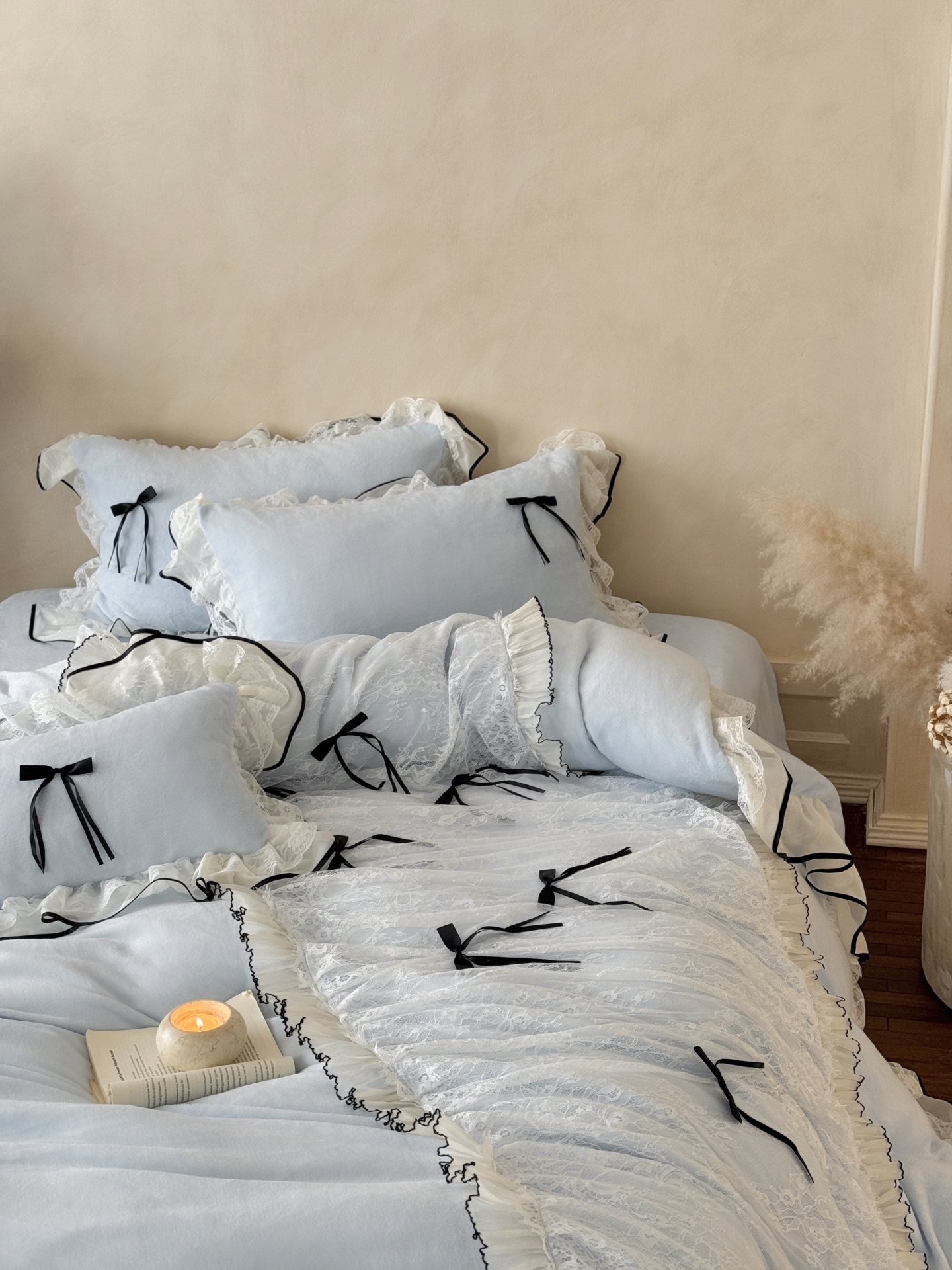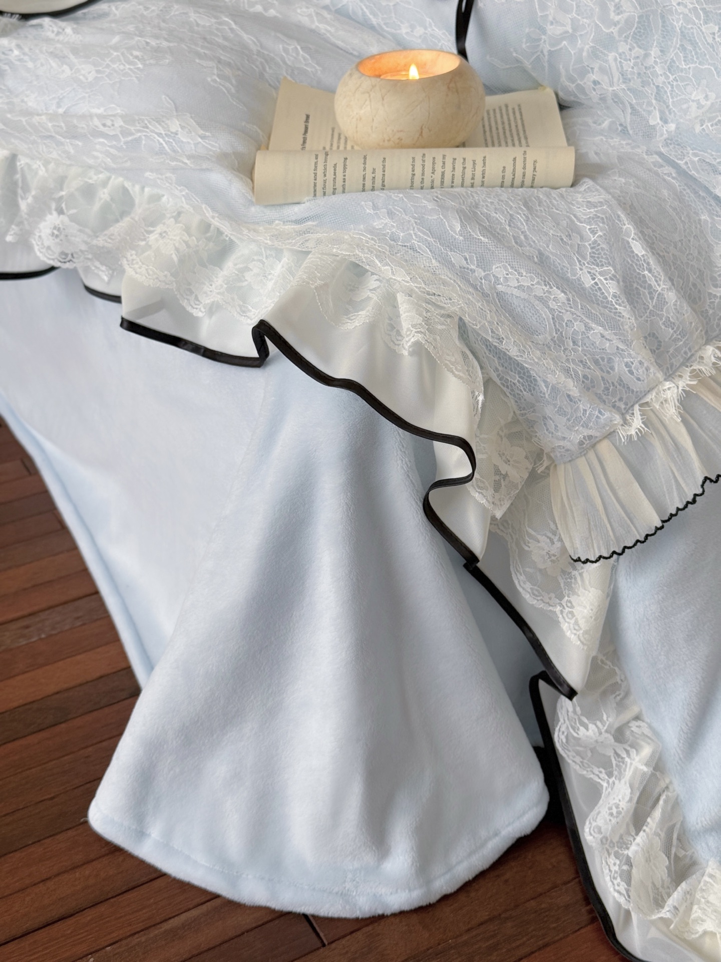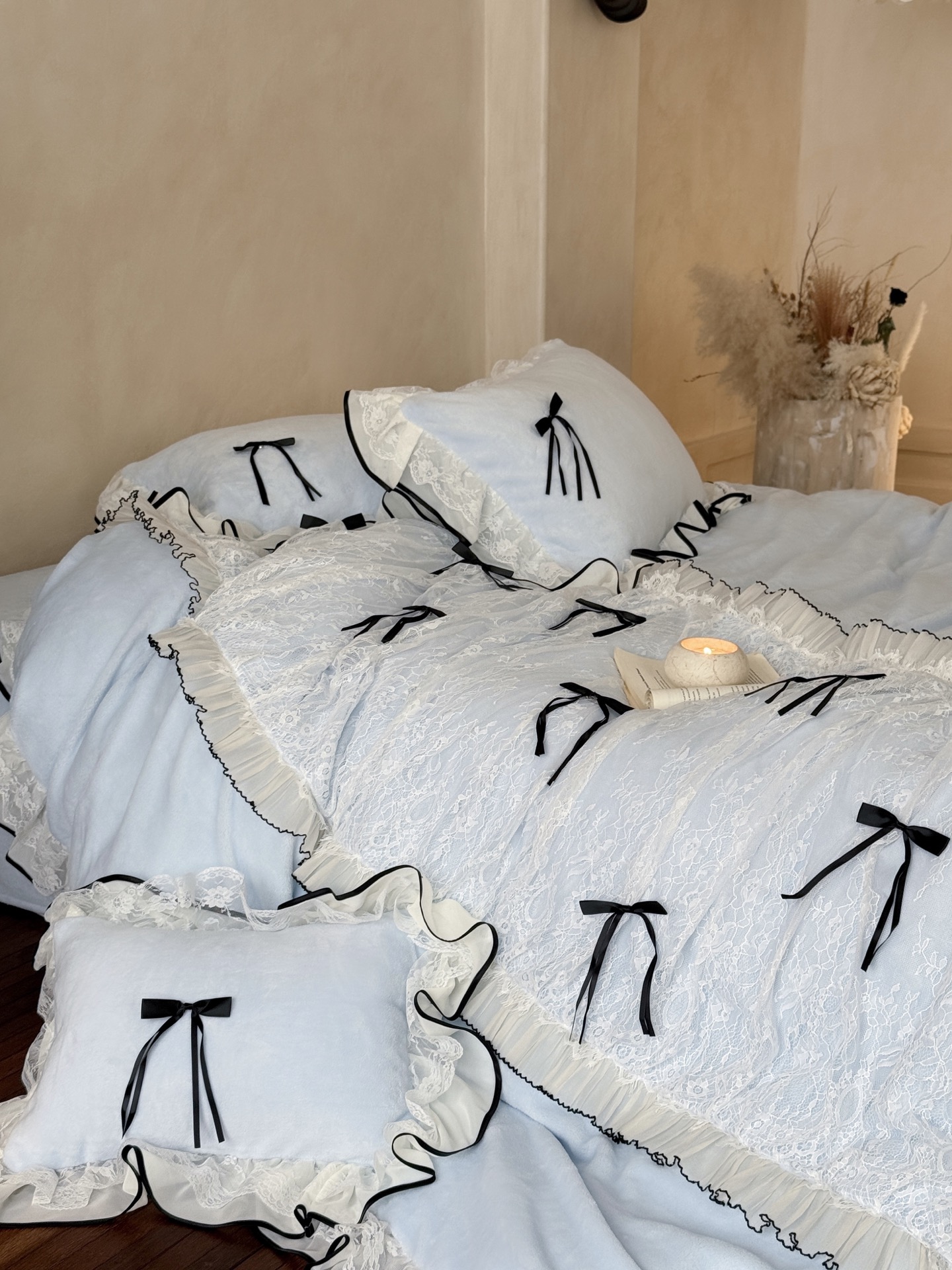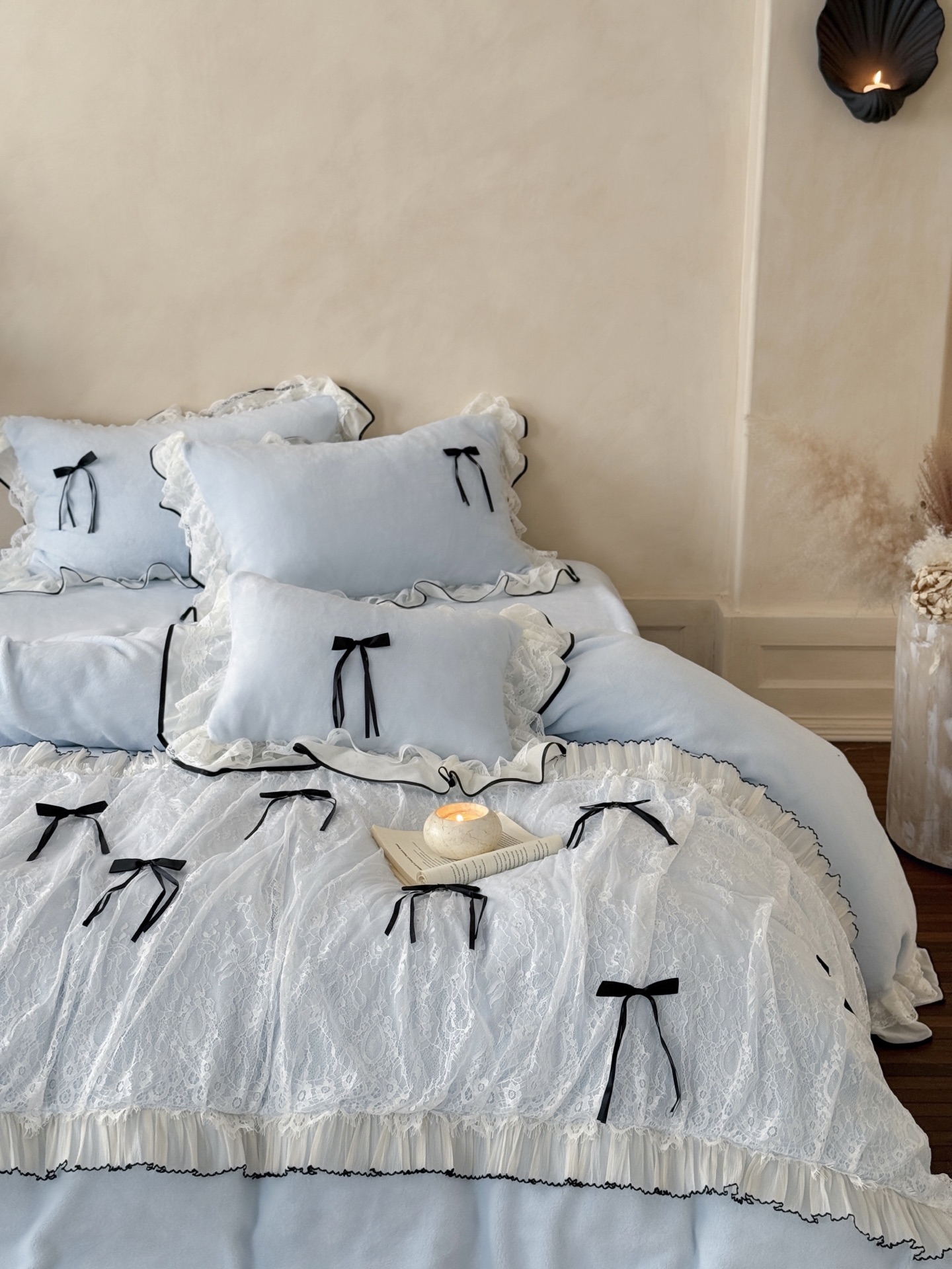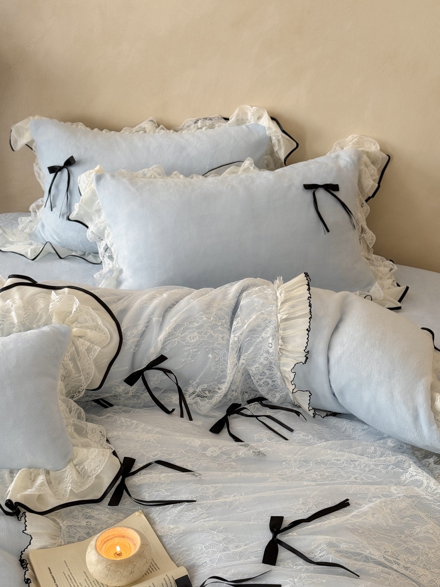 Tags: Blue Bedding Set, Bow Accent Bed Set, Lace Trim Bedding, Luxury Bedding, Milk Velvet Bedding Set, Soft Bedding Set