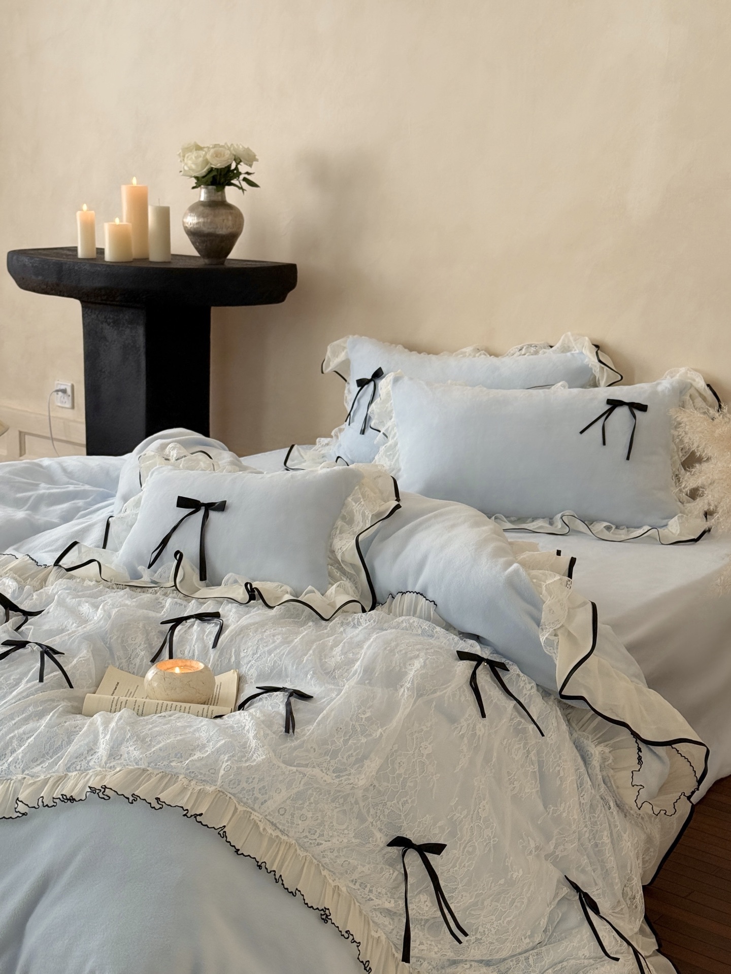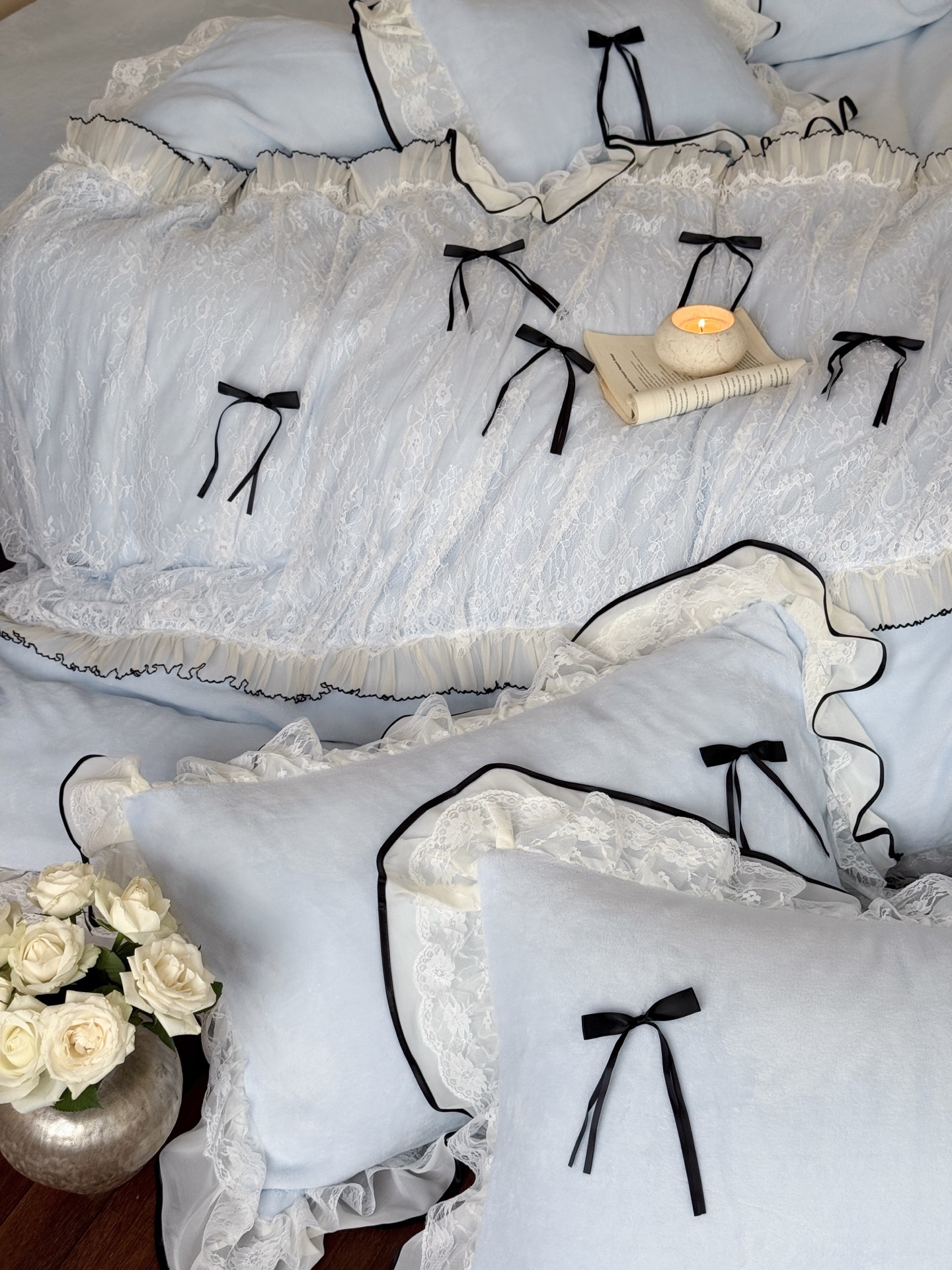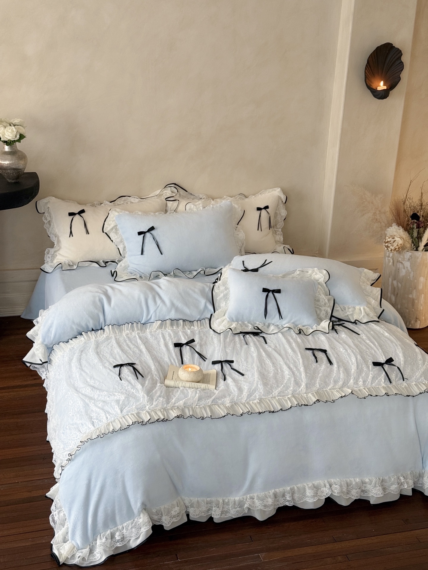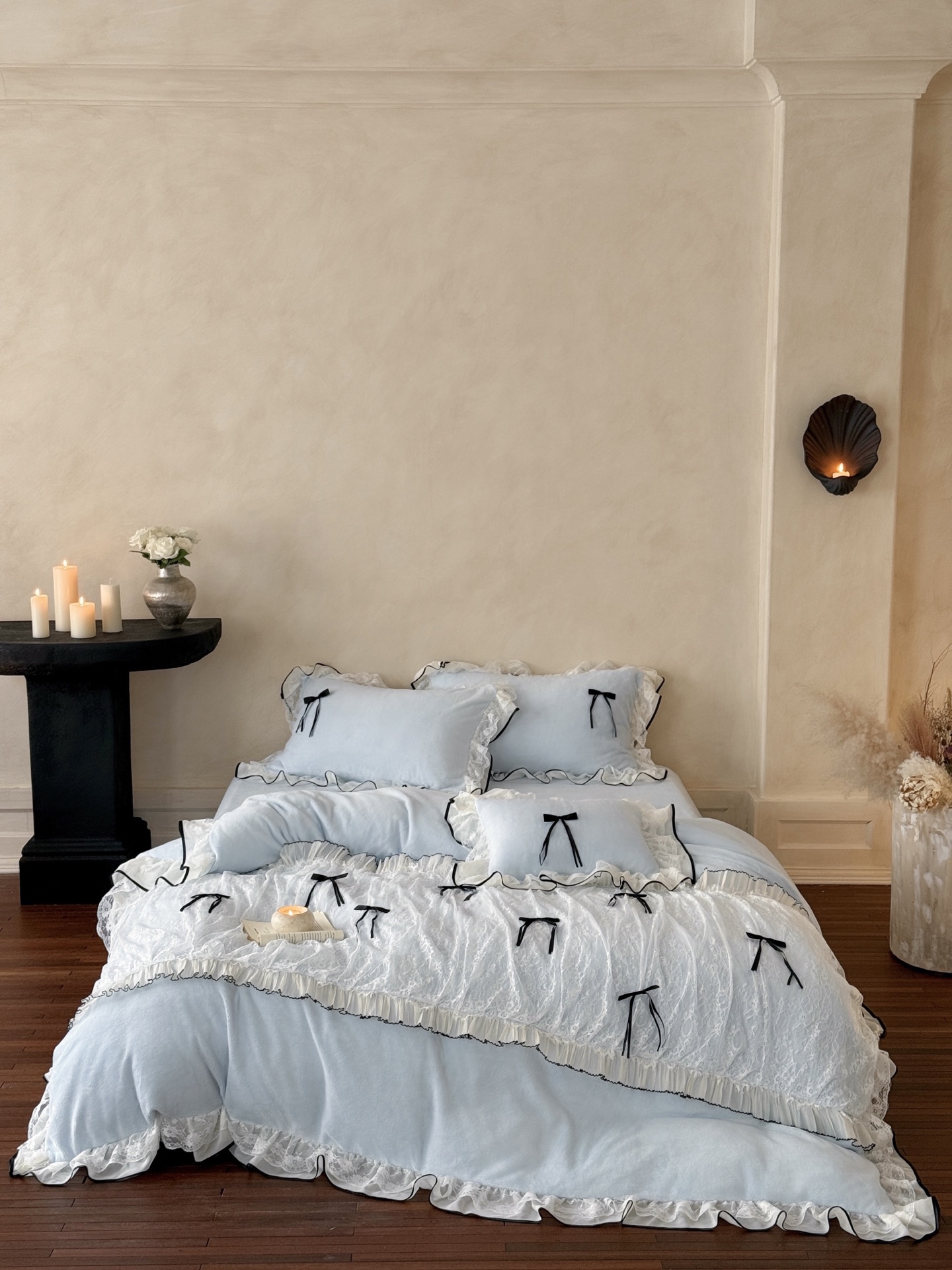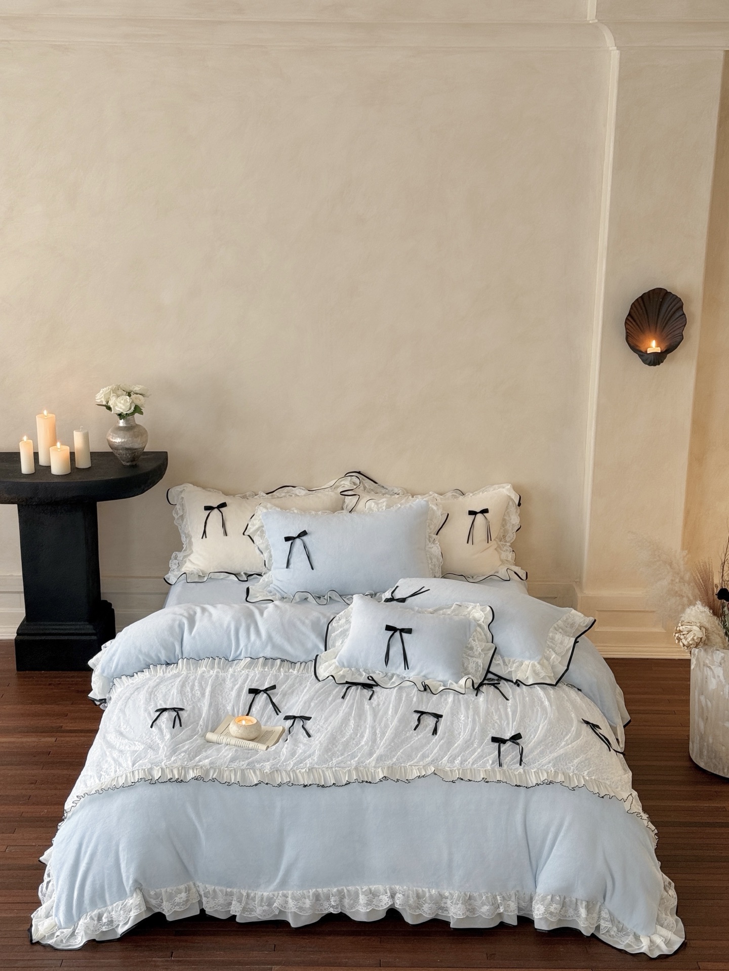 Indulge in the softness of our Milk Velvet Bedding Set. Featuring delicate lace trim and charming bow accents, it brings a touch of elegance to your bedroom.