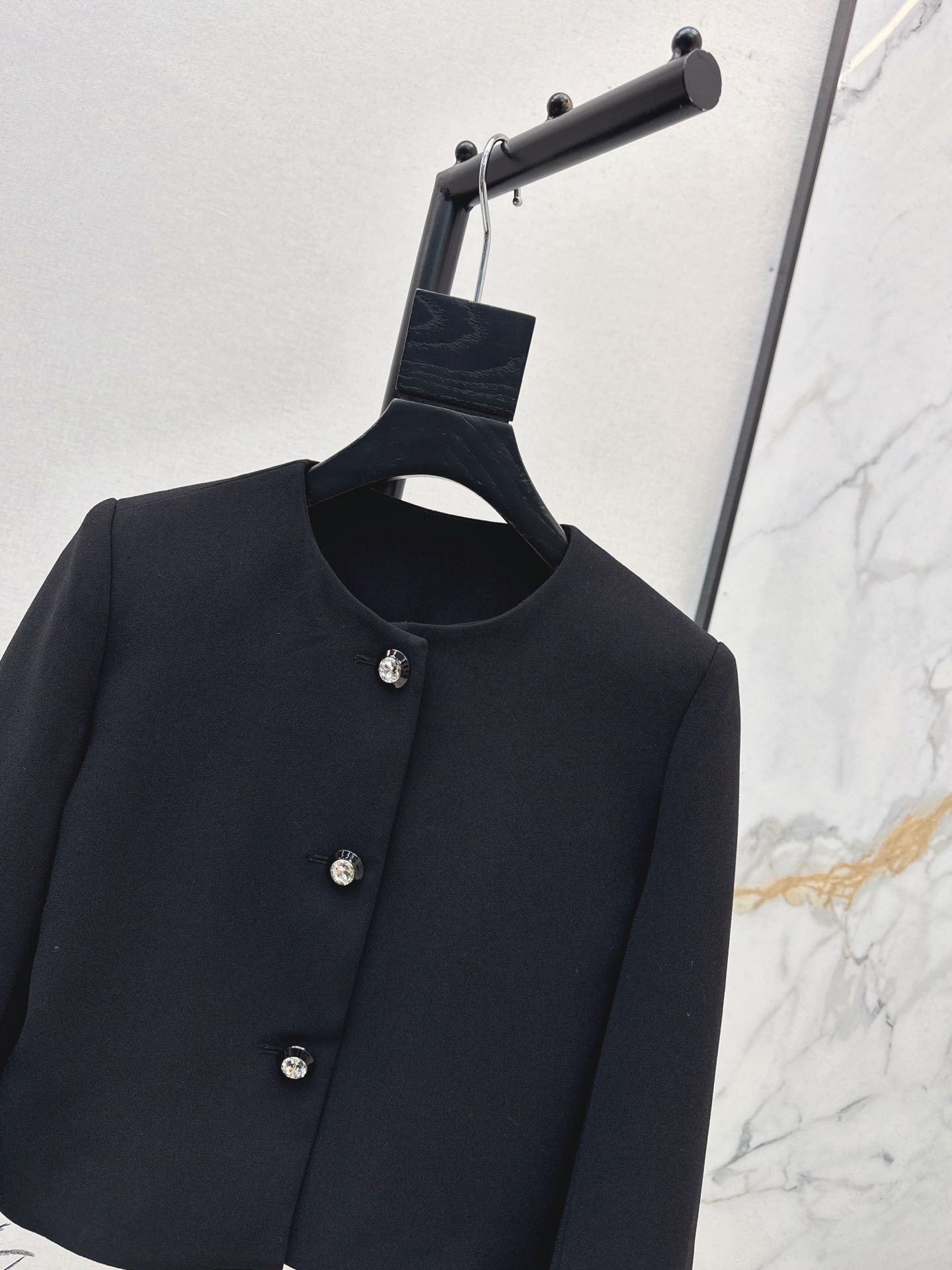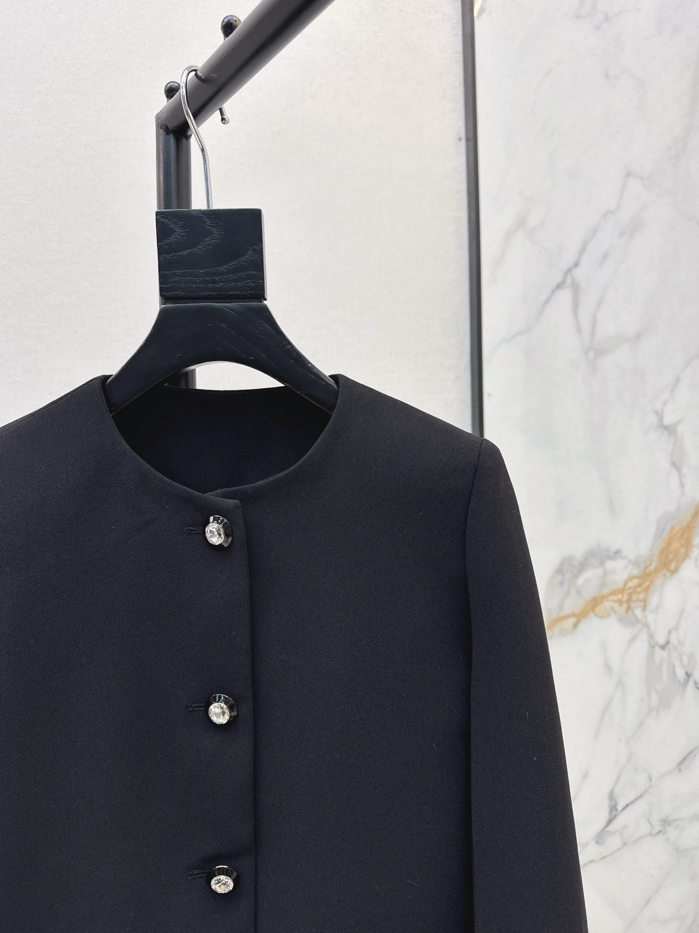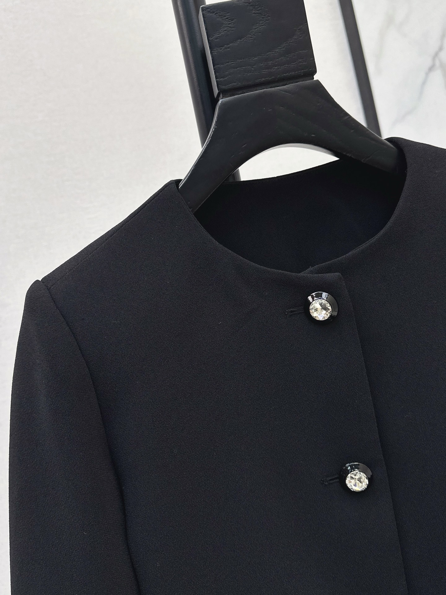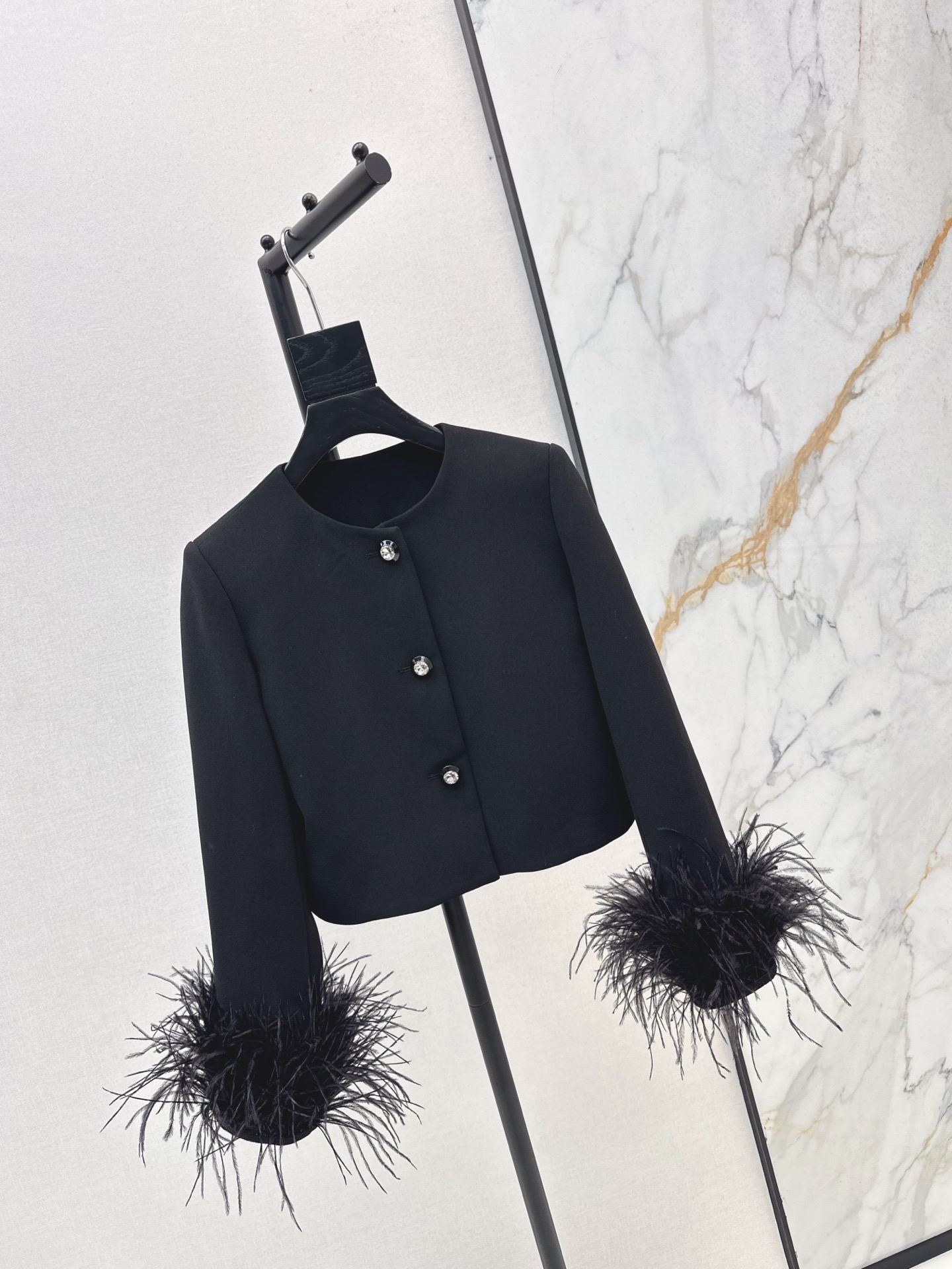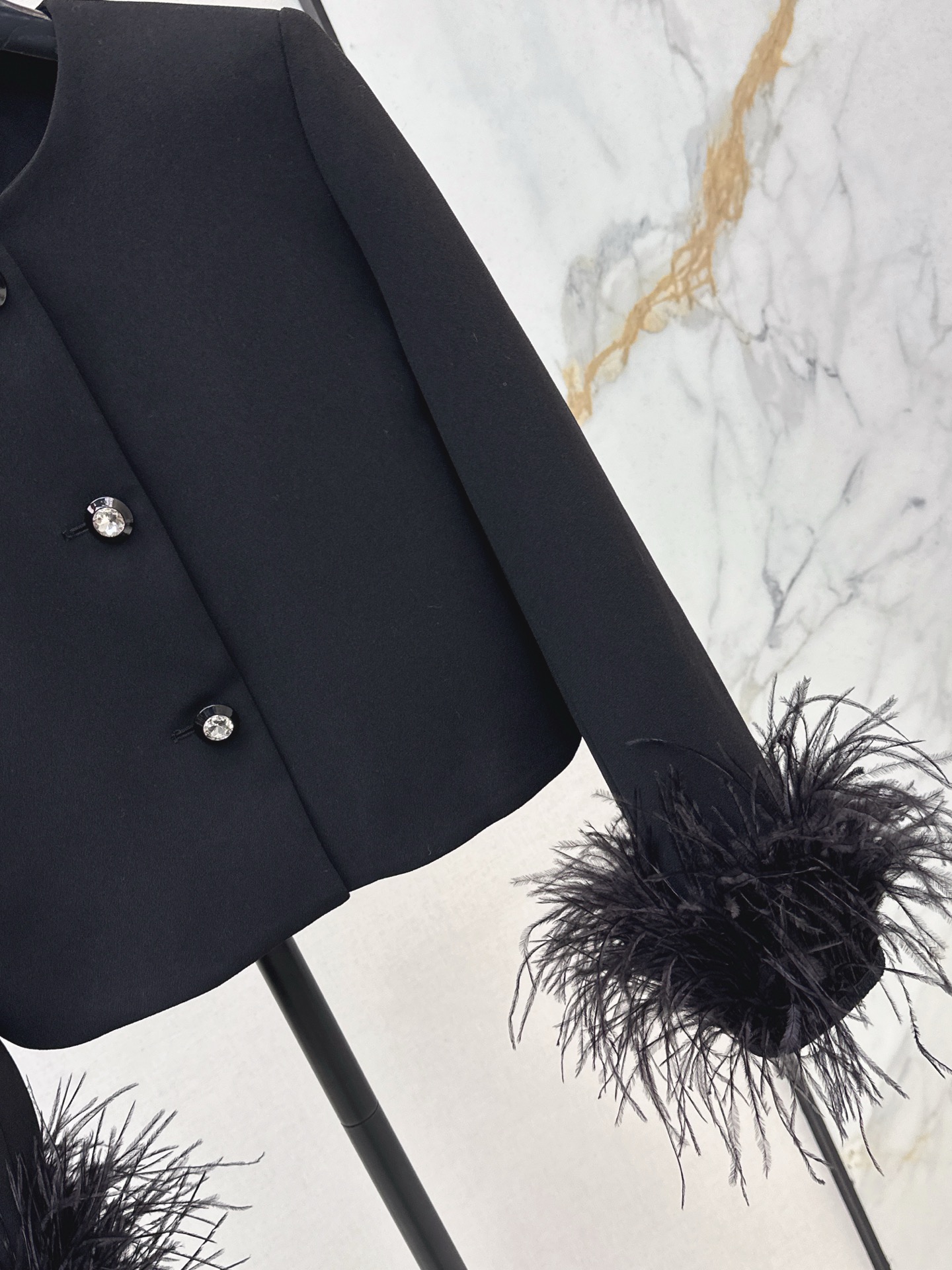 Tags: Black Round Neck Jacket, Diamond Button Jacket, Elegant Women's Jacket, Ostrich Feather Jacket, Short Boxy Jacket