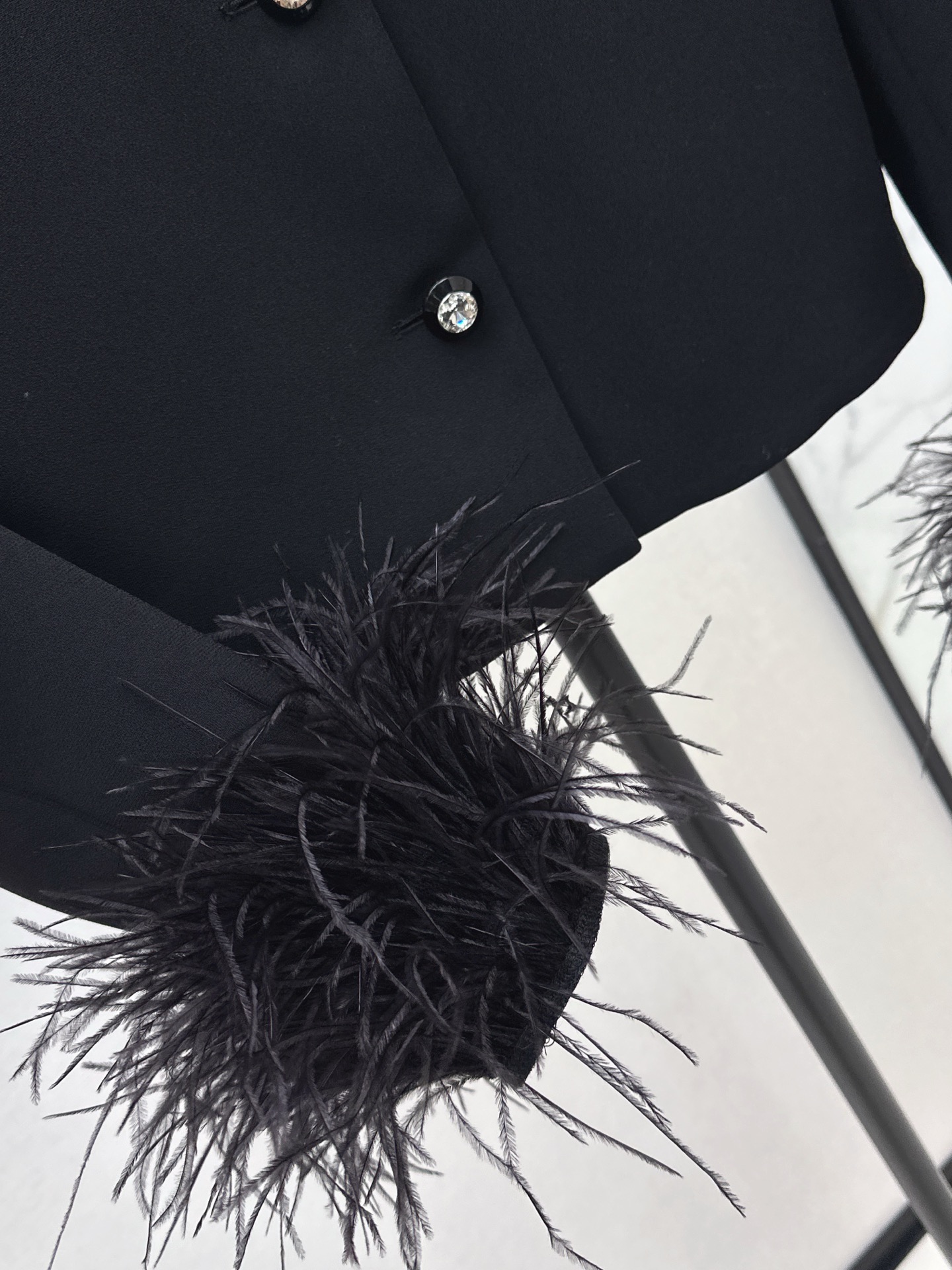 Elevate your style with this chic black jacket featuring ostrich feather cuffs and diamond-studded buttons. Perfect for both day and night.
