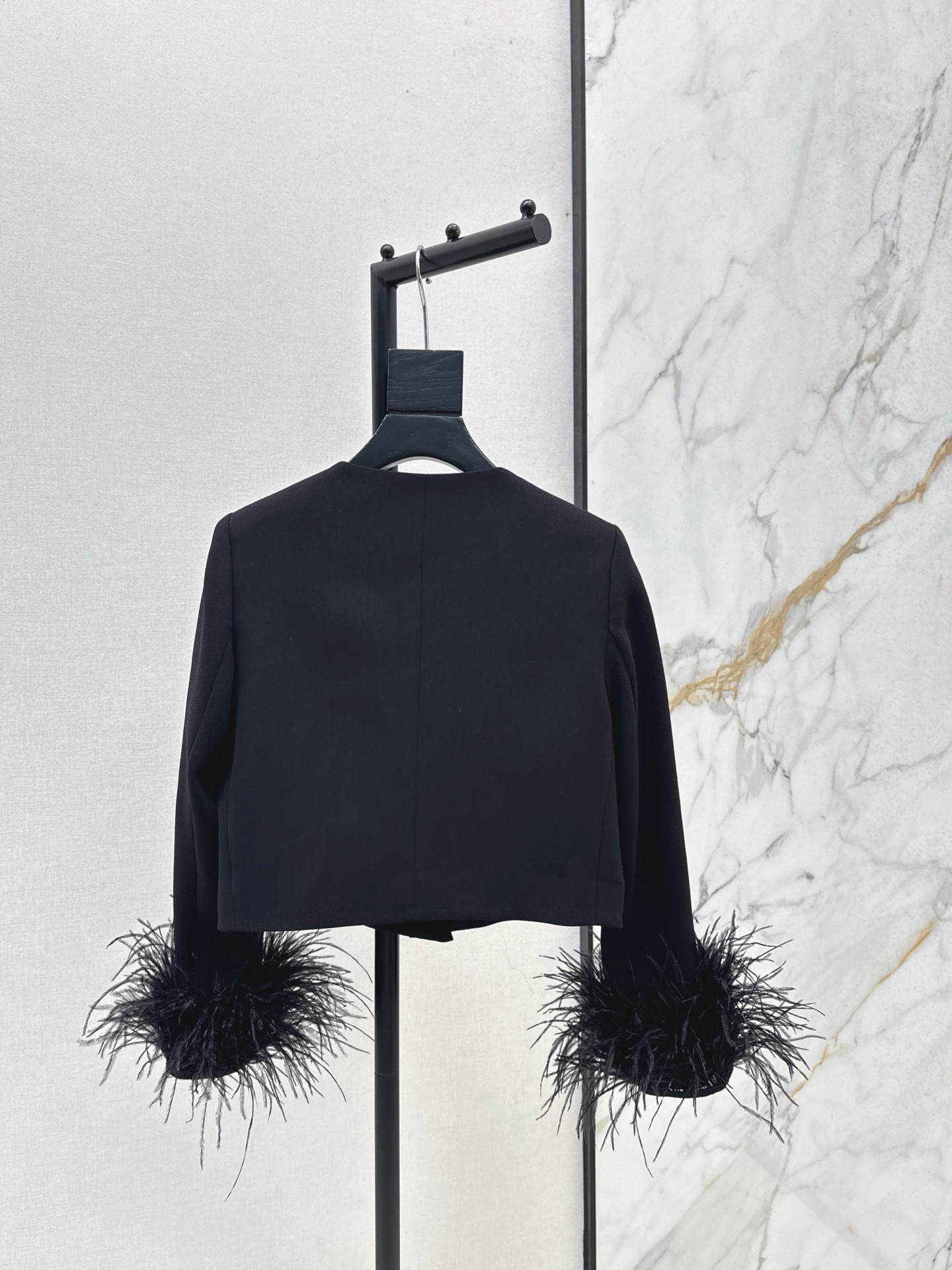 Elegant Black Round Neck Jacket with Ostrich Feather Cuffs
