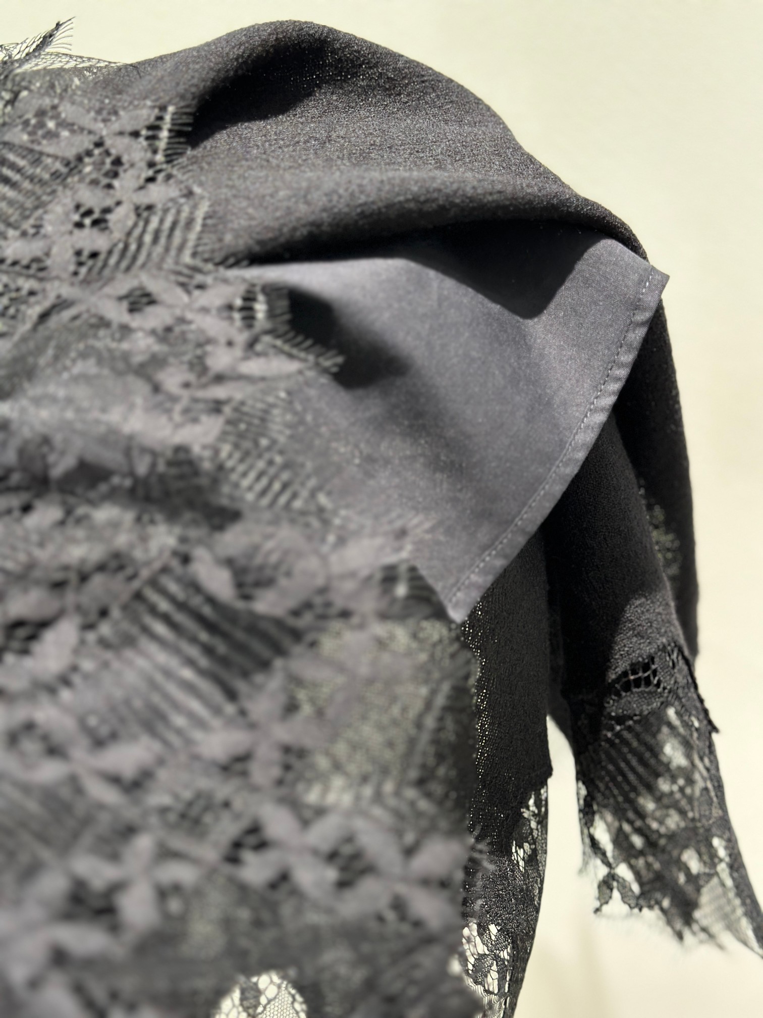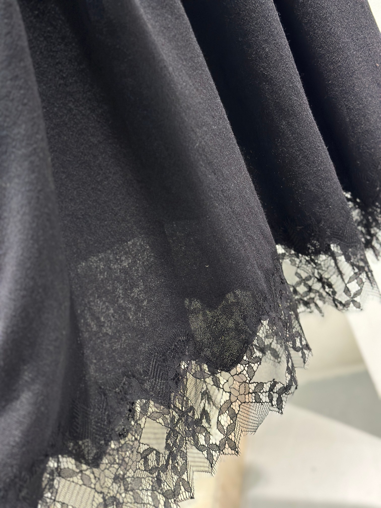 This lace-trimmed midi skirt embodies a new romantic aesthetic, blending delicate lace with a classic design.