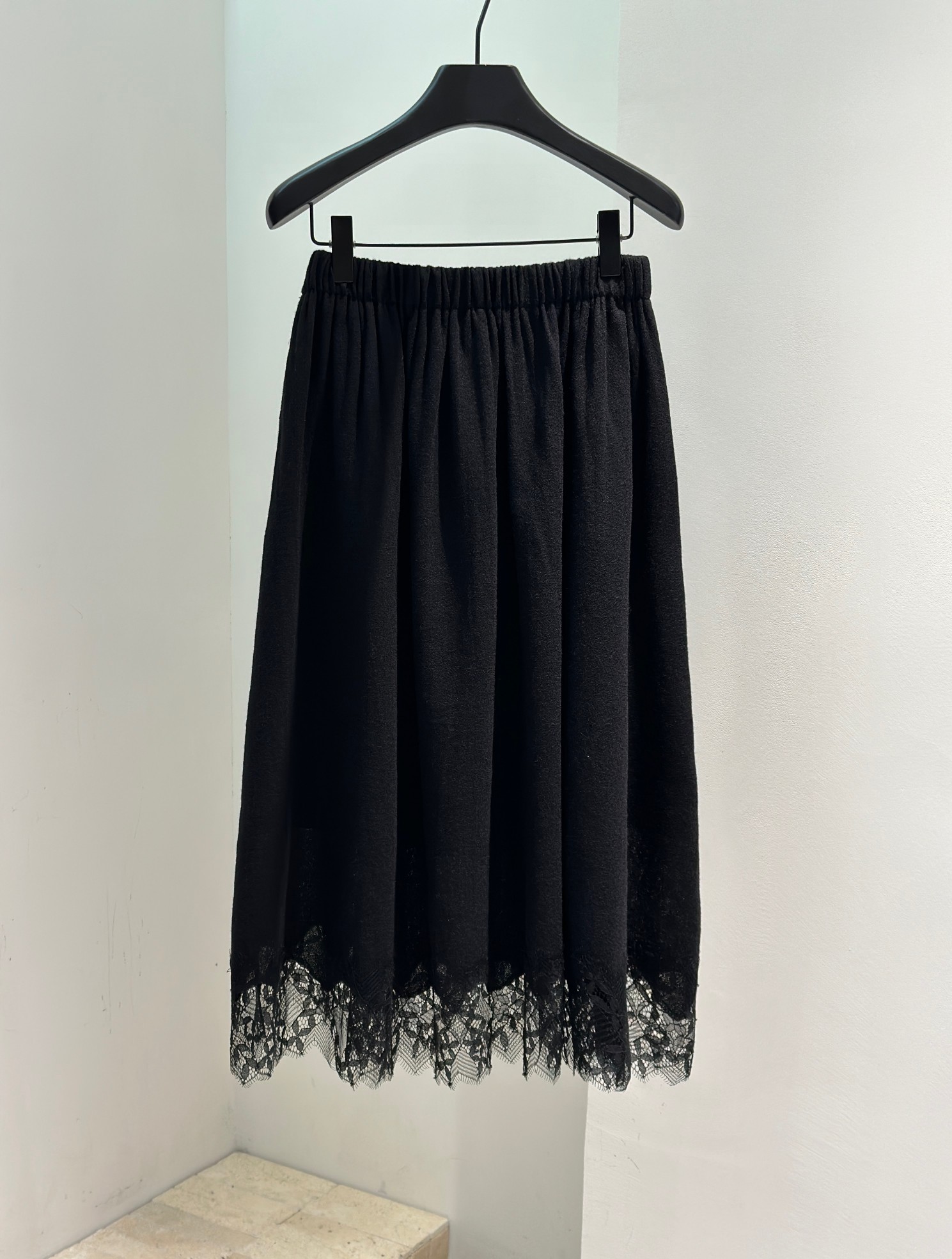 Elevate your wardrobe with this stunning lace-trimmed midi skirt. Combines delicate lace with a comfortable elastic waist for a chic look.