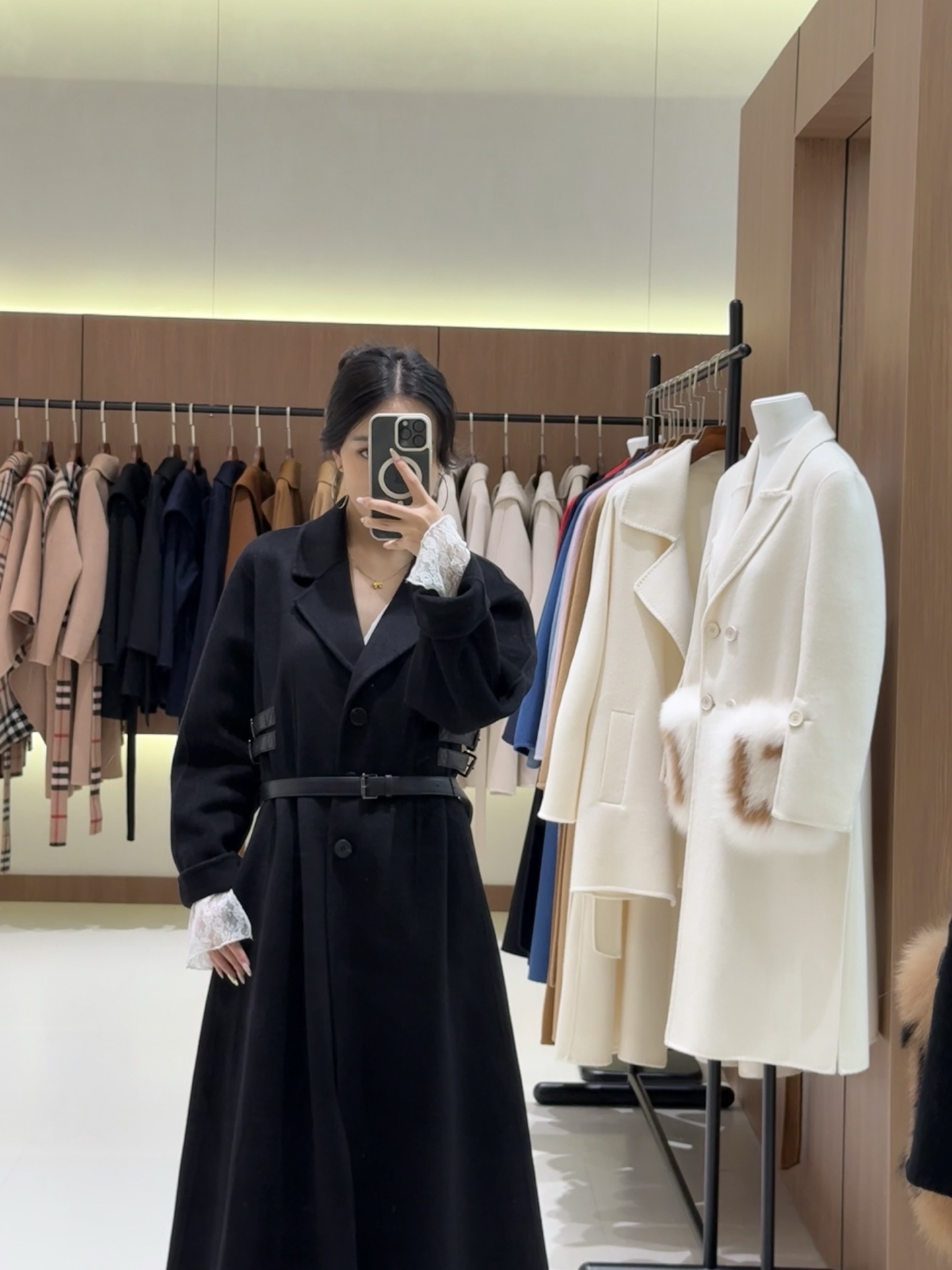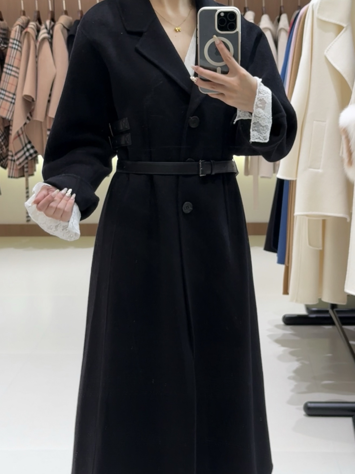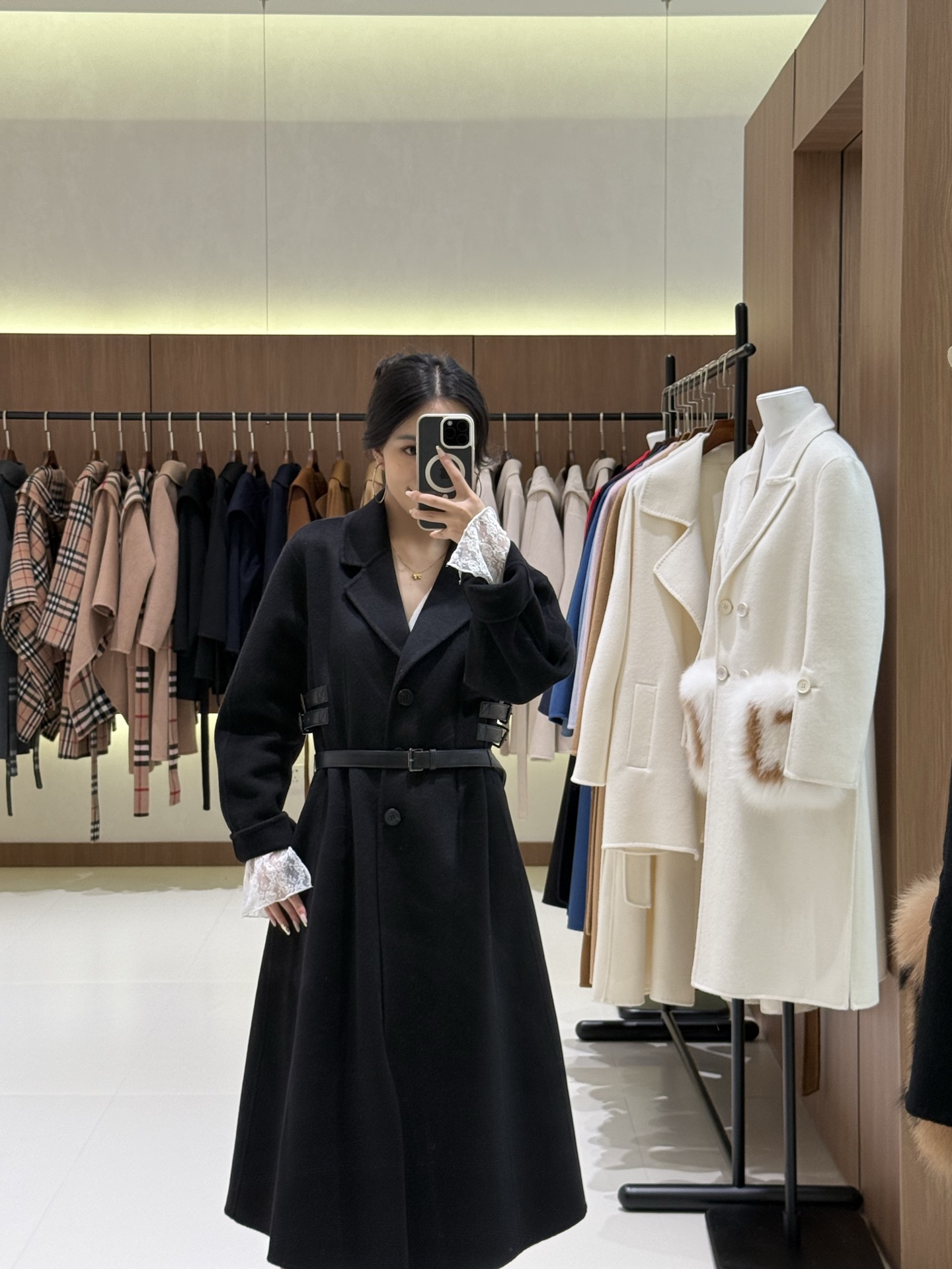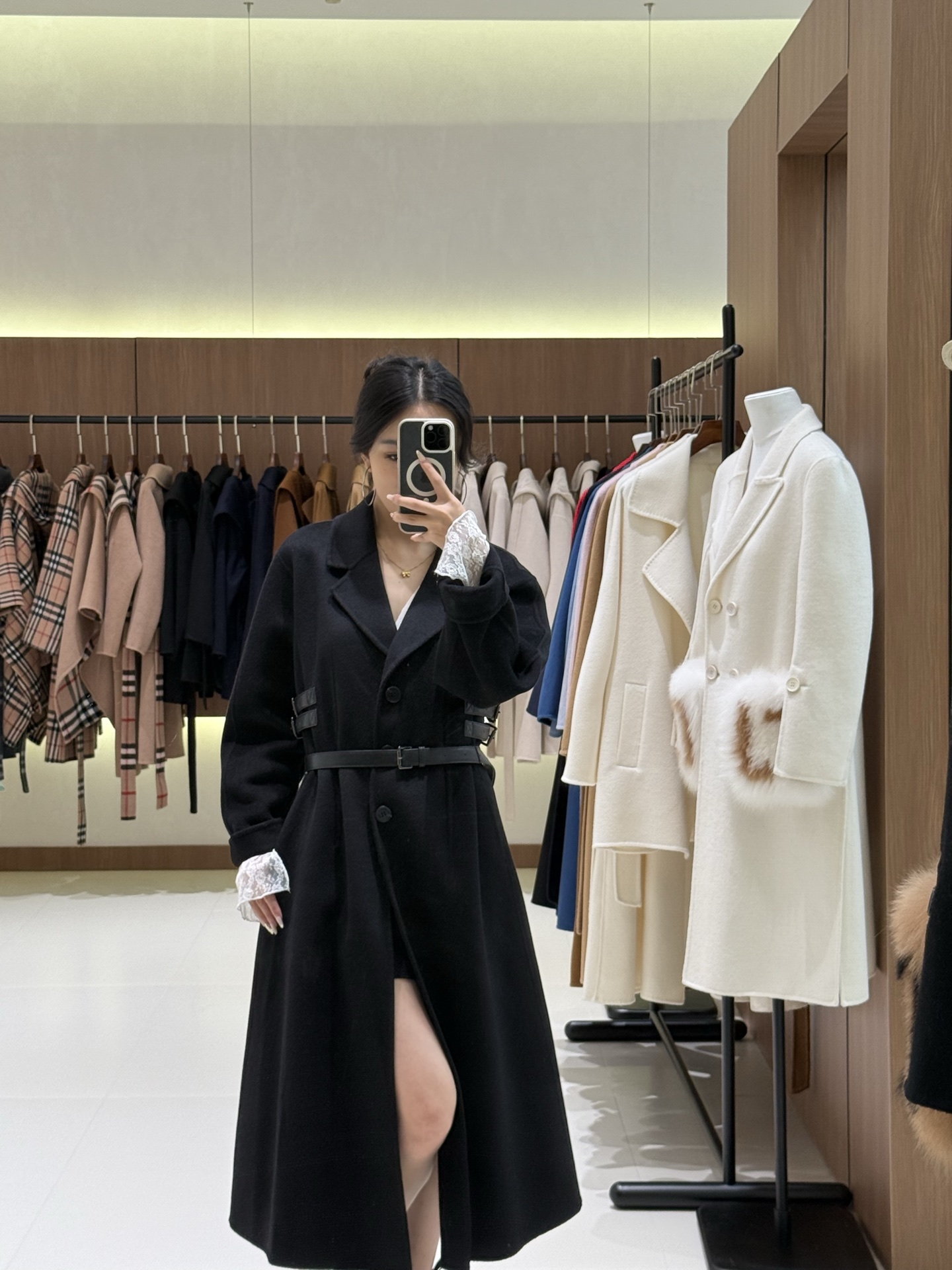 Tags: Belted Black Coat, Elegant Winter Coat, Fashionable Women's Coat, Long Sleeve Coat, MaxMara Style Coat, Wool Blend Coat