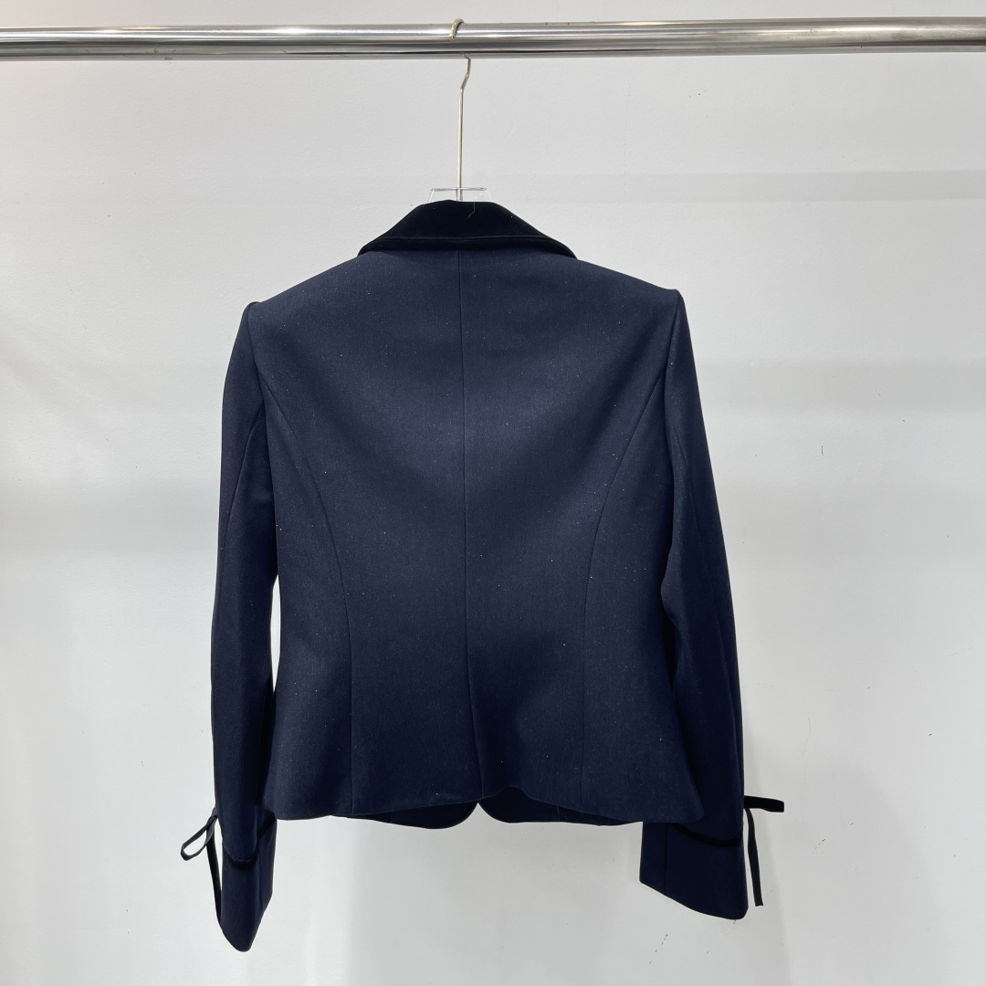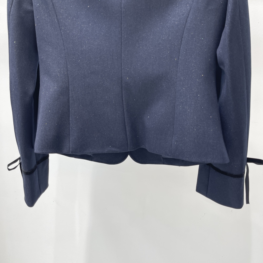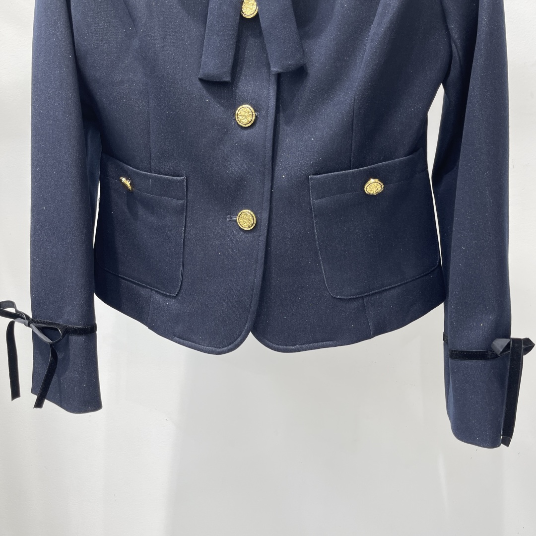 - Tailored Jacket: The jacket features a classic cut with a modern twist, including a unique bow detail that adds a touch of femininity.
