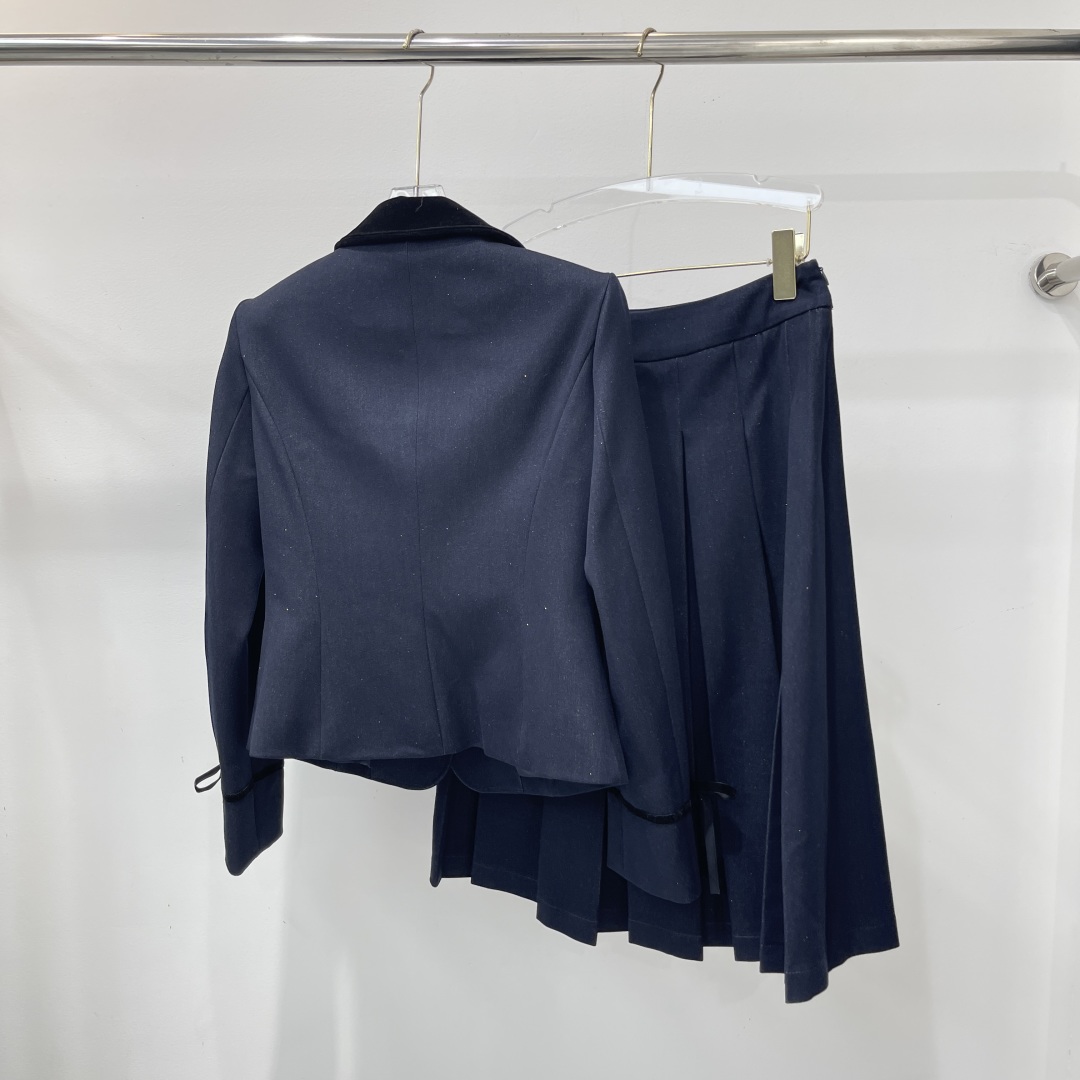 Chic skirt suit set for women. Features a tailored jacket with bow detail and coordinating pleated skirt. Perfect for a sophisticated, polished look.