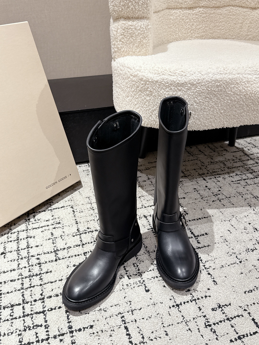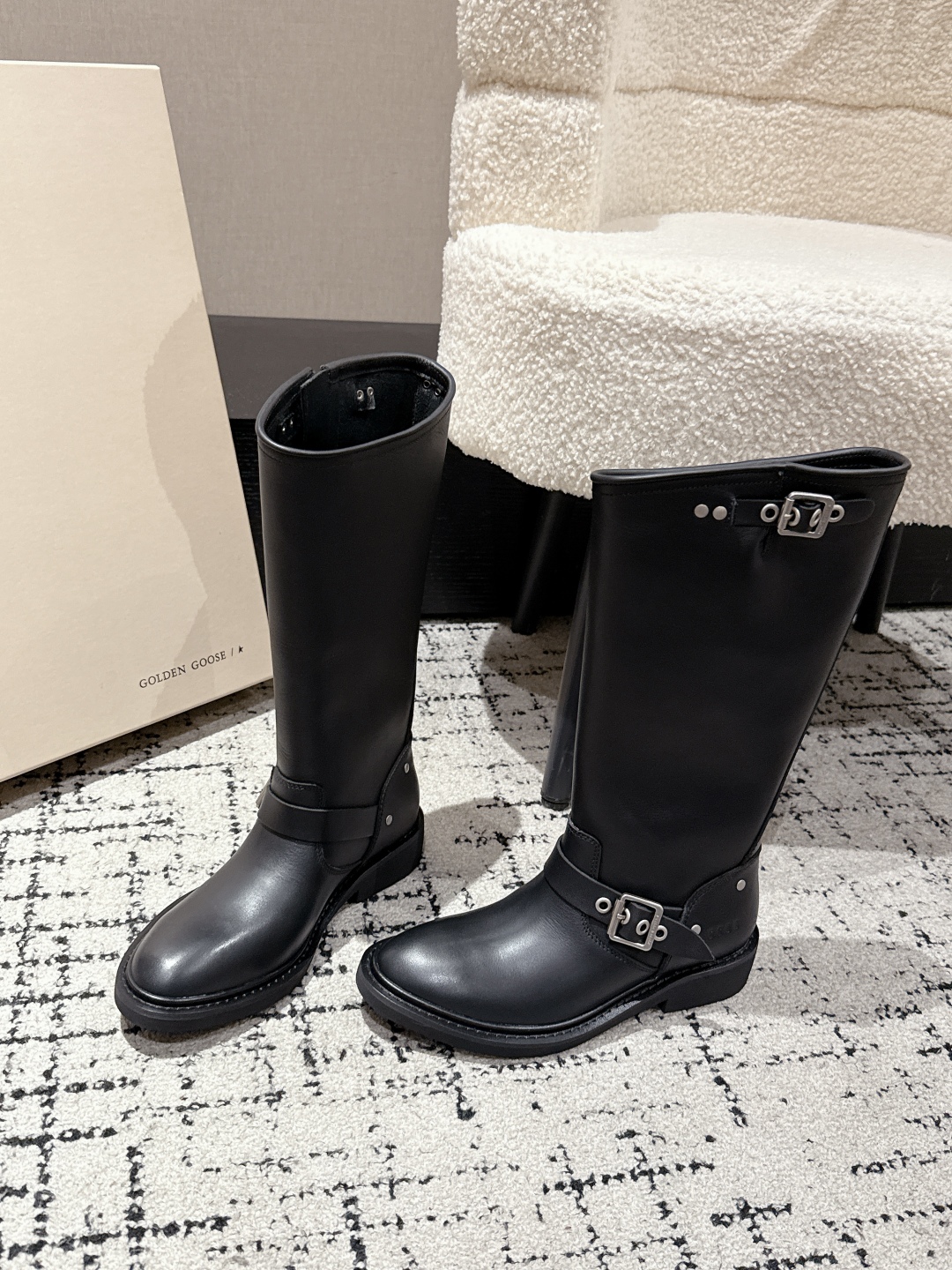 Elevate your style with these Golden Goose tall motorcycle boots. Crafted from premium leather with buckle accents for a chic, edgy look.