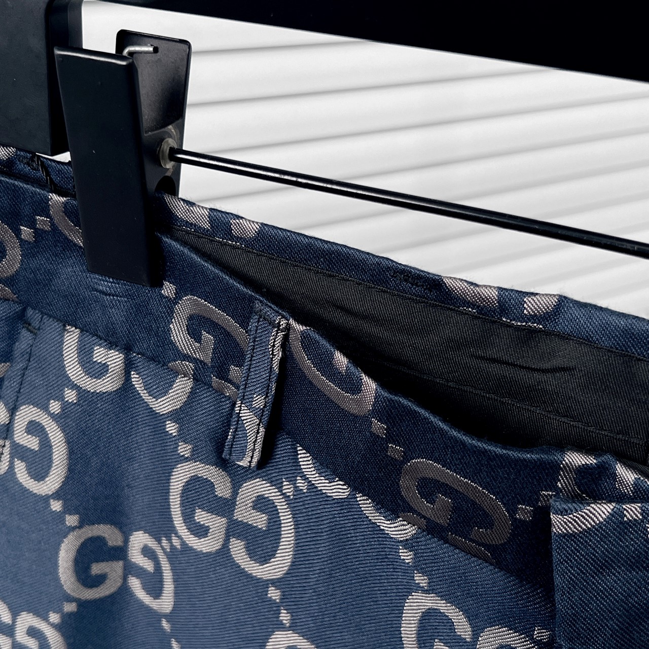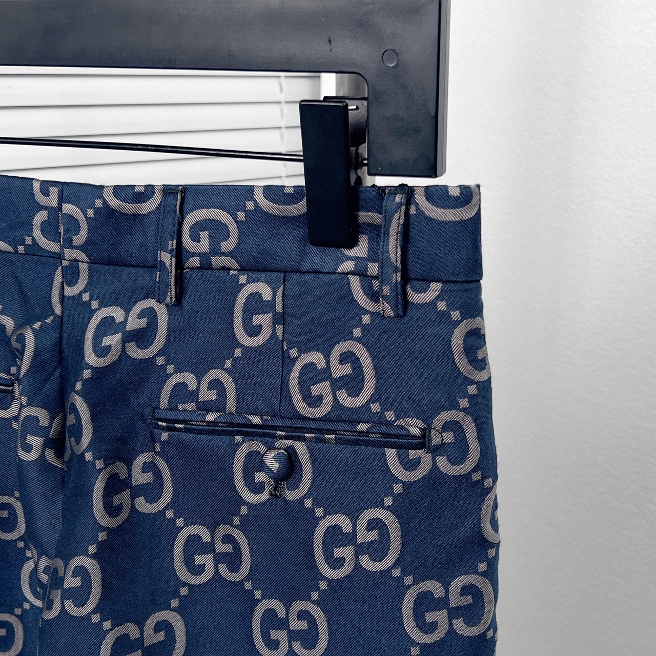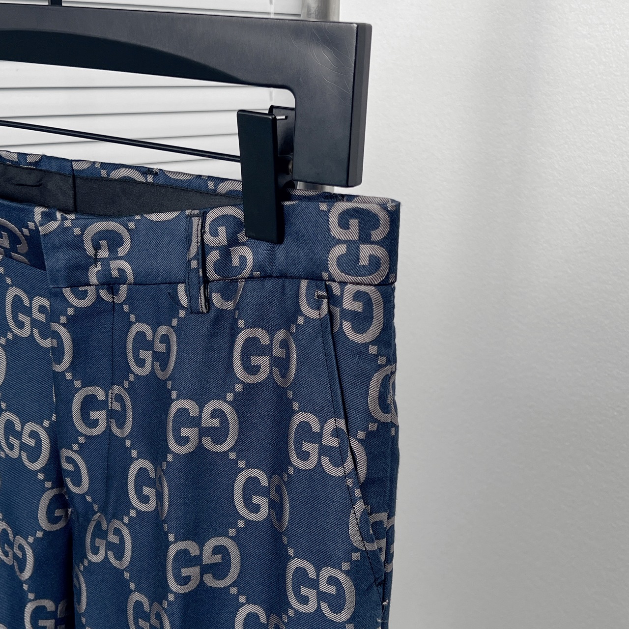 Tags: Dark Blue Cotton Pants, GG Logo Trousers, Gucci Cotton Trousers, Jacquard Weave Trousers, Men's Designer Trousers