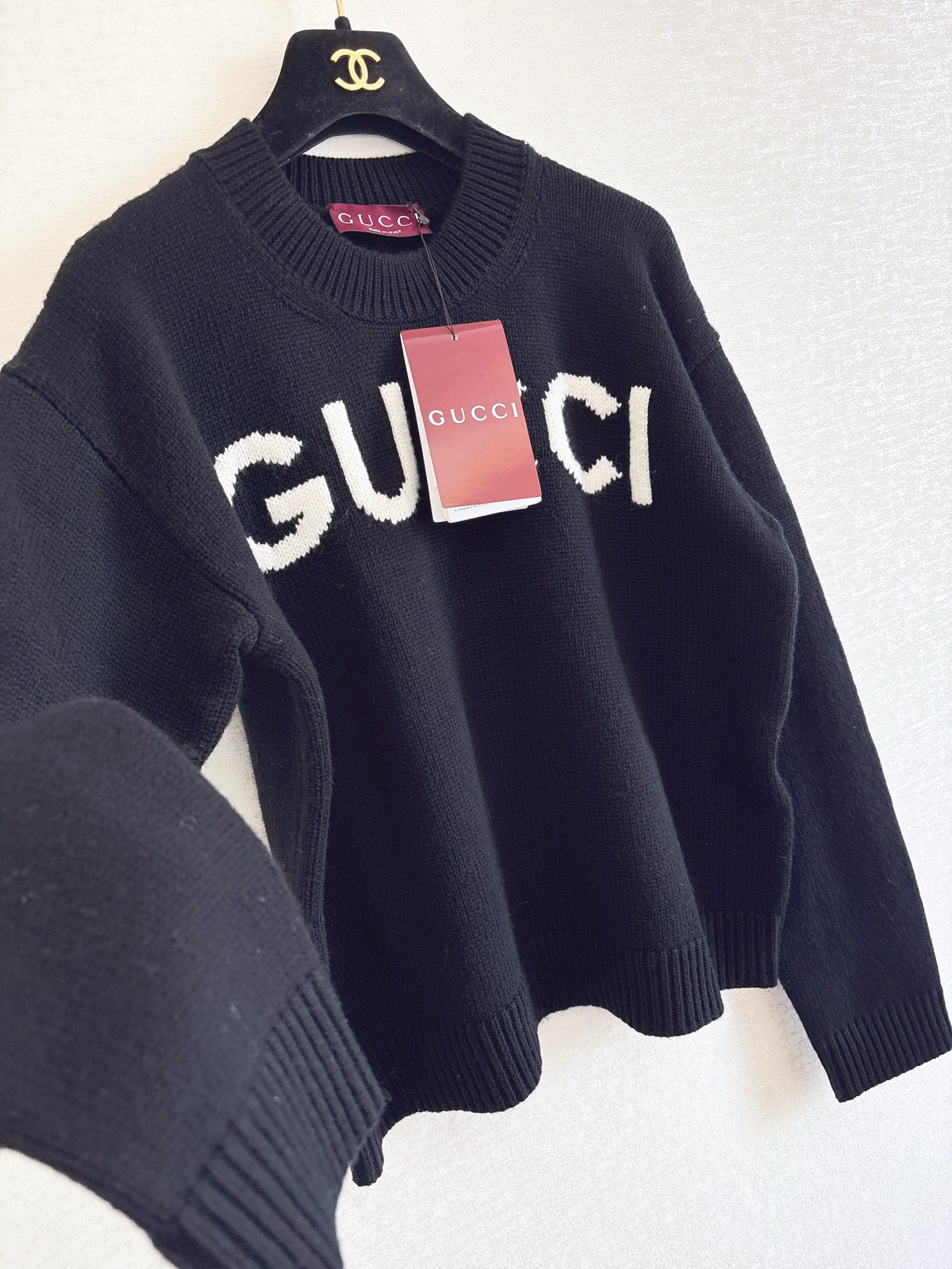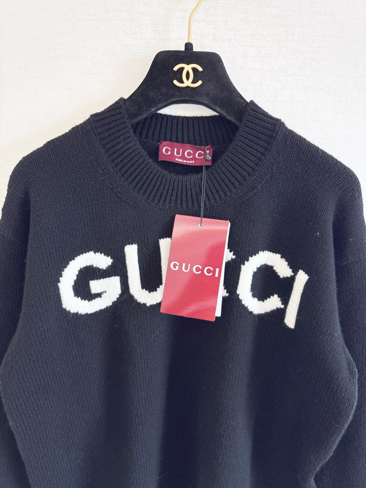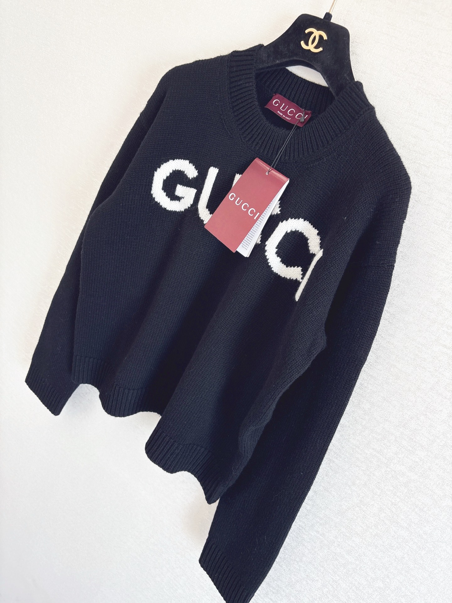 Tags: Black Logo Sweater, Designer Crew Neck Sweater, Gucci Wool Sweater, Long Sleeve Women Sweater, Luxury Women Clothing