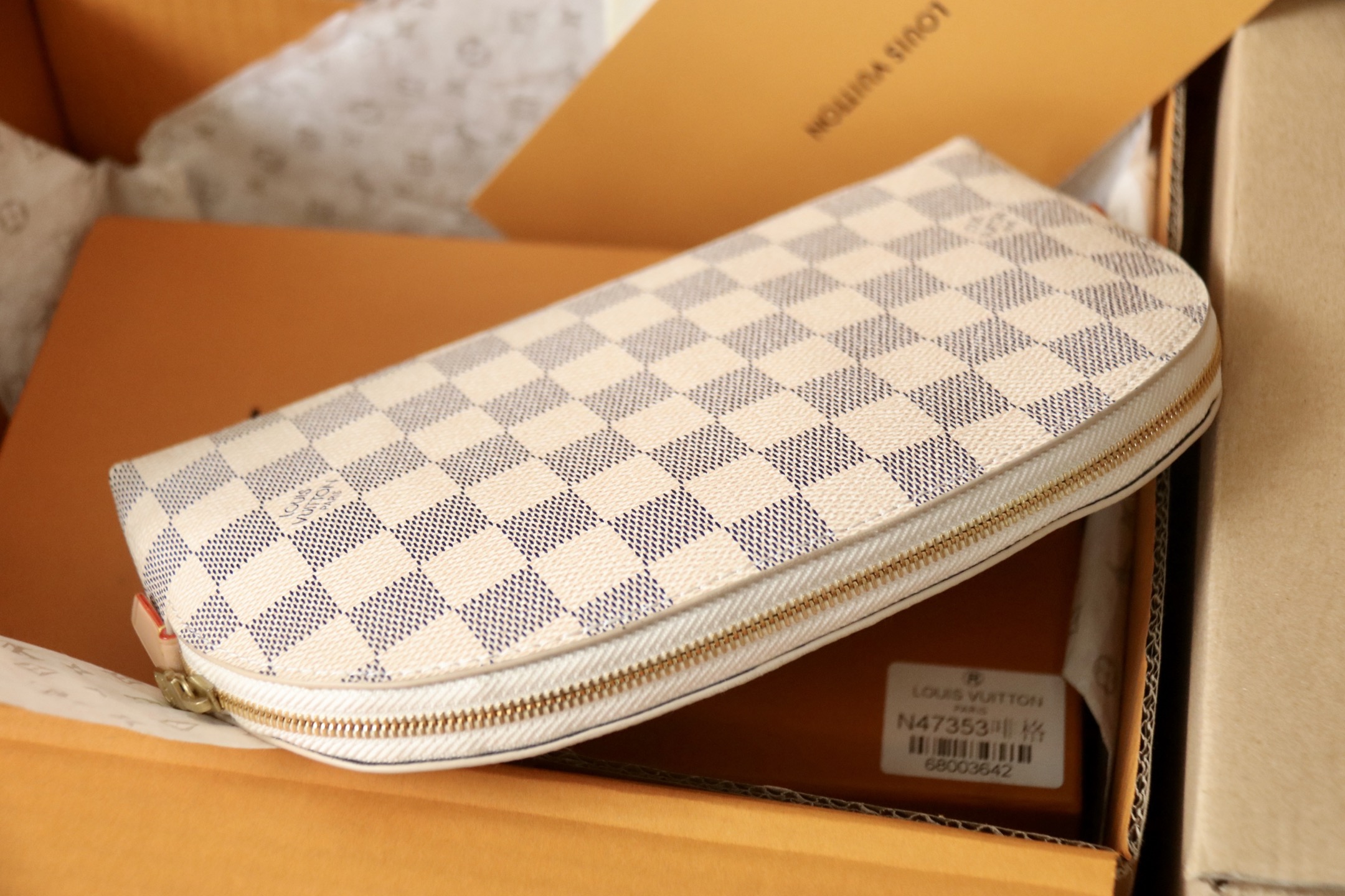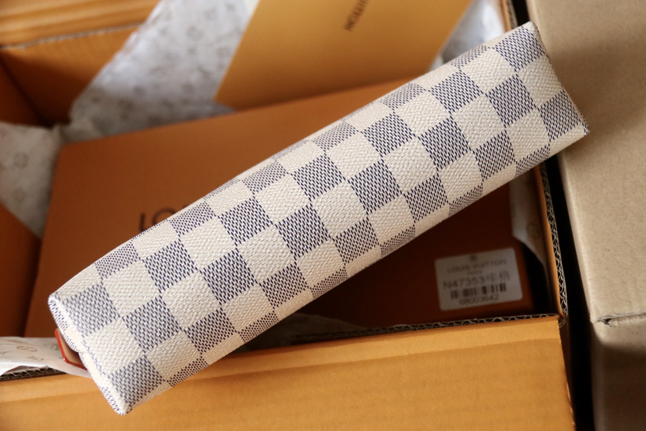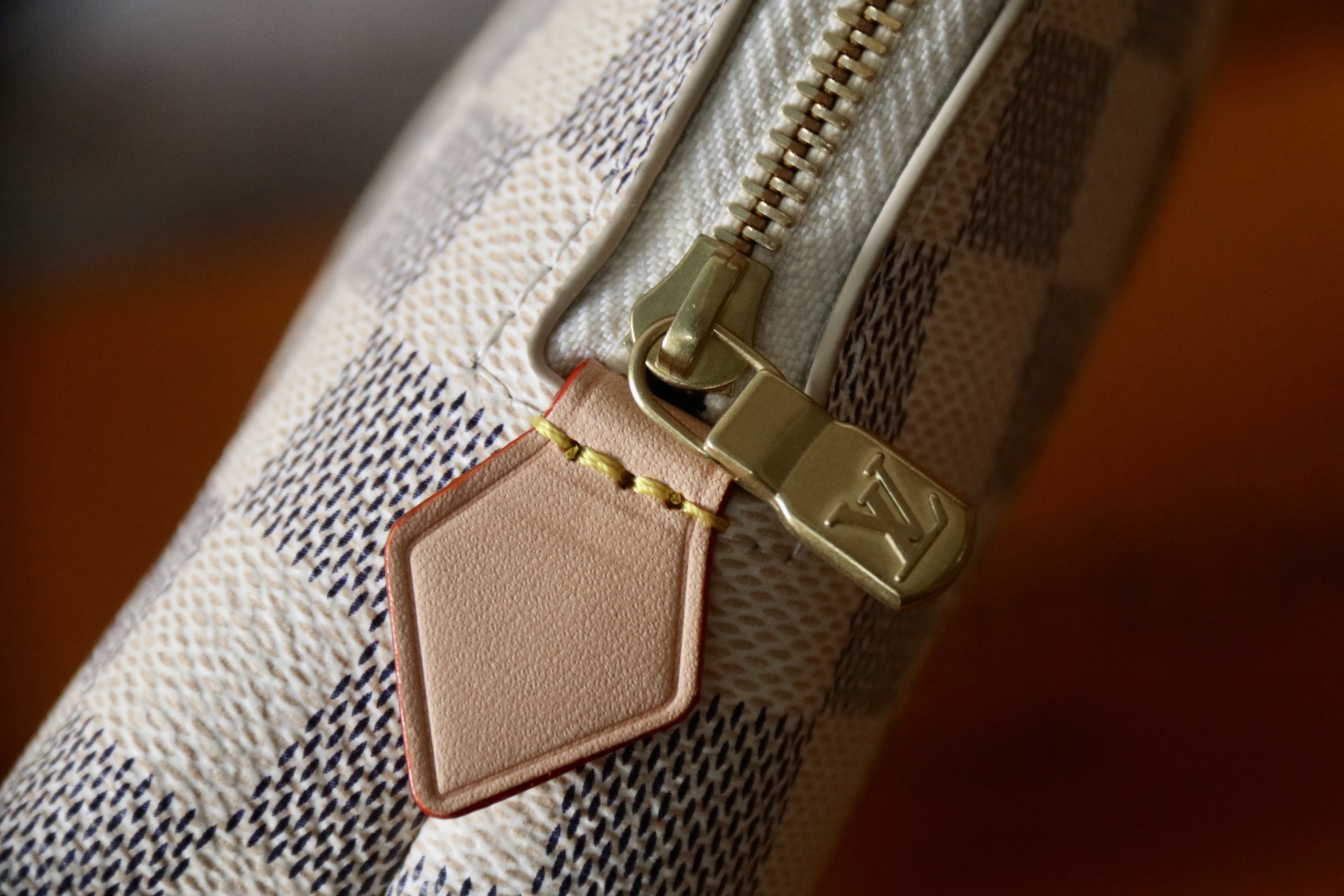 I absolutely love this pouch! The Damier Azur canvas is so beautiful, and the gold-tone hardware adds a touch of elegance. It's perfect for keeping my makeup organized when I travel.