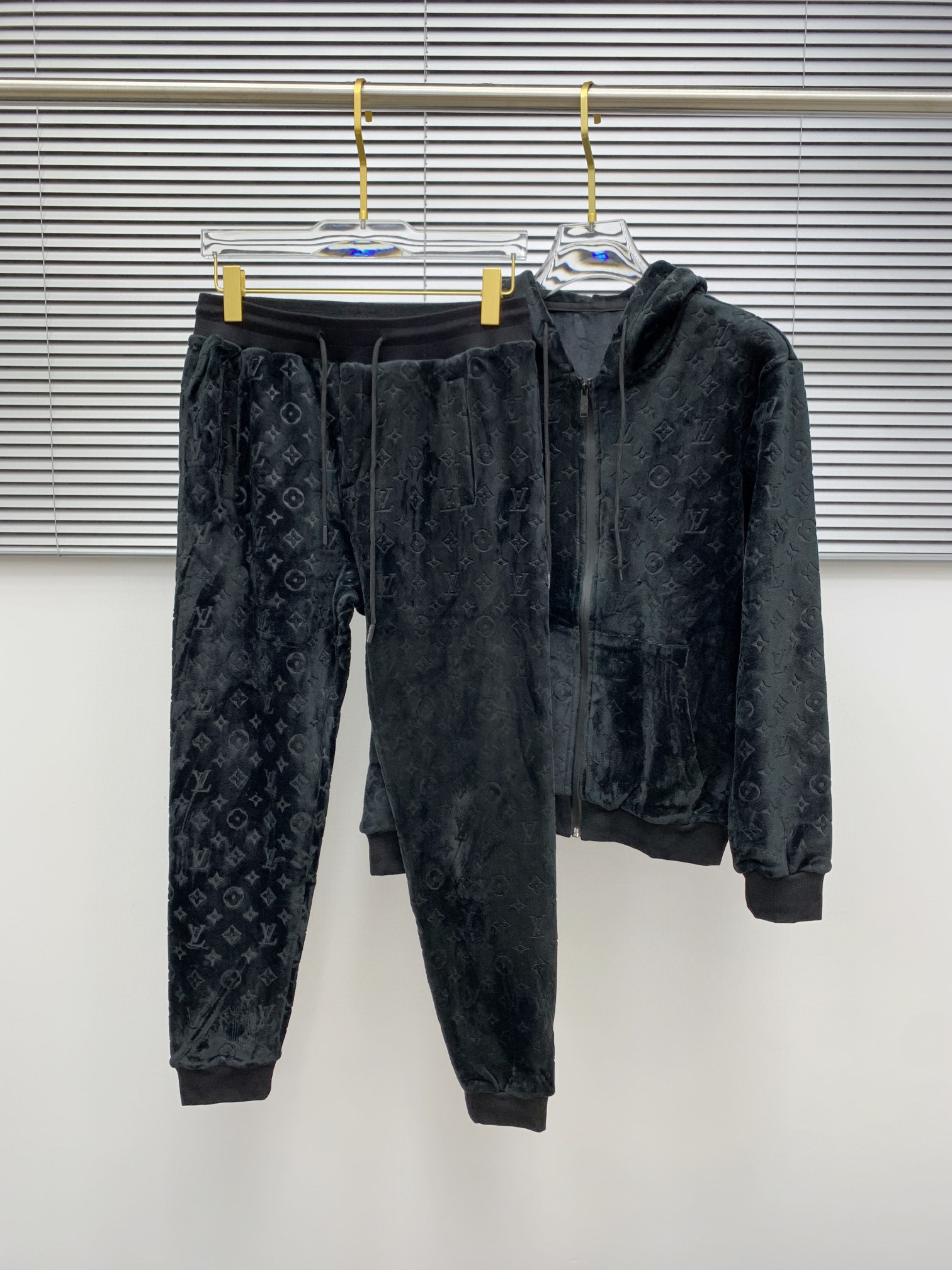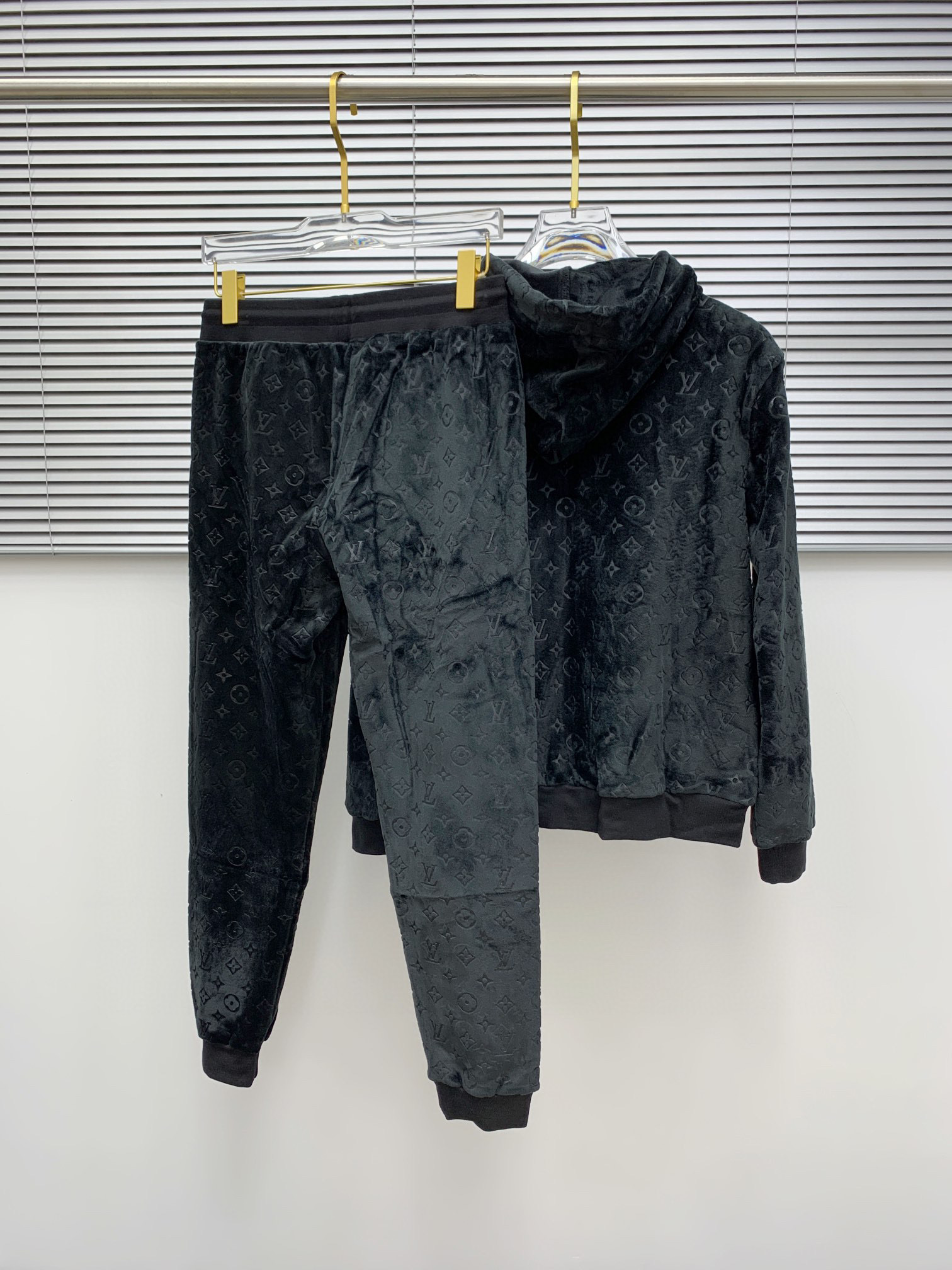Tags: Designer Hoodie And Jogger, Embossed Velvet Loungewear, Louis Vuitton Loungewear, Luxury Tracksuit, Monogram Velvet Set