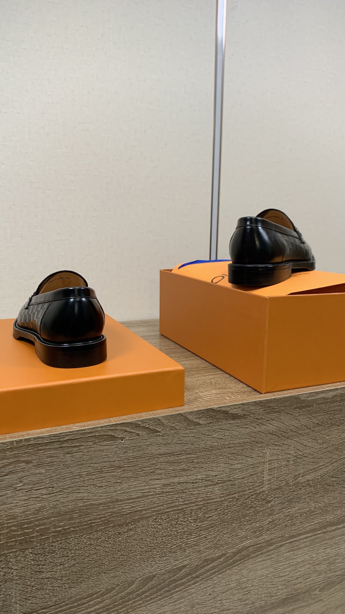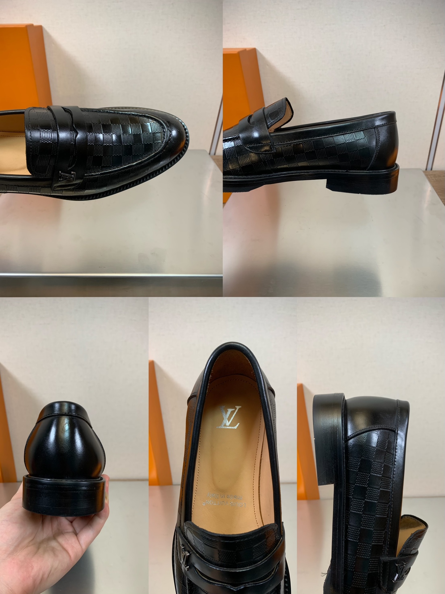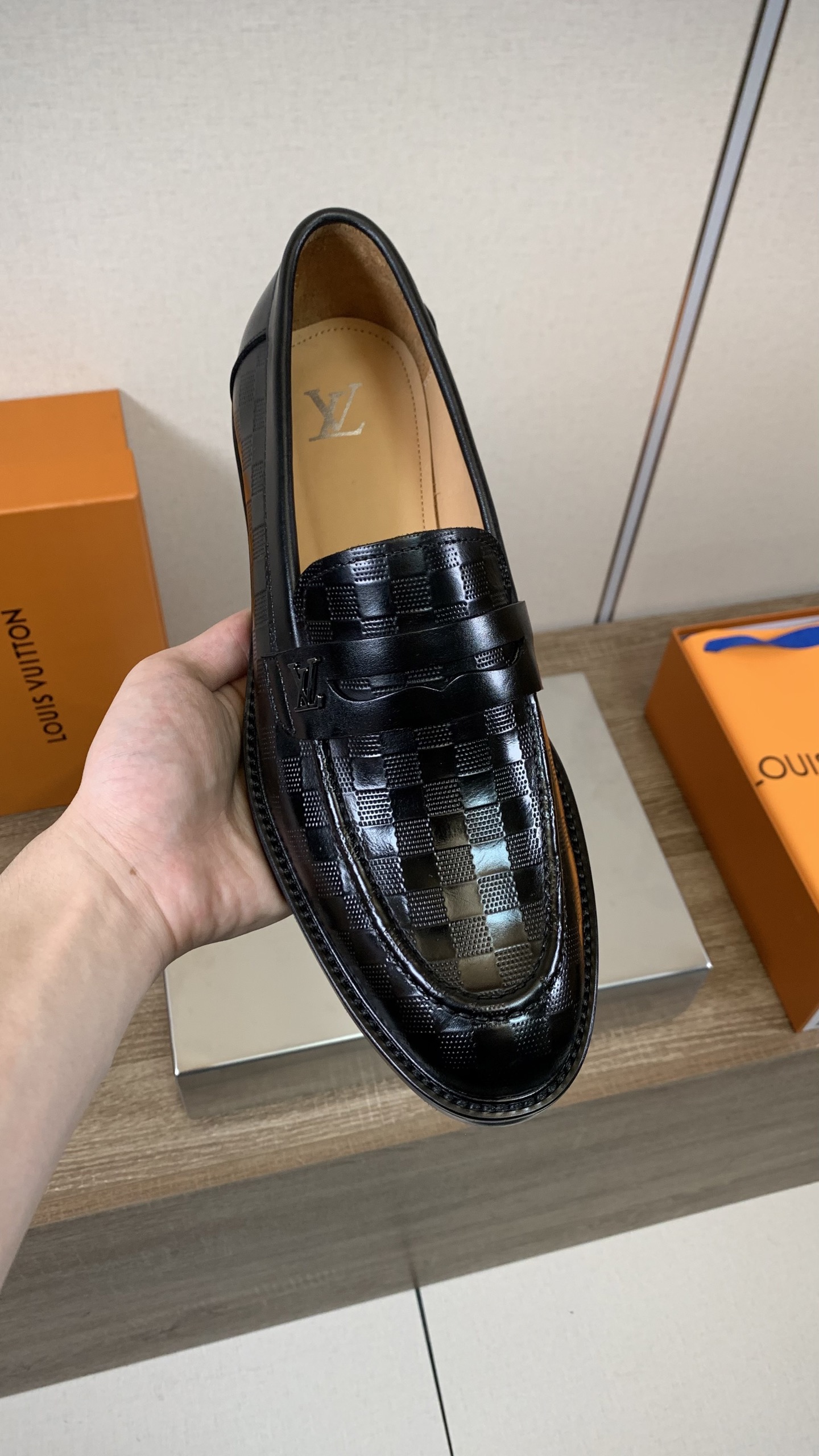 Elevate your style with these LV leather loafers. Featuring a classic checkered pattern and comfortable leather lining, perfect for business or casual wear.