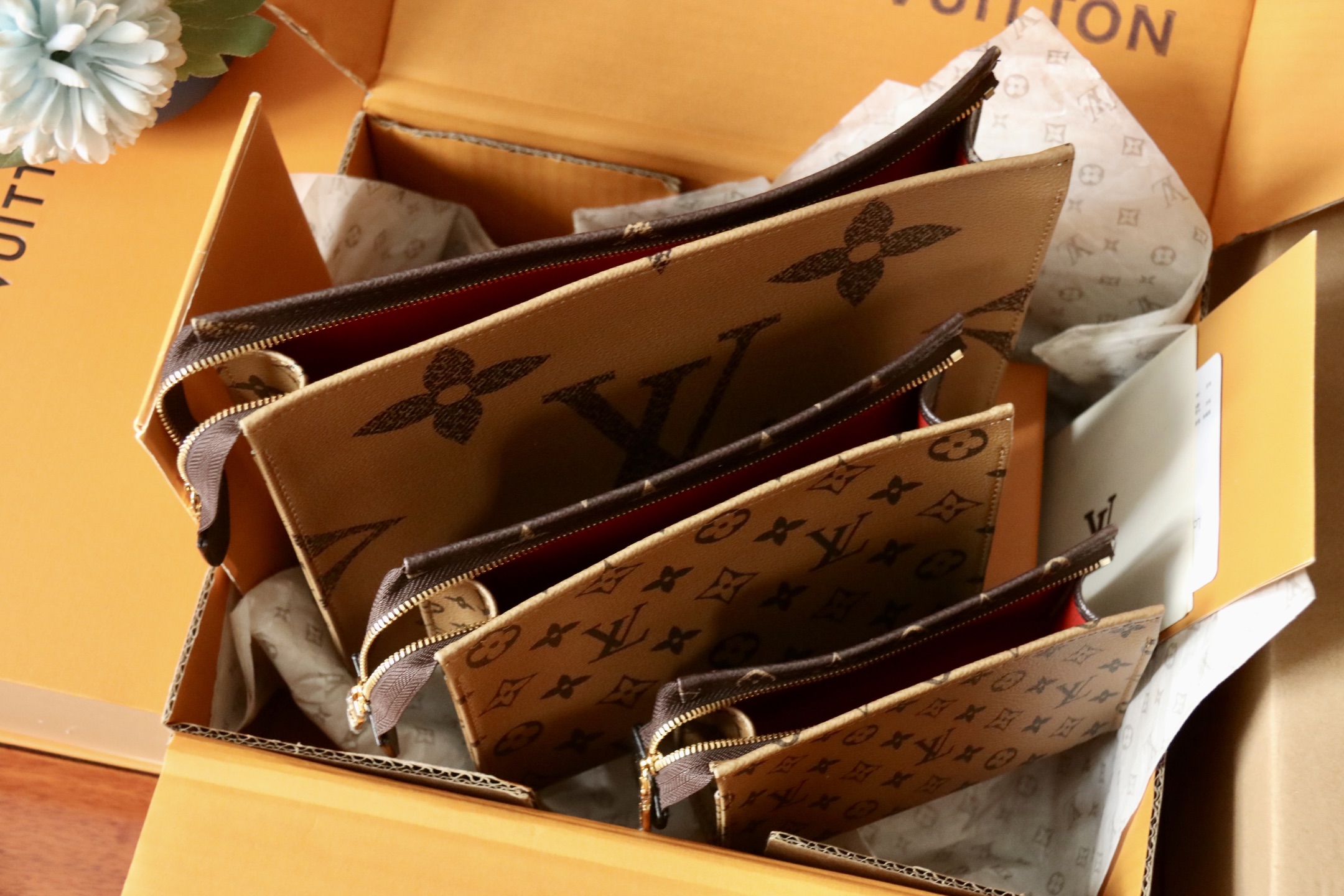 The Louis Vuitton Trio Pouch is a versatile collection featuring three pouches in different sizes, crafted from the iconic Monogram Reverse canvas. This set offers a stylish and practical solution for organizing your essentials, whether you're at home or on the go.
