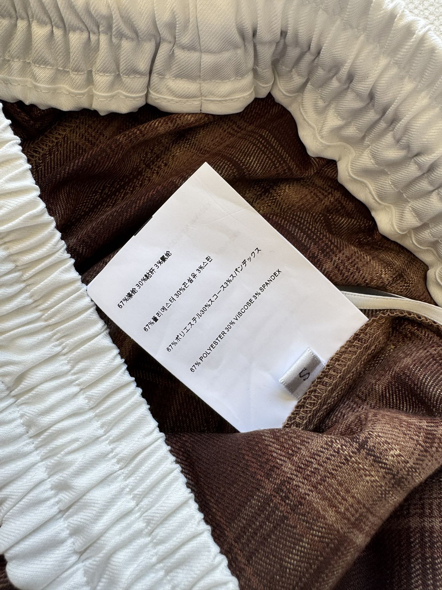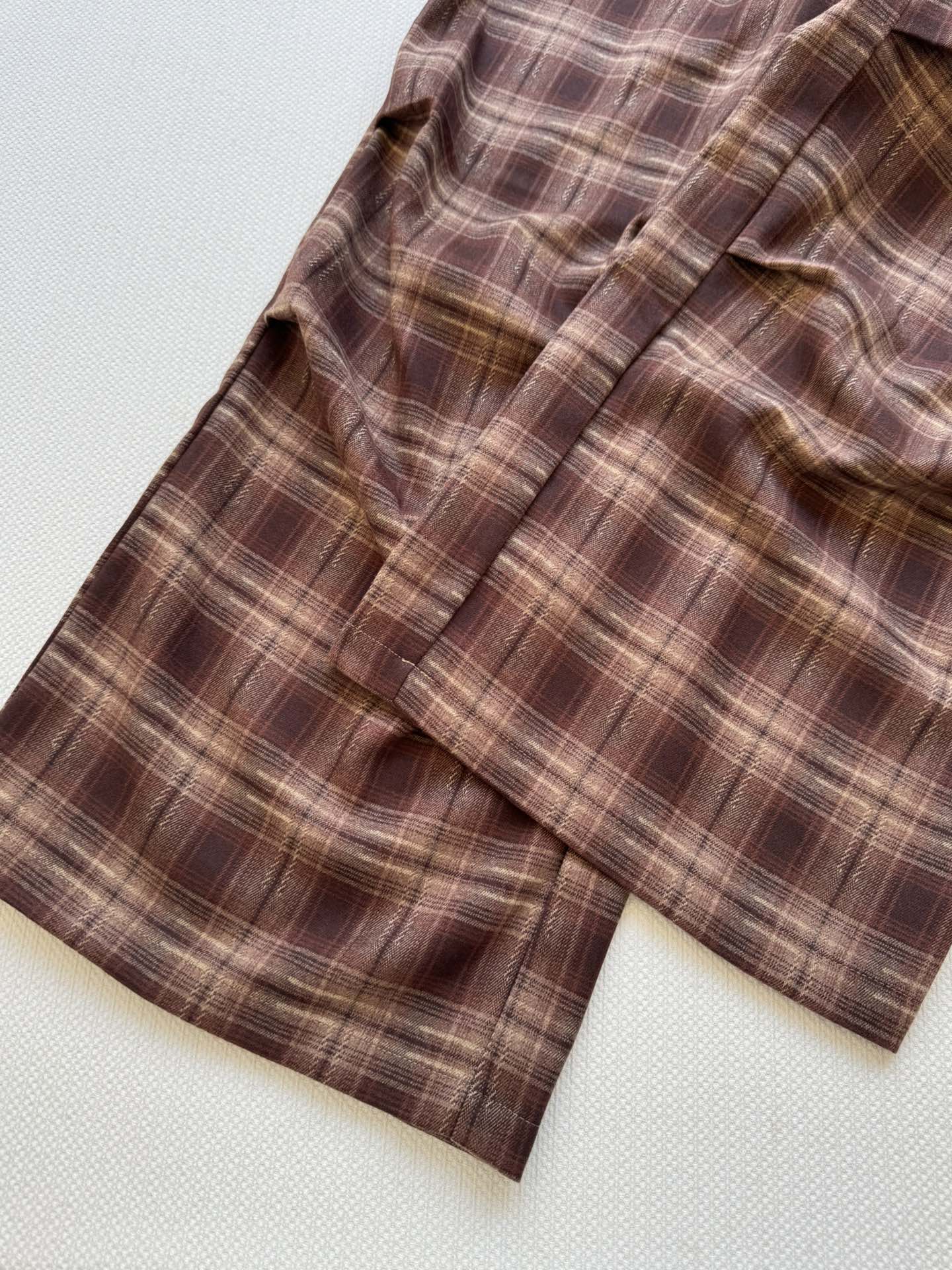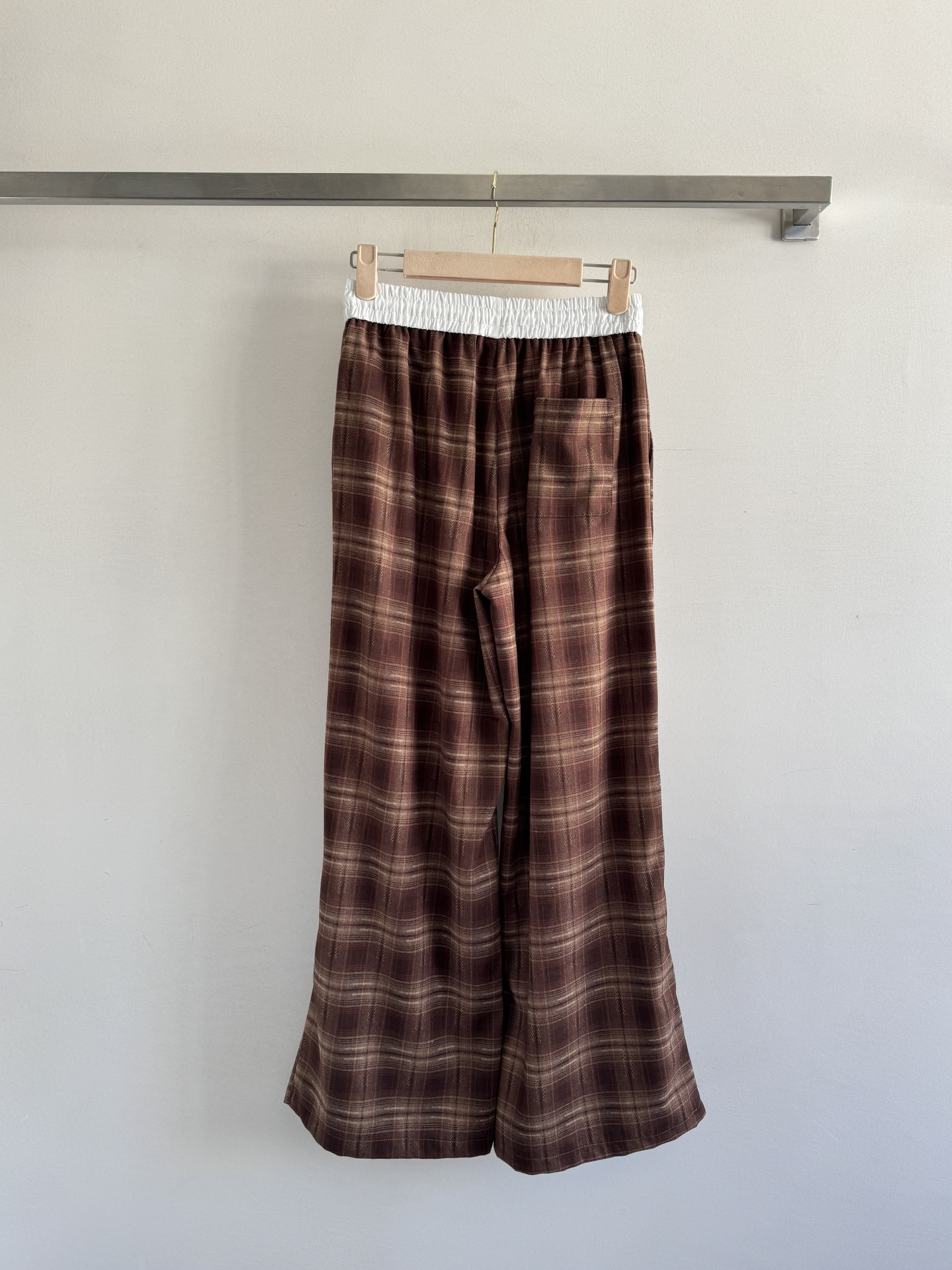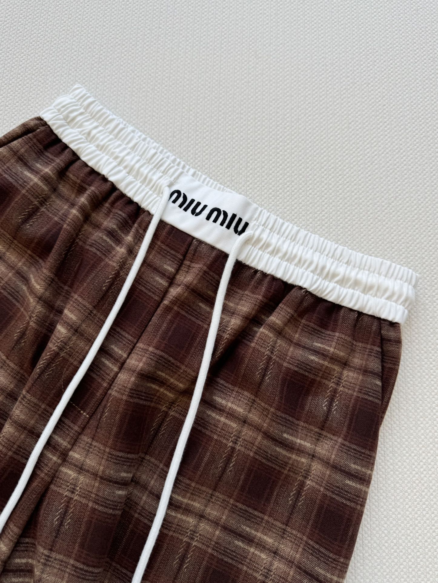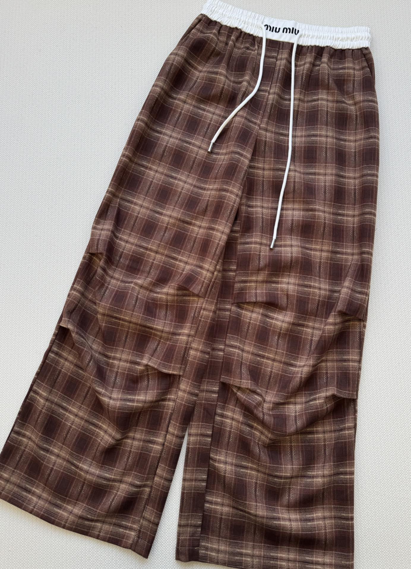 Tags: Brown Plaid Pants, Checkered Wide Leg Pants, Elastic Waistband Trousers, Lightweight Fabric Trousers, Miu Miu Style Pants, Pleated Design Pants