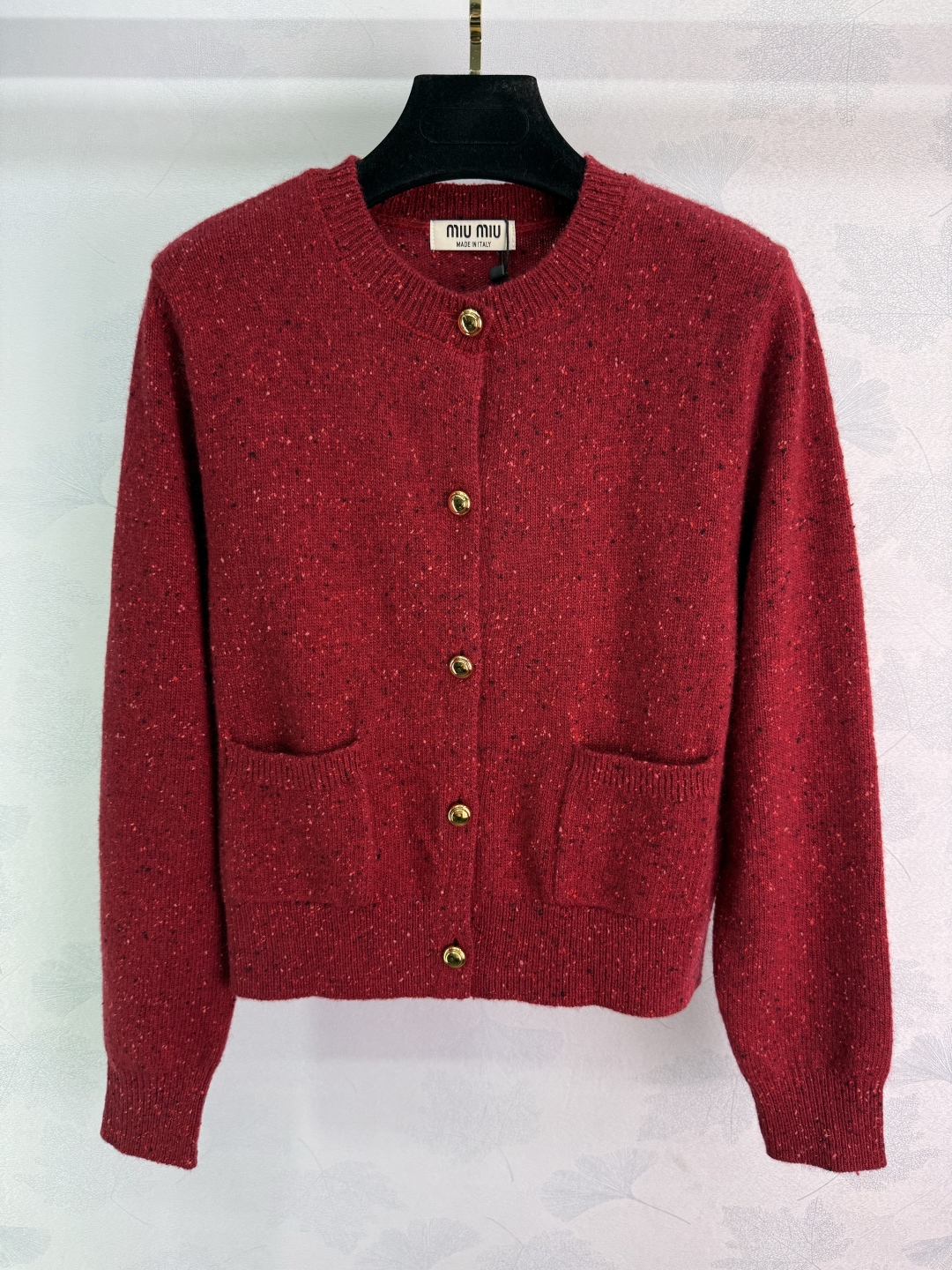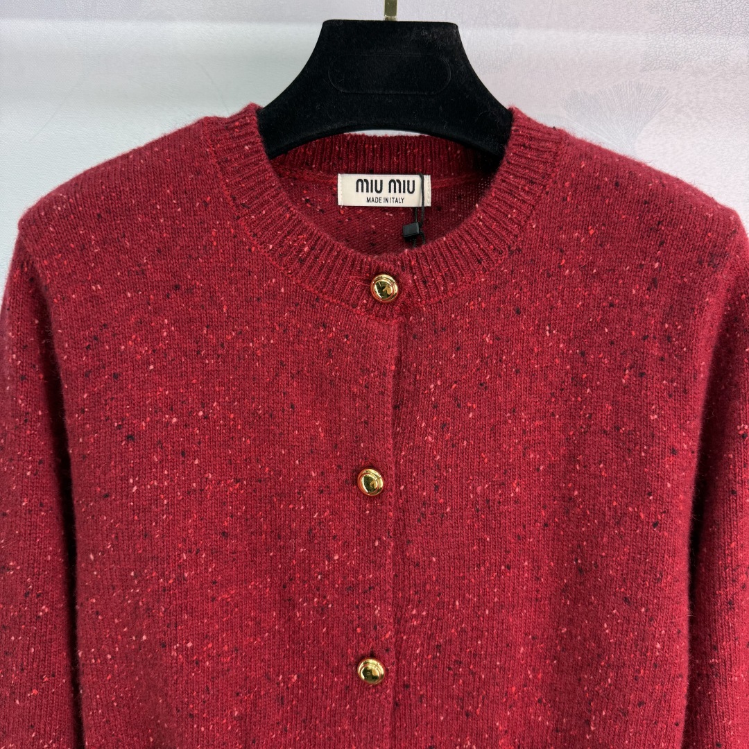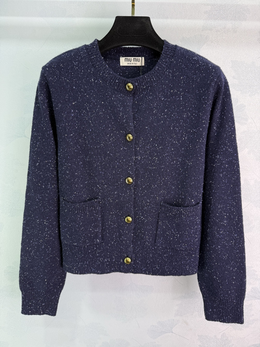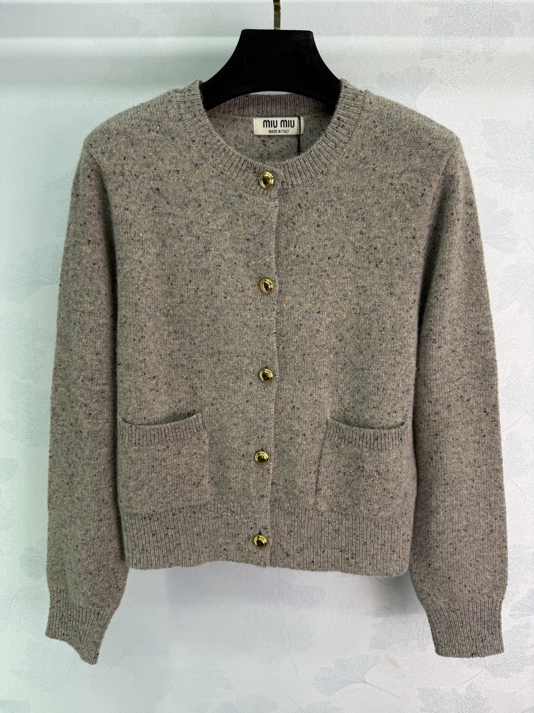 Elevate your style with this Miu Miu wool-cashmere cardigan. Soft, comfortable, and chic, it features a round neck, long sleeves, and elegant gold buttons.