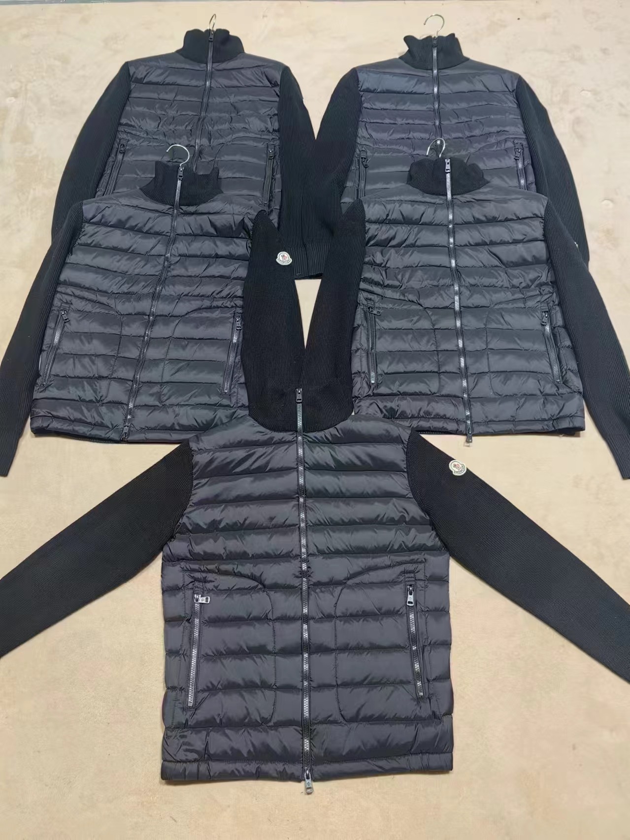 Stay warm and stylish with this Moncler men's jacket. Features a high neck, down-filled body, and knit sleeves for ultimate comfort and style.