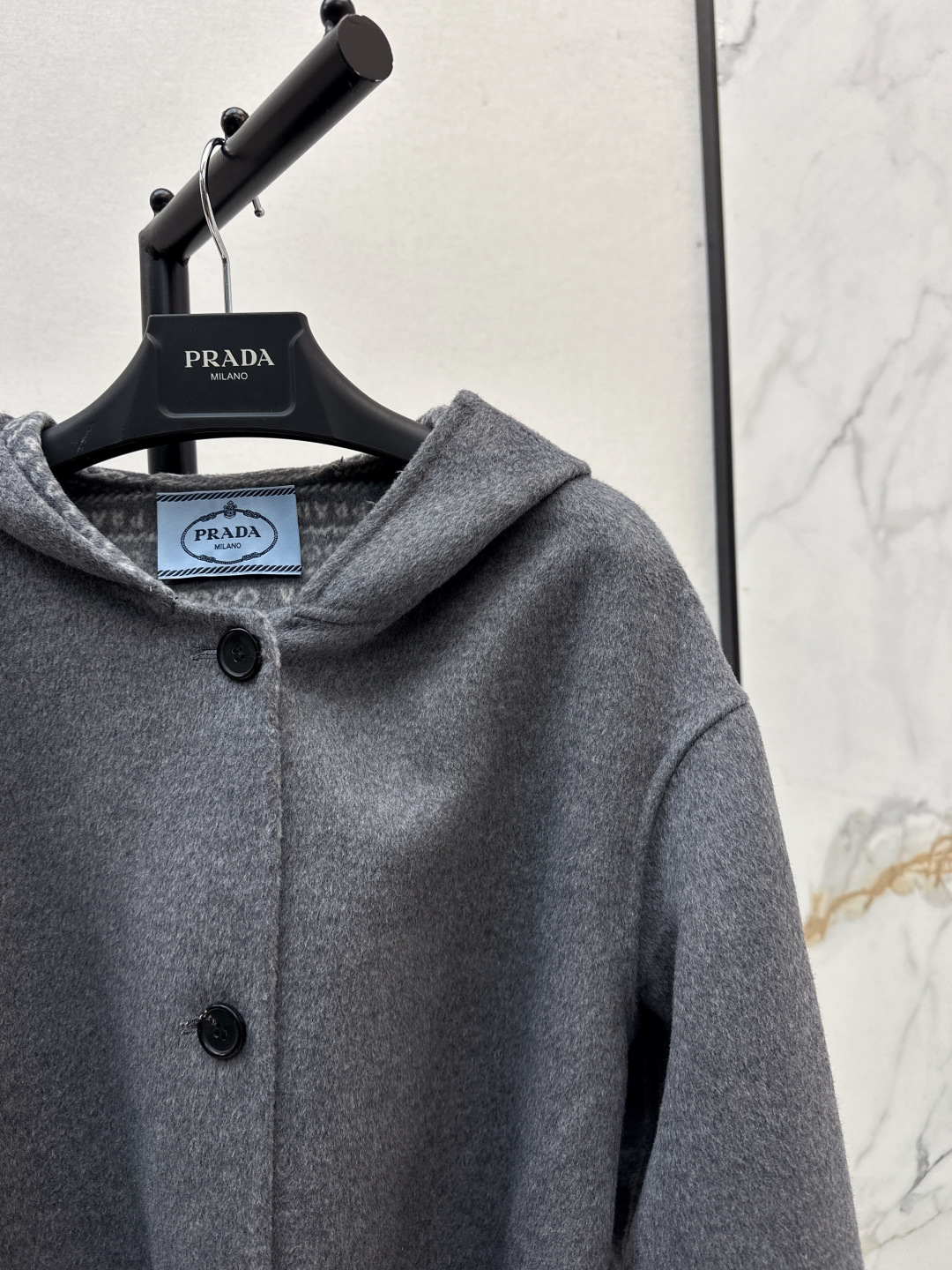 Tags: Belted Coat, Elegant Coat, Gray Coat, Hooded Coat, Prada Coat, Wool Coat