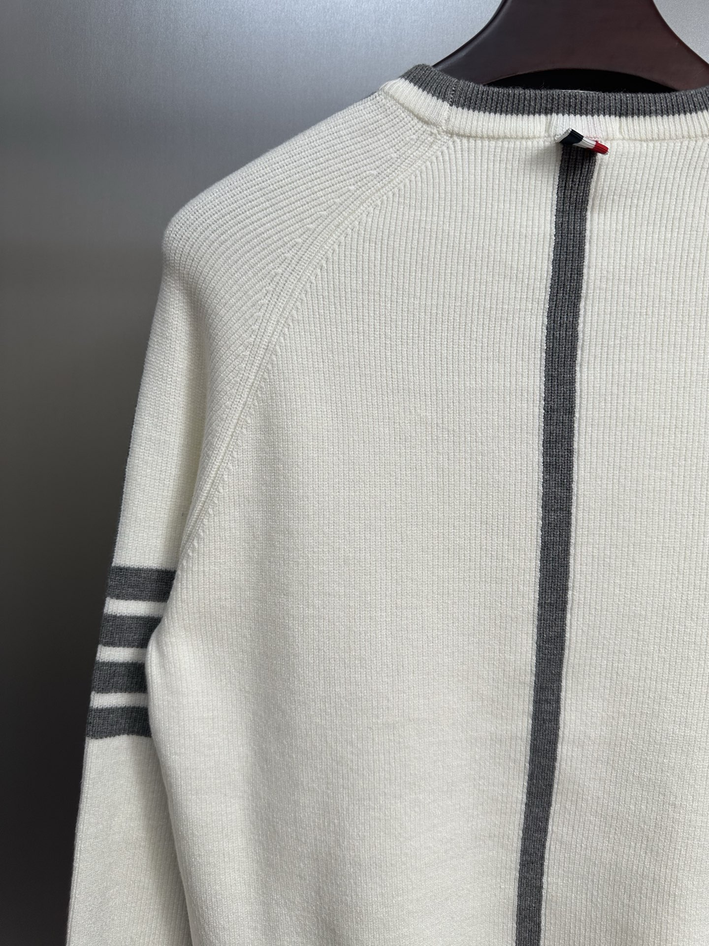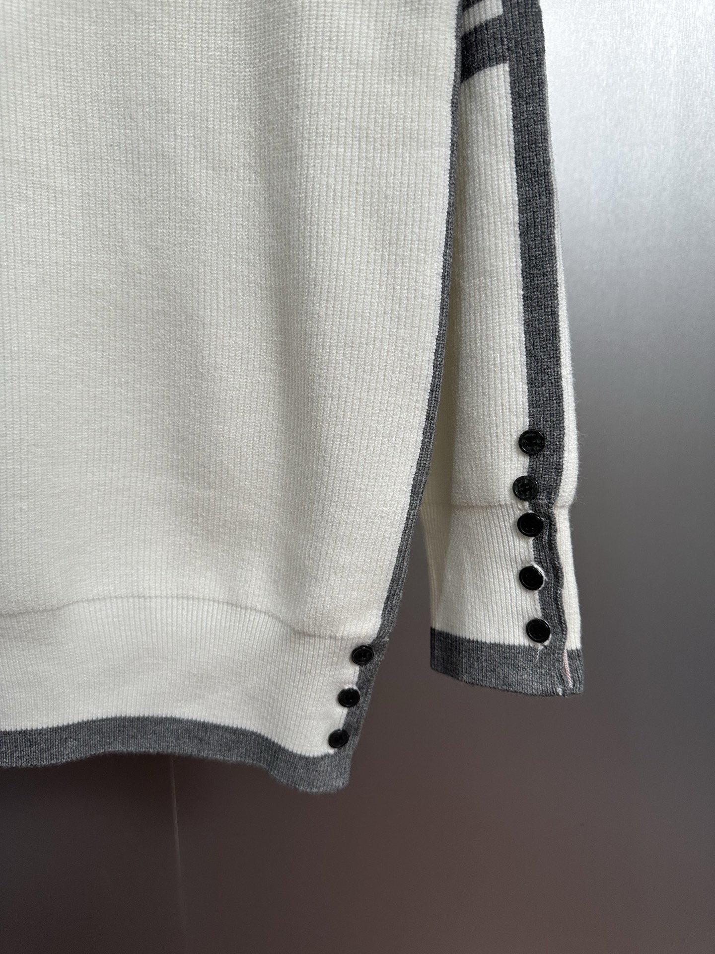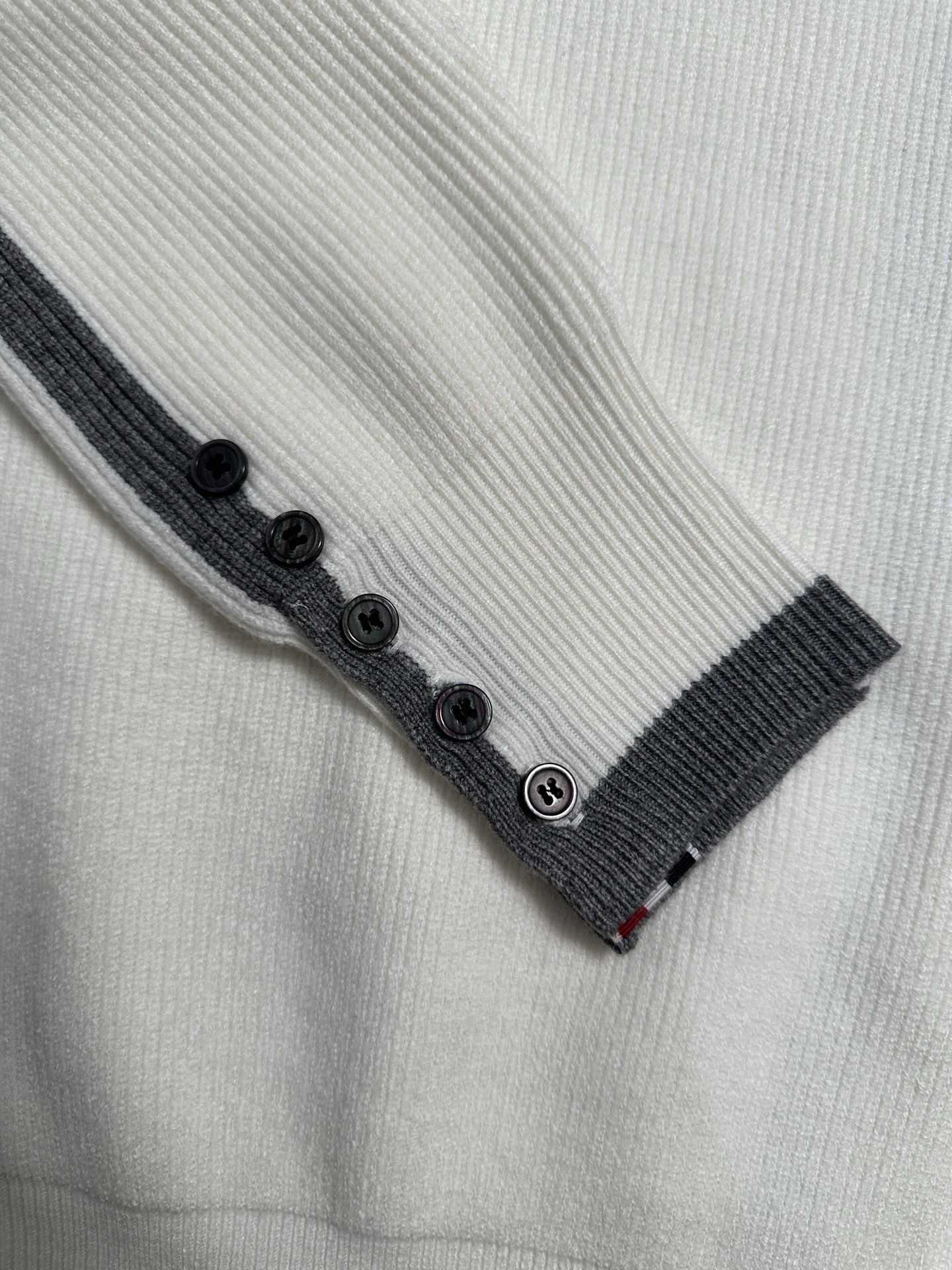 The Thom Browne sweater is a great addition to my wardrobe. I love the way it looks and feels. The striped detail on the sleeve is a nice touch.