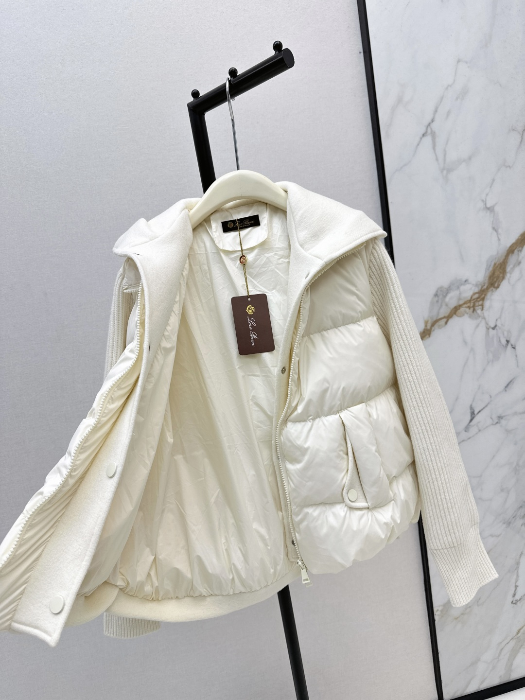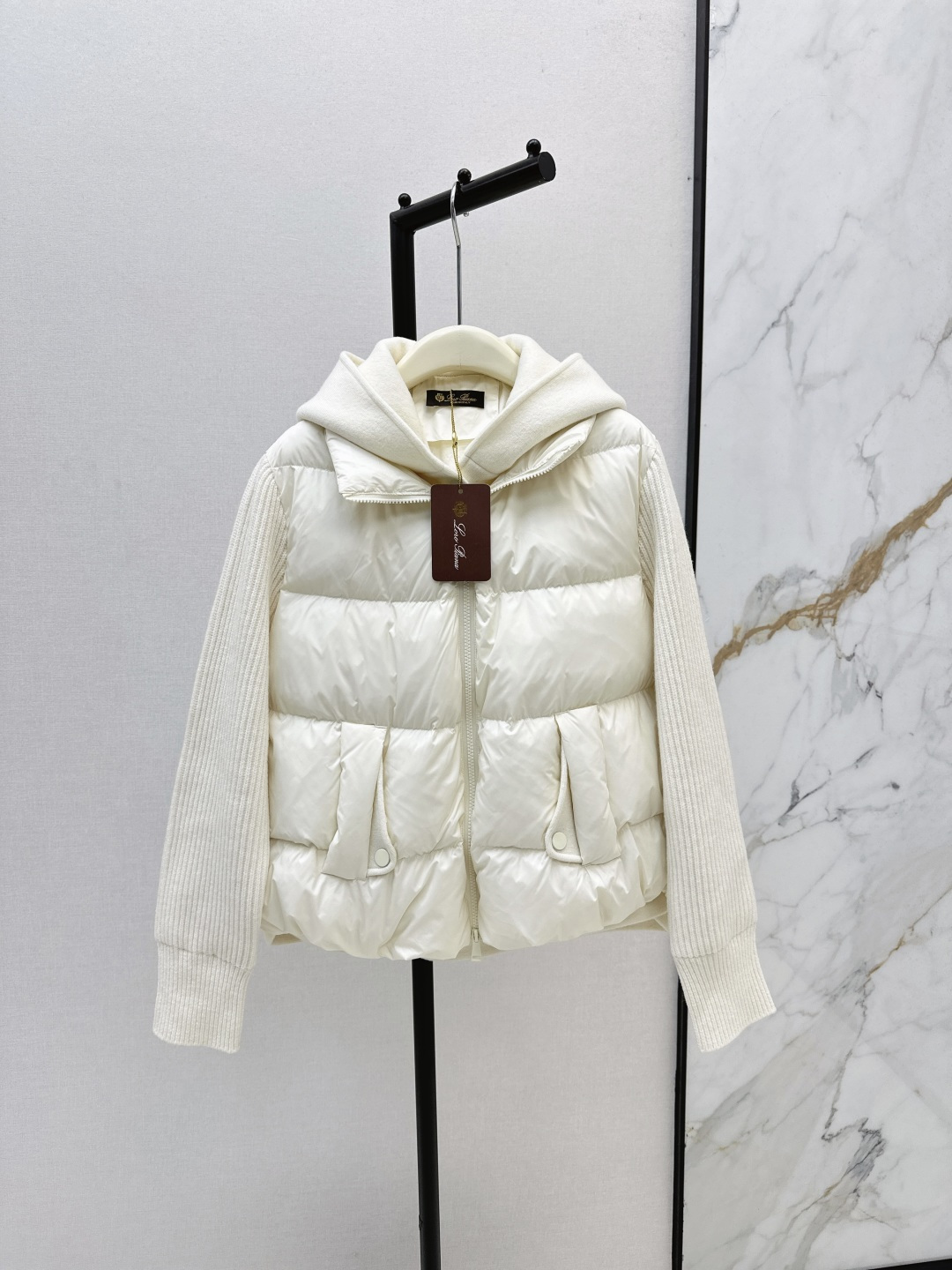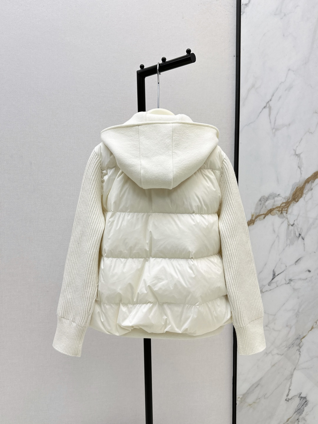 Tags: Designer Winter Coat, Hooded Down Coat, Knit Panel Jacket, Recycled Nylon Puffer, Women's Fashion Puffer, Wool Sleeve Puffer Jacket